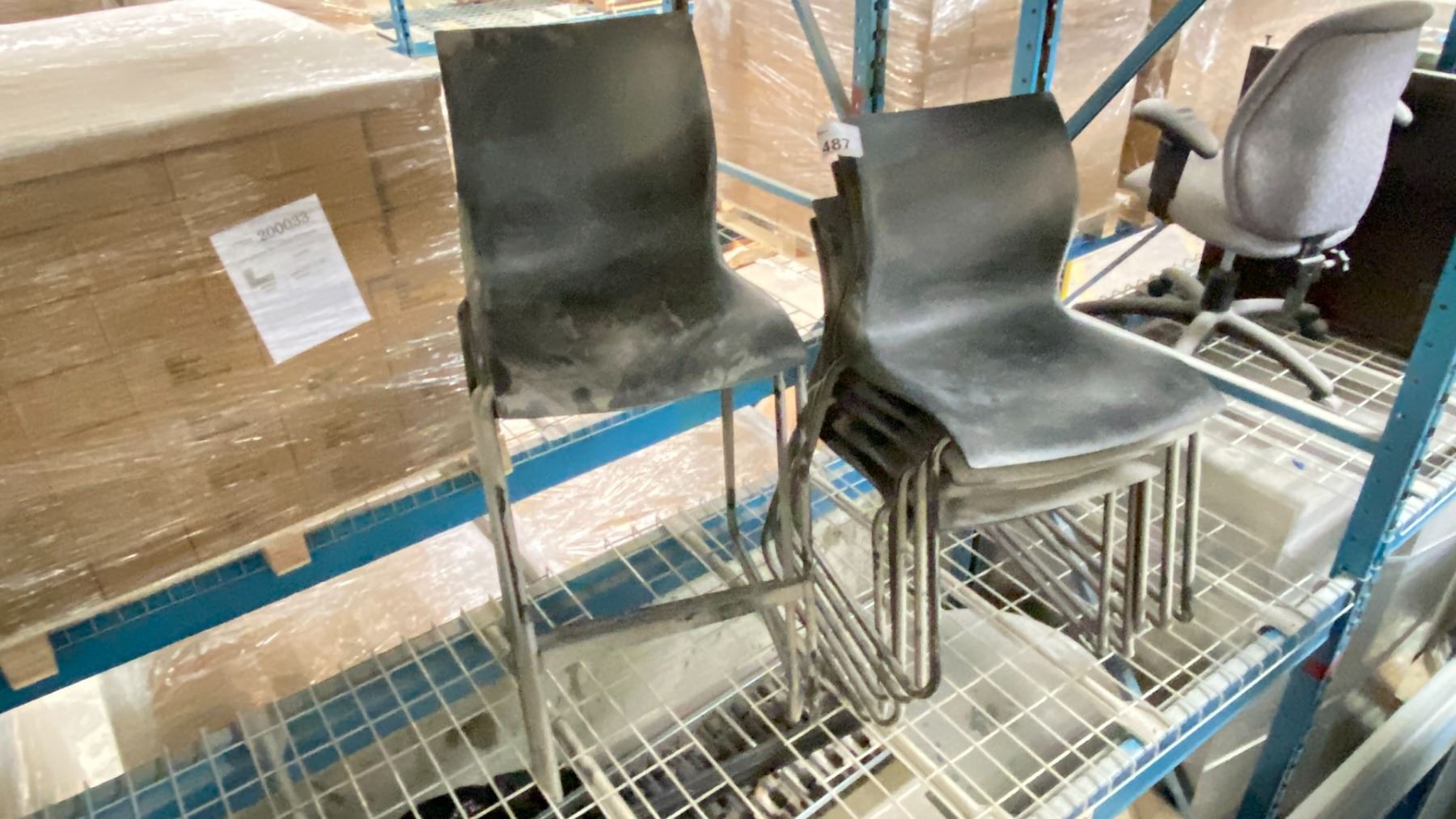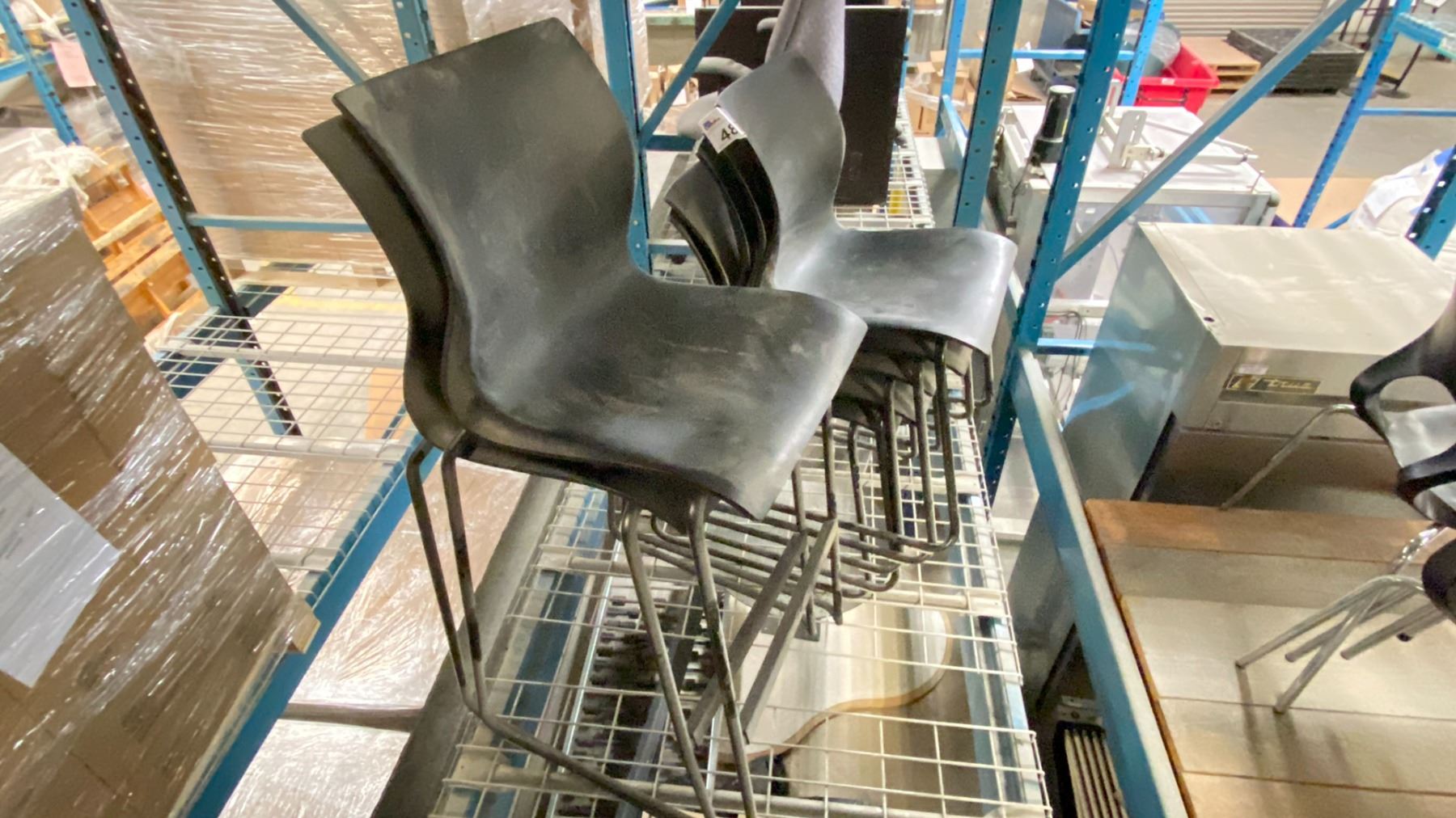 GROUP OF 7 TEKNION STACKING CHAIRS, 2 ARE TALL. LOCATED IN RACKING NEAR HEAT SEALER