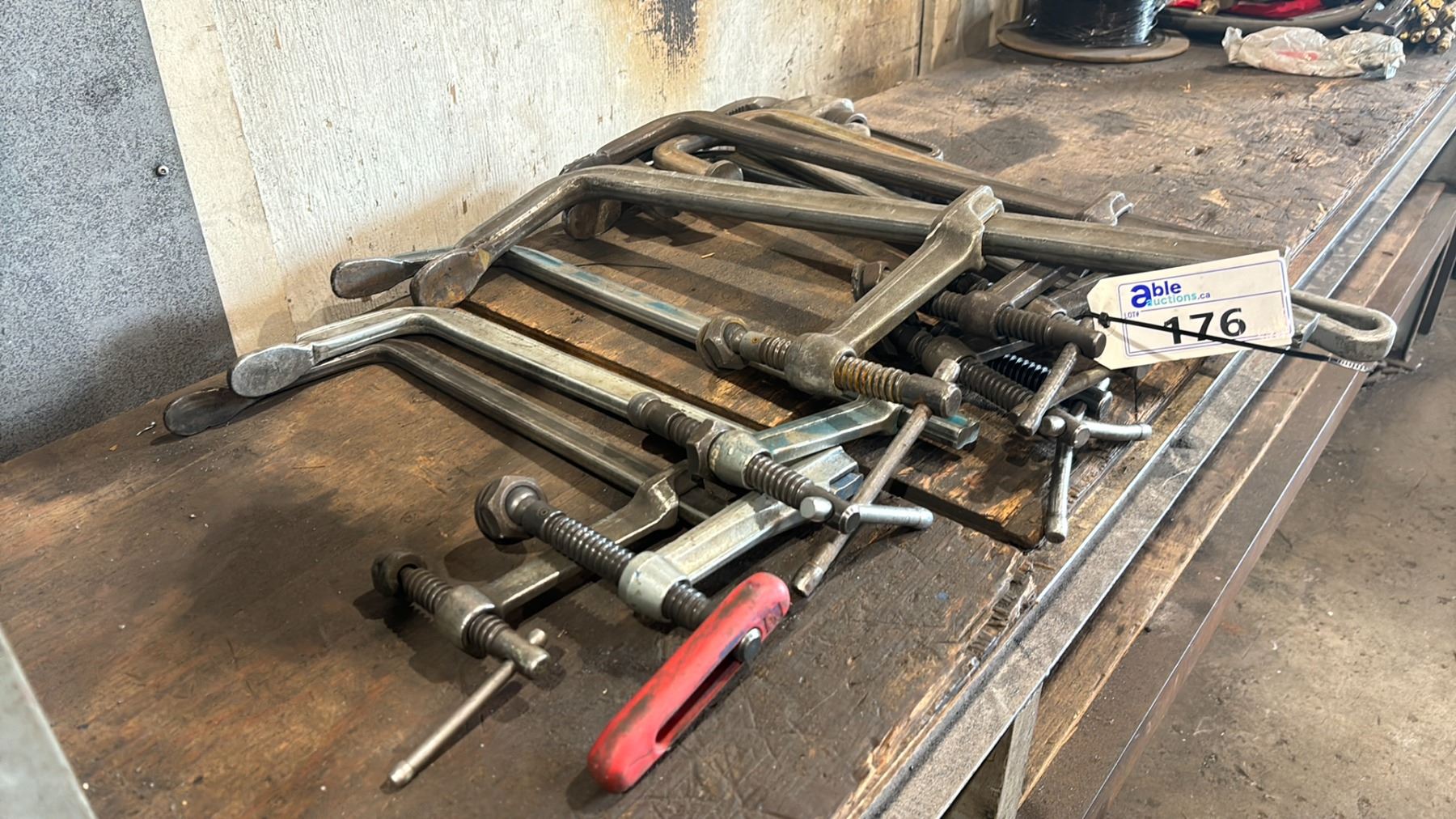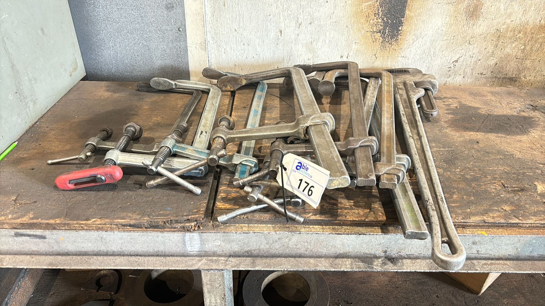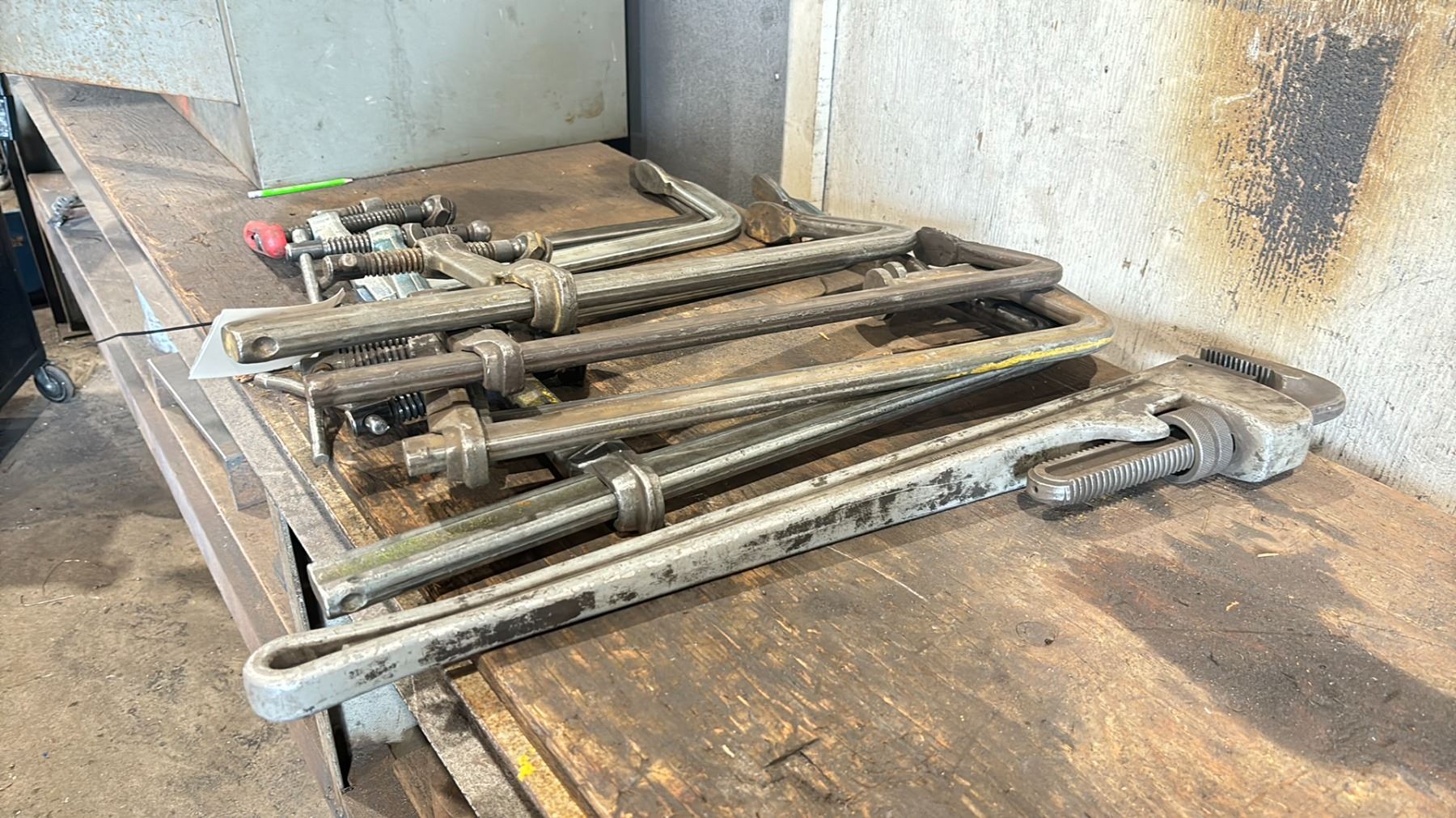 GROUP OF 8 LARGE HEAVY DUTY STEEL C-CLAMPS & POWER FIST 36" ALUMINIUM PIPE WRENCH