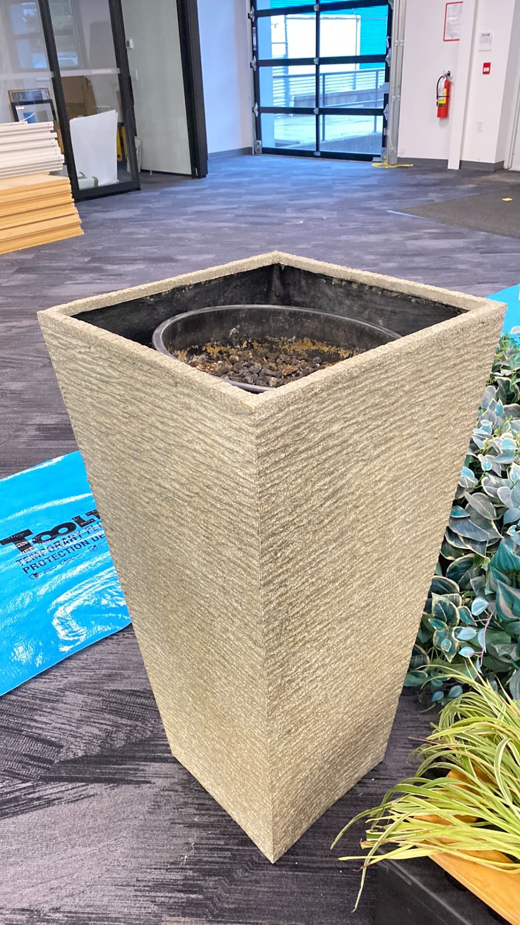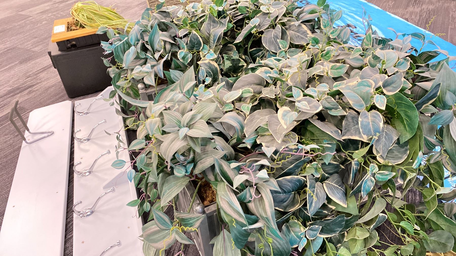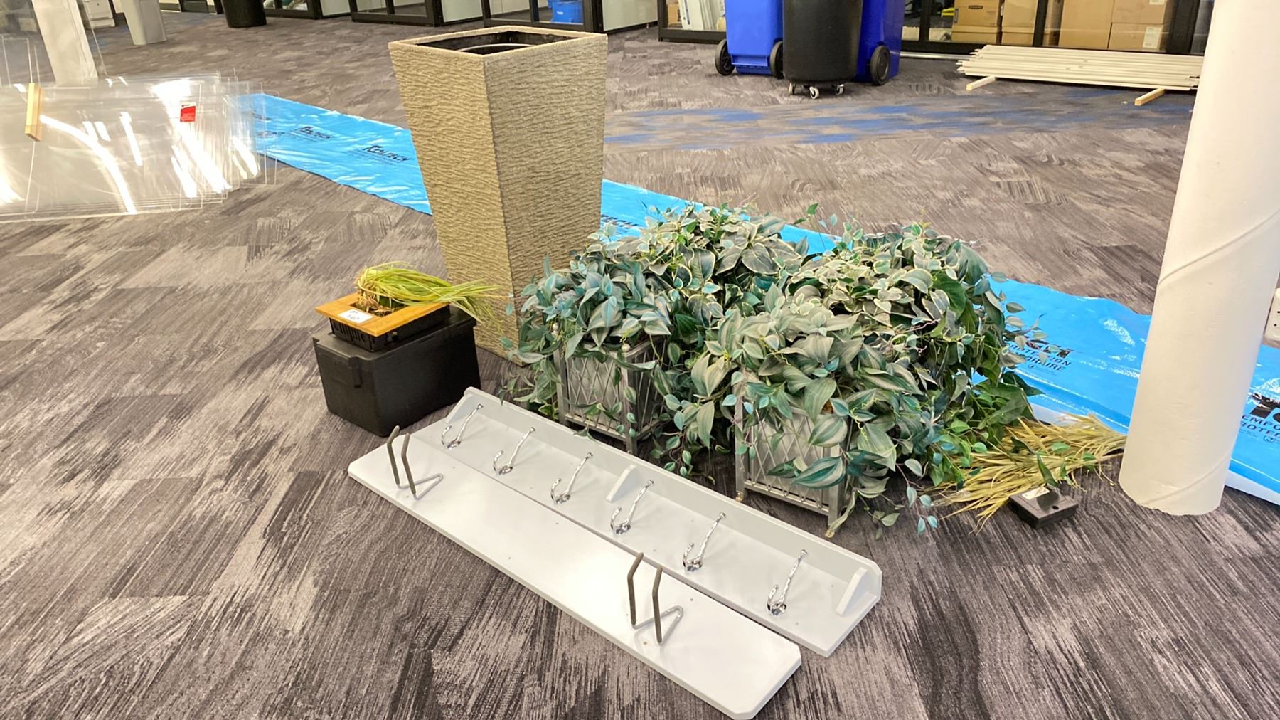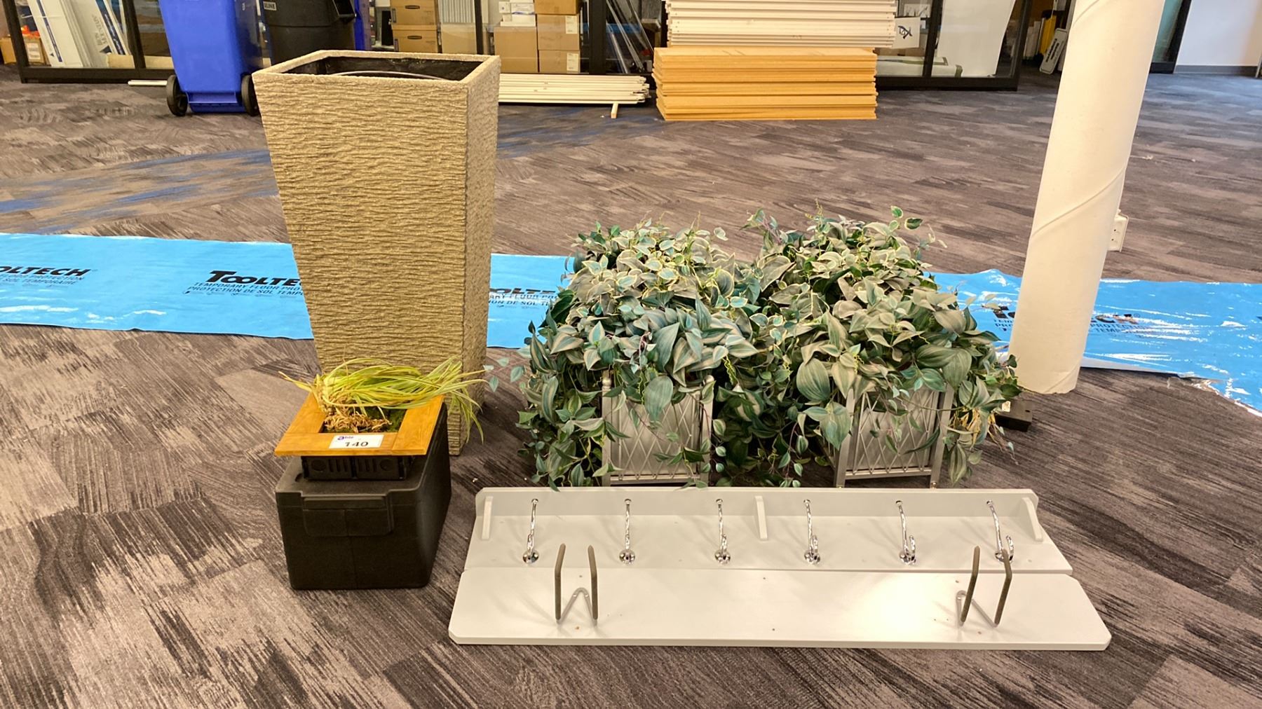GROUP OF ARTIFICIAL PLANTS. PLANTERS, AND COAT RACKS