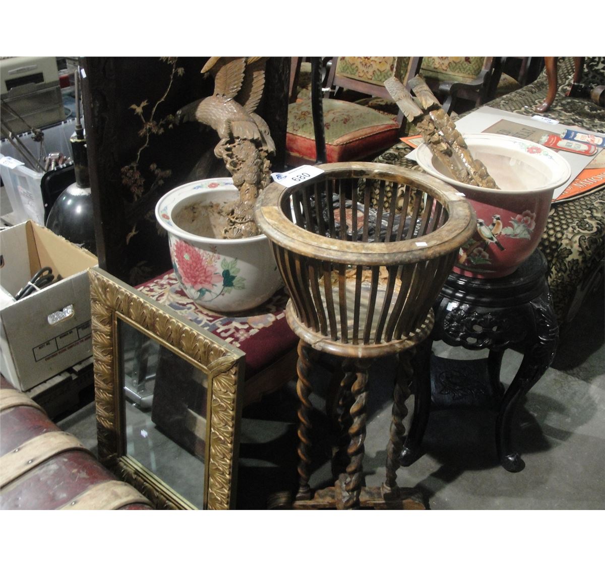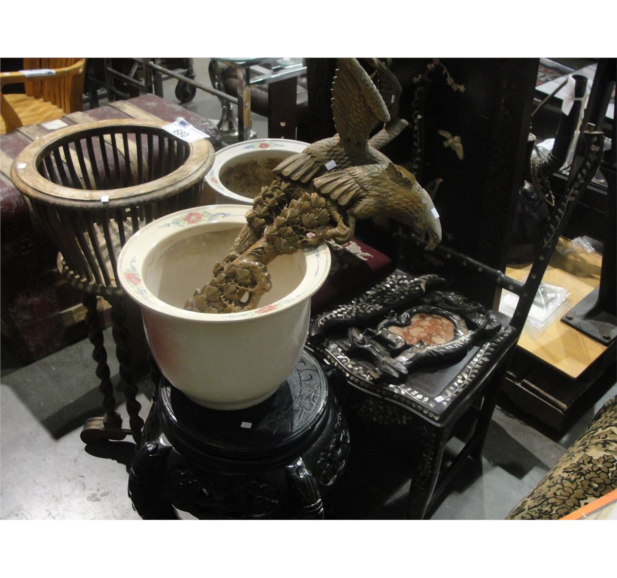 GROUP OF ASSORTED DECORATIVE HOUSEHOLD ITEMS; ORIENTAL CARVED PANEL, CARVED BIRD OF PREY, FERN STAND, PLANT STAND, PLANTERS, FOOTSTOOL, ETC