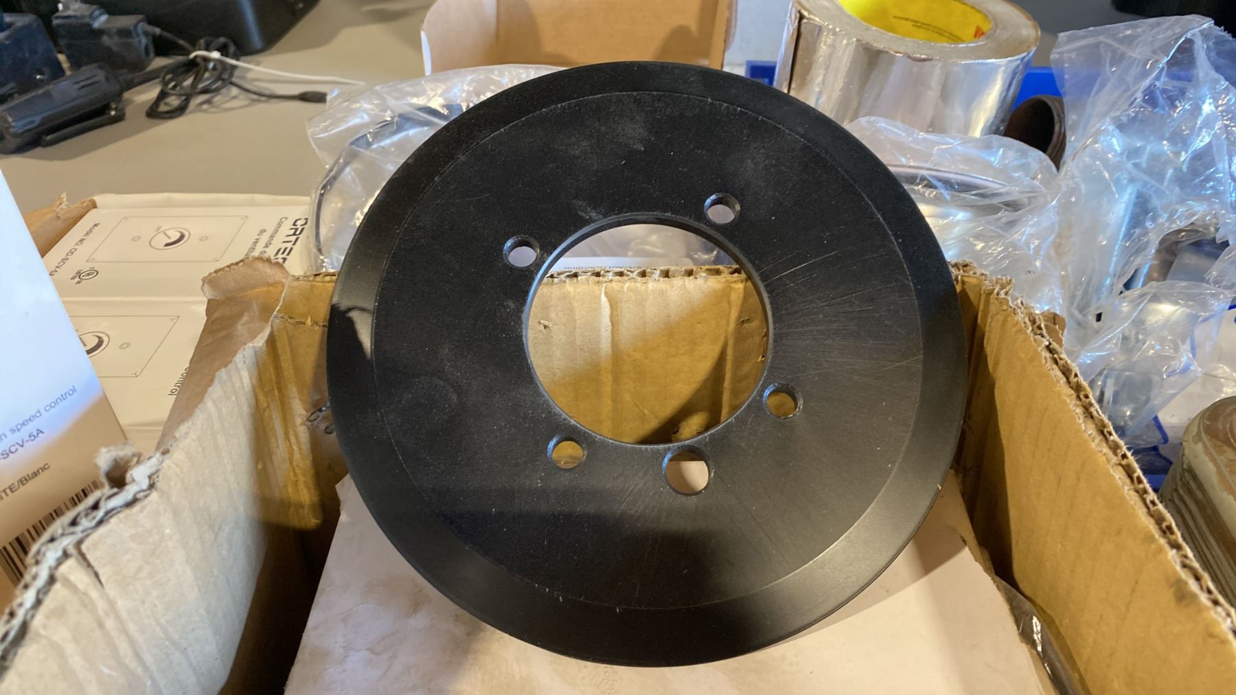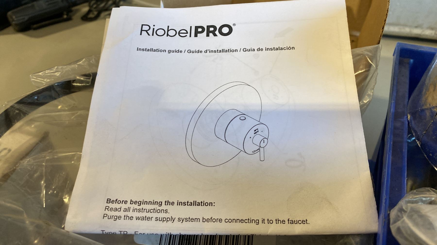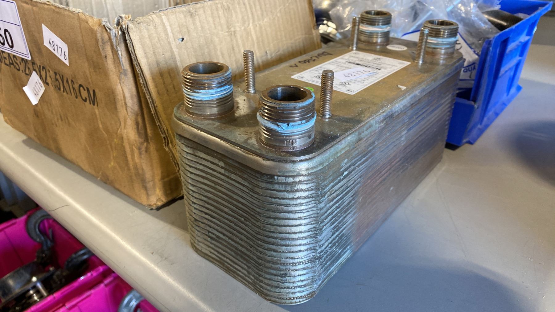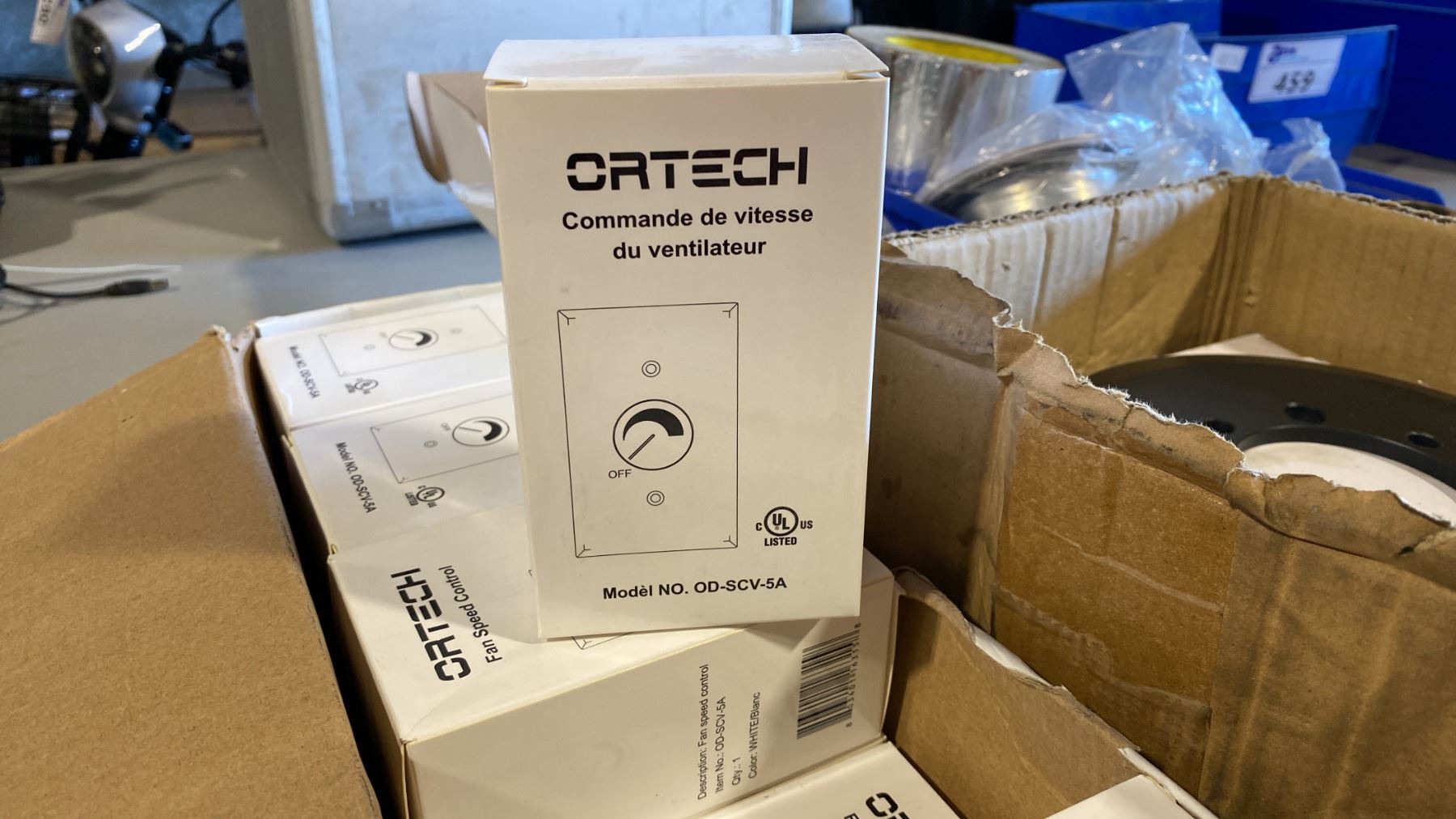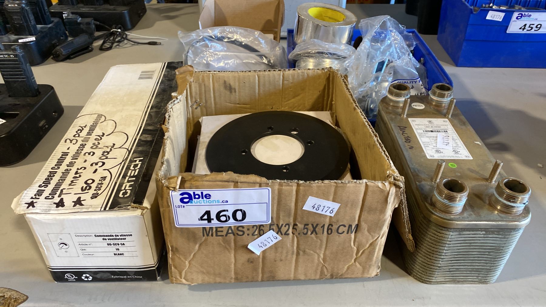 GROUP OF ASSORTED ELECTRICAL/PLUMBING FIXTURES- BOX OF ORTECH FAN SPEED CONTROLS, BRAZED PLATE HEAT EXCHANGER, RIOBEL PRO GARN KIT & PLUMBING HARDWARE