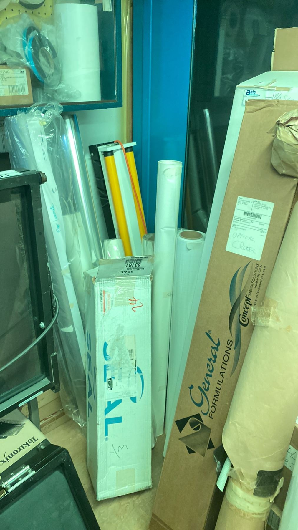 GROUP OF ASSORTED STOCKS, POLYWRAP, DOUBLE SIDED TAPE, AND LET-R-EDGE * LOCATED UPSTAIRS *