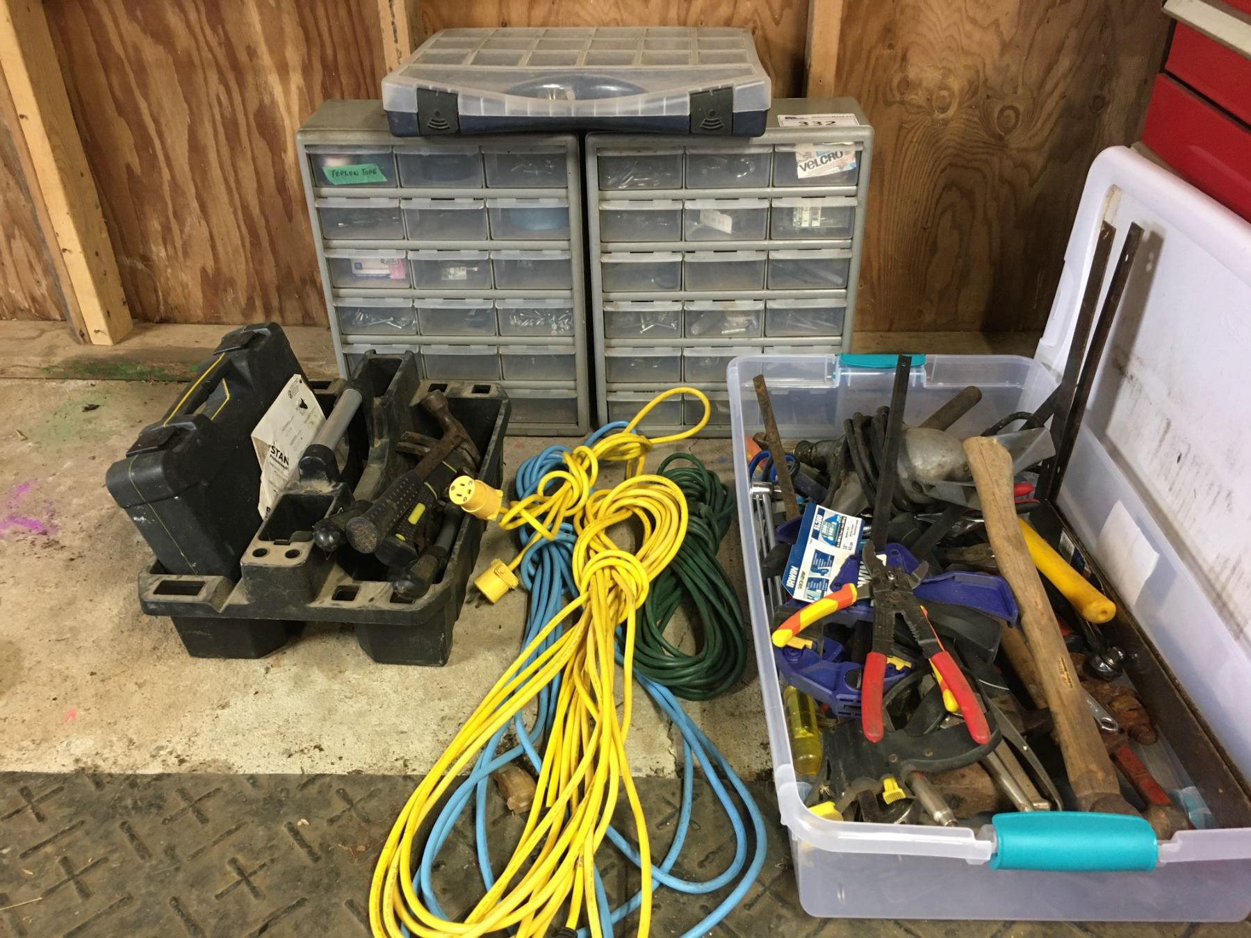 GROUP OF ASSORTED TOOLS/EXTENSION CORDS/PARTS CABINETS W/CONTENTS, ETC
