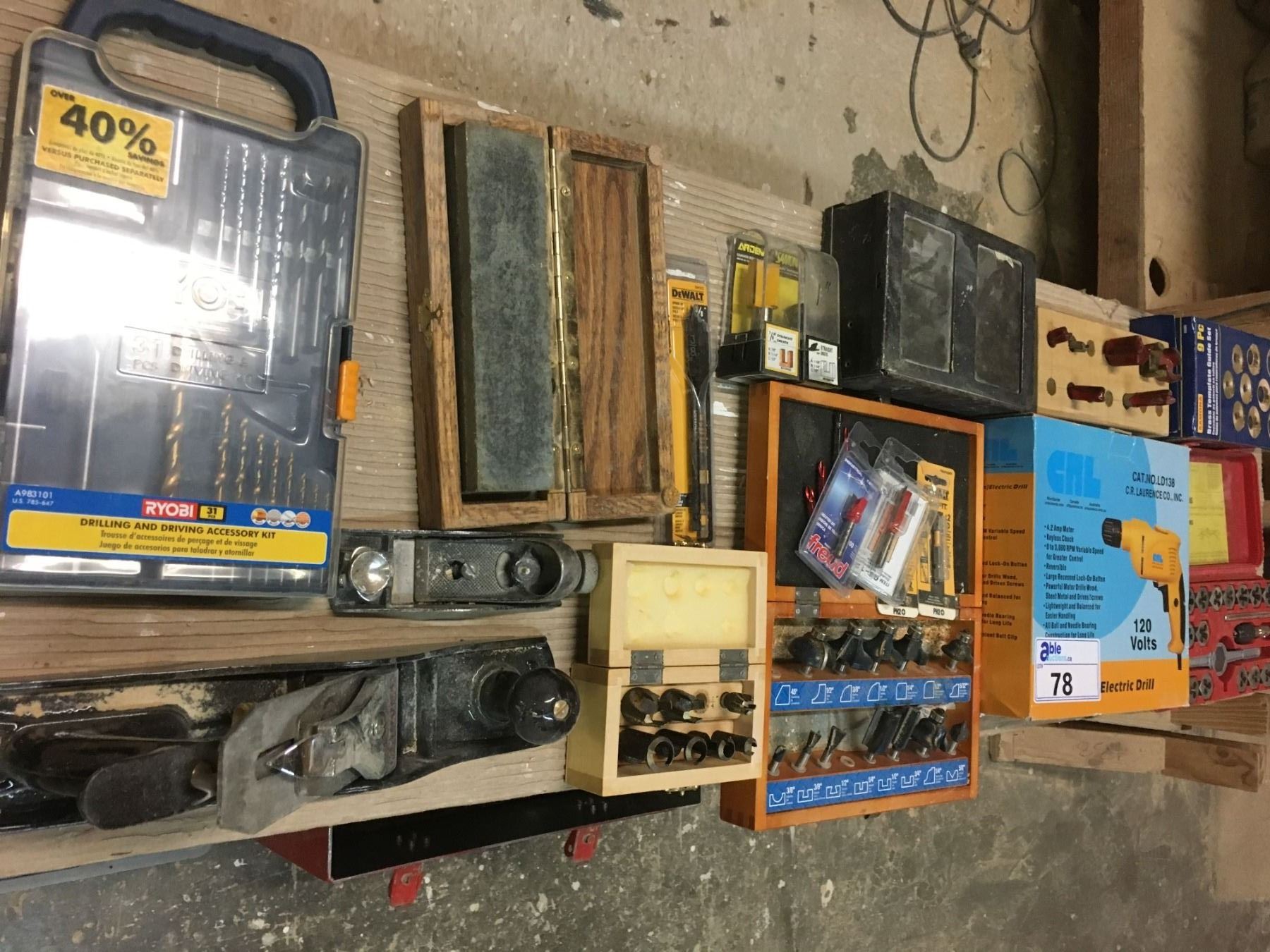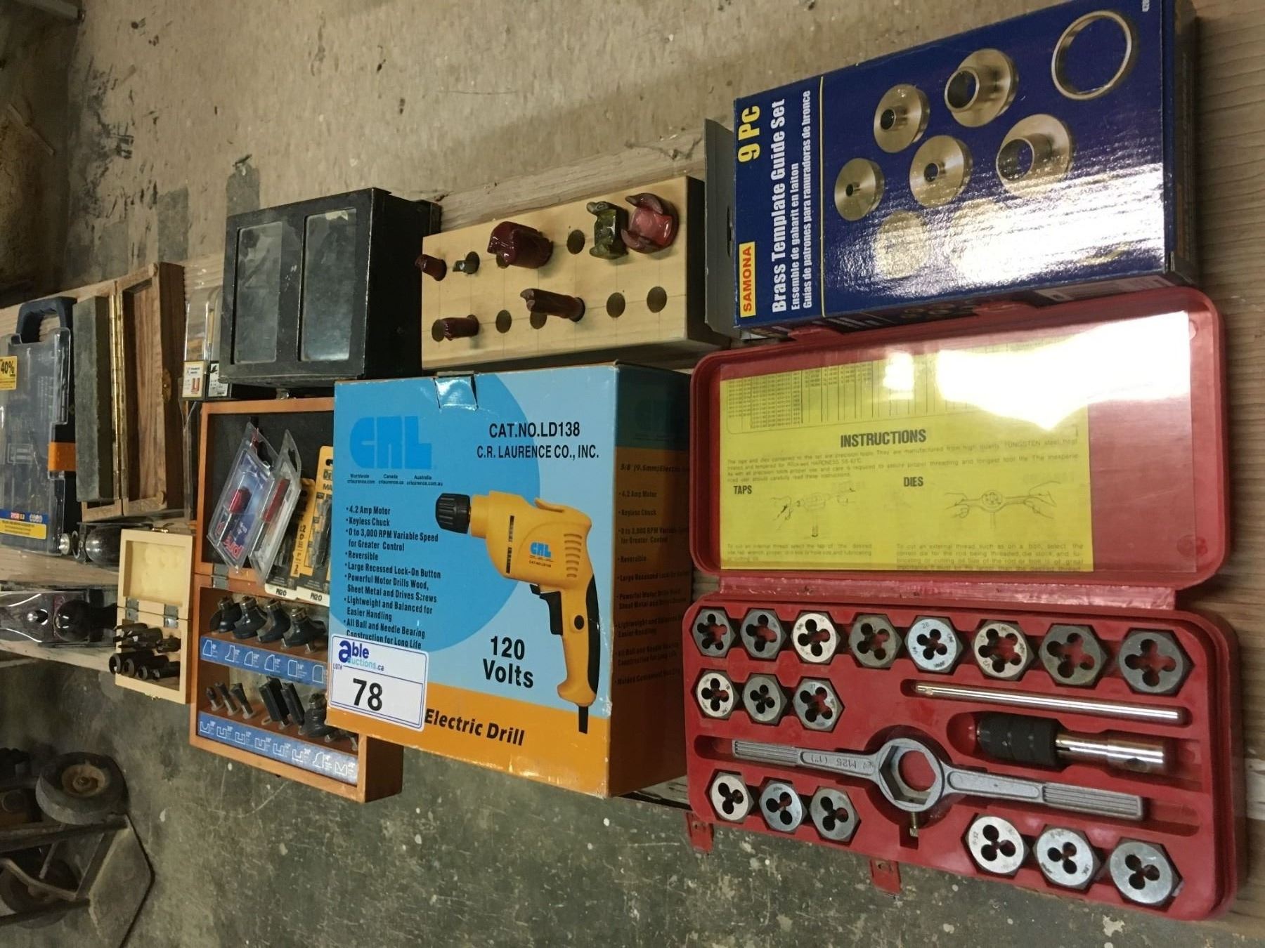 GROUP OF ASSORTED TOOLS, ROUTER BITS, DRILL BITS, TAP & DIE SET, ETC