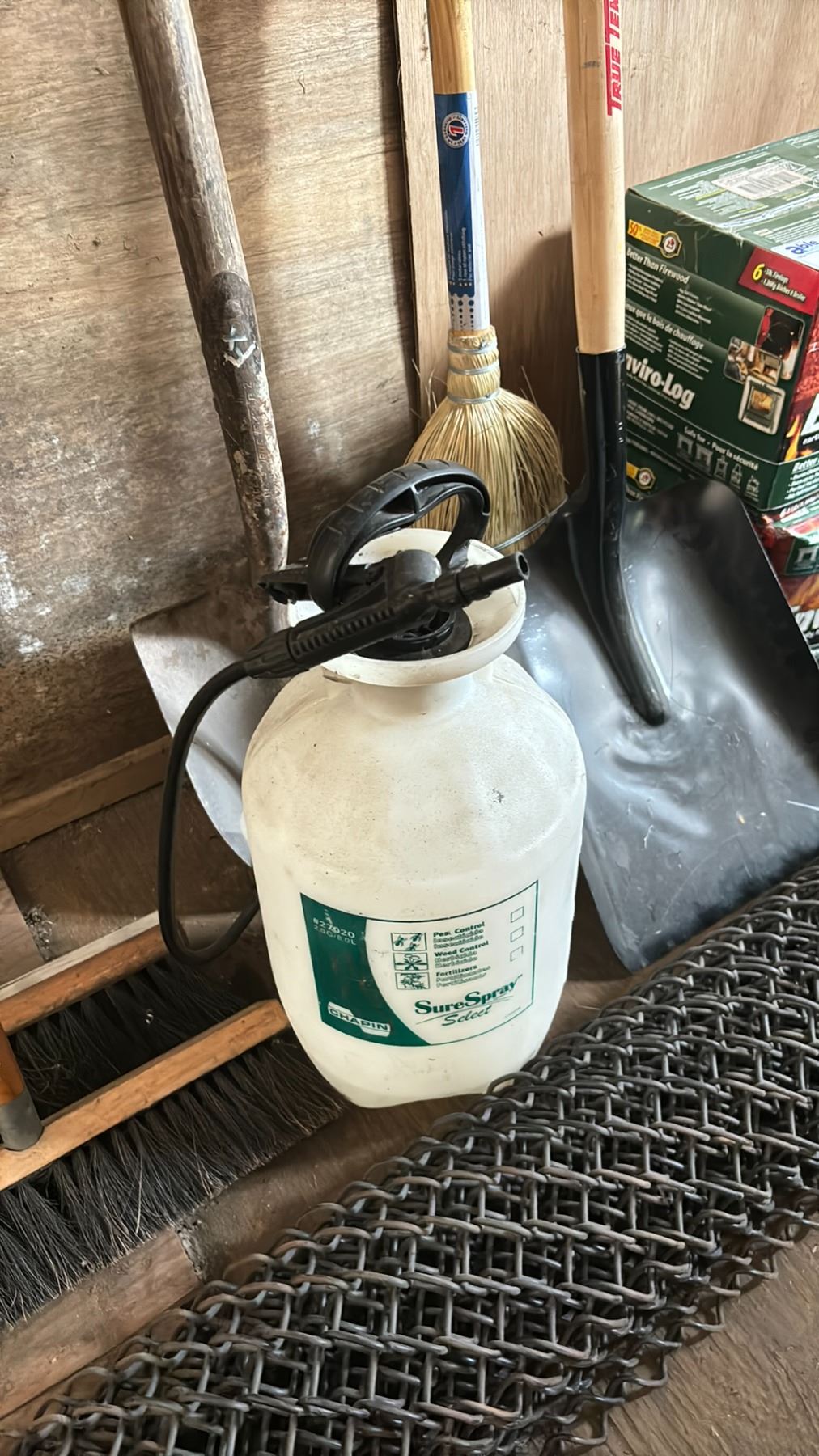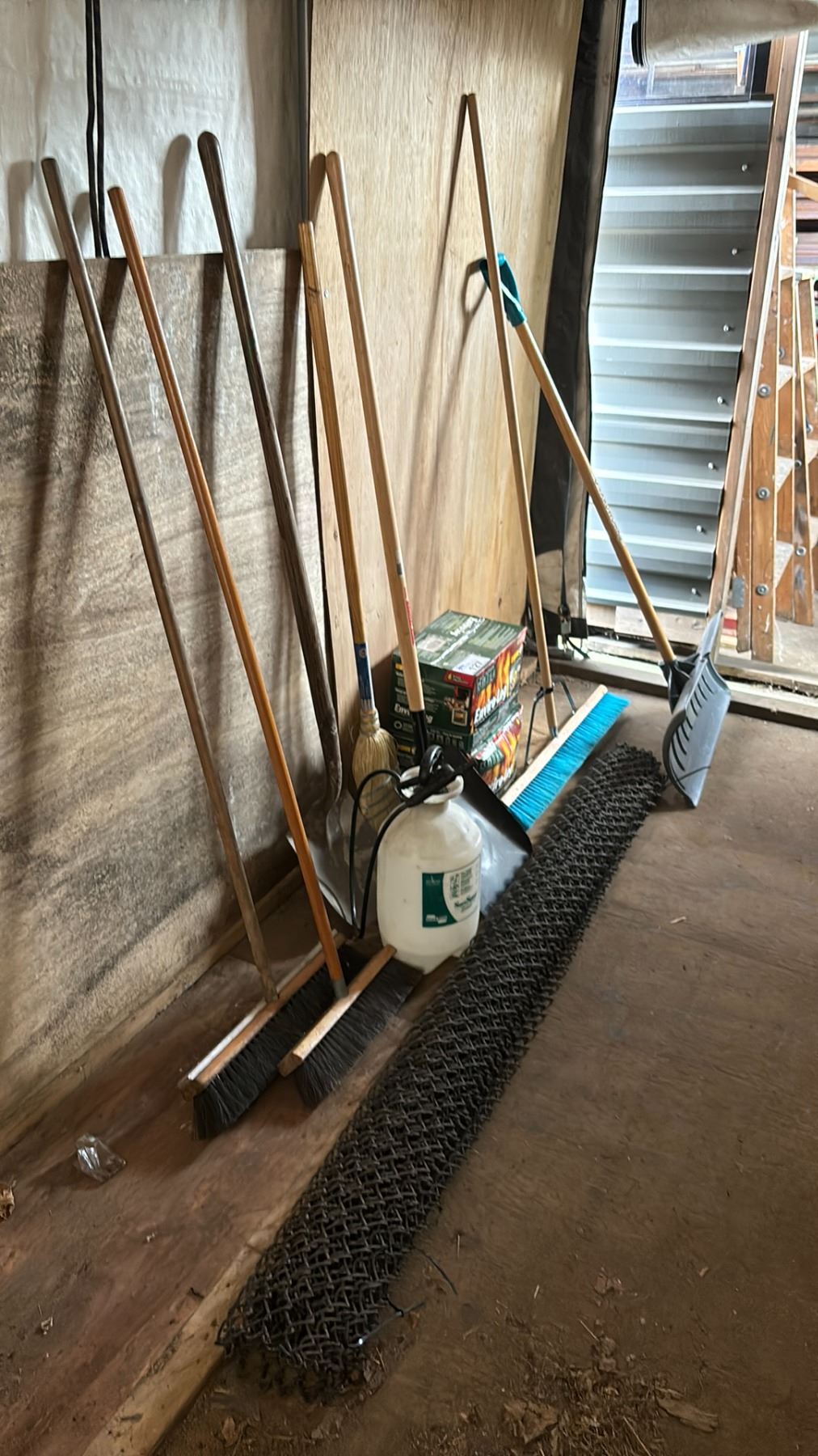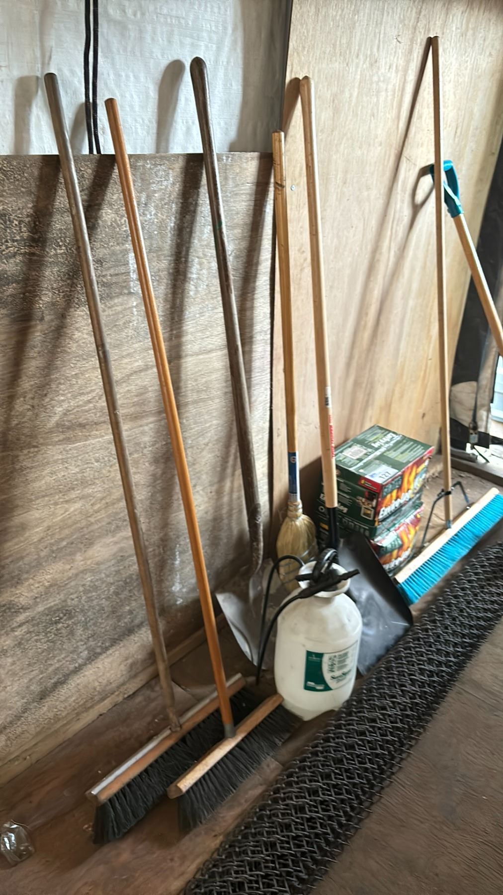 GROUP OF ASSORTED YARD/GARDEN ITEMS - CHAIN LINK FENCING, SHOVELS, BROOMS, PRESSURE SPRAYER, 2