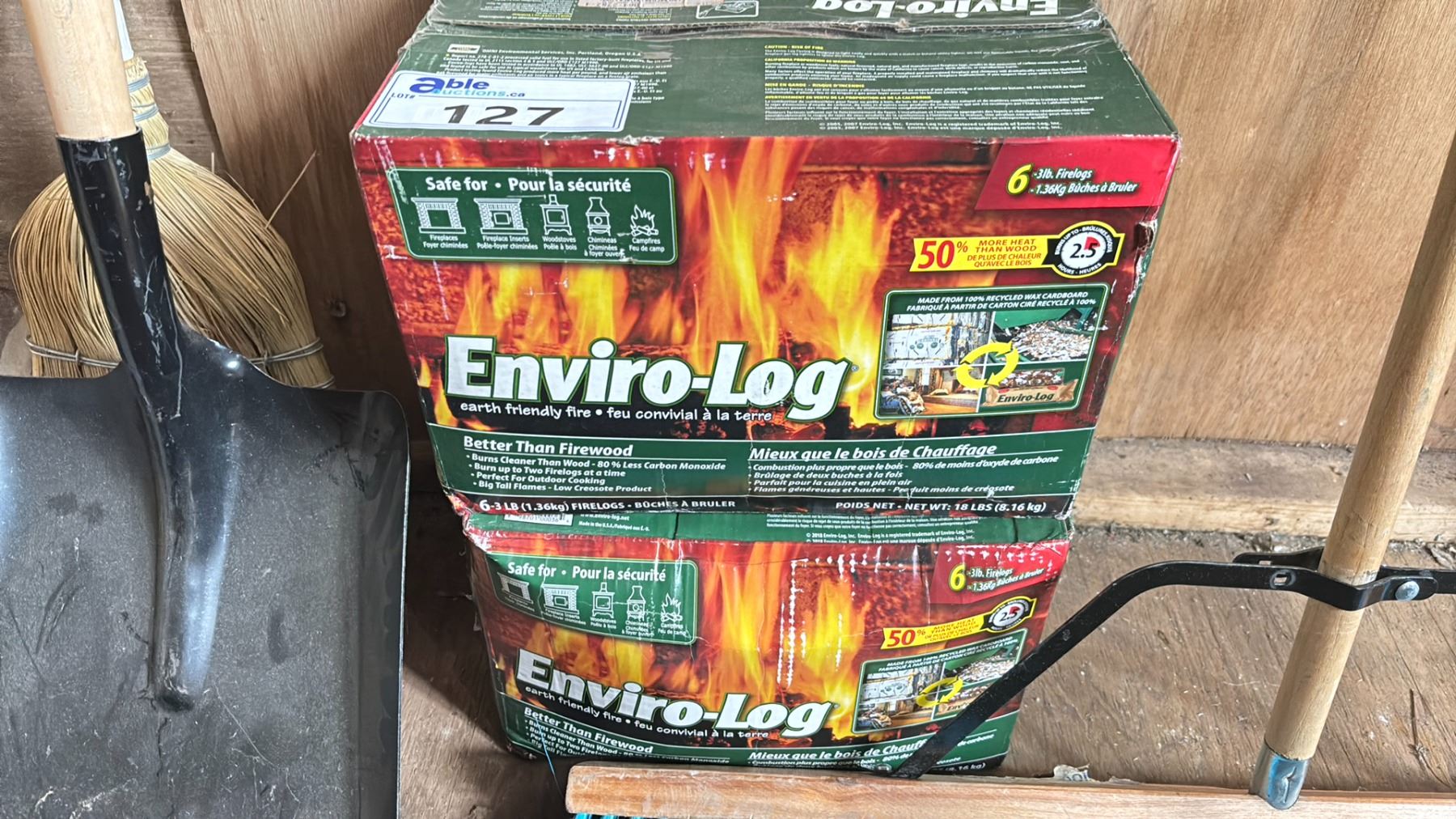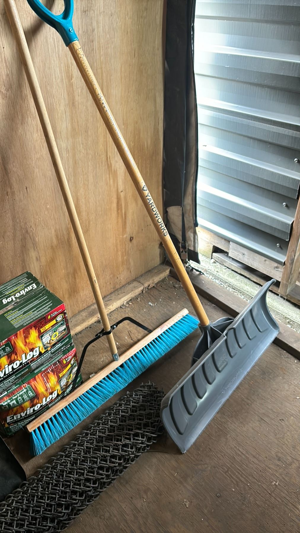 GROUP OF ASSORTED YARD/GARDEN ITEMS - CHAIN LINK FENCING, SHOVELS, BROOMS, PRESSURE SPRAYER, 2 BOXES OF NEW PRESTO LOGS