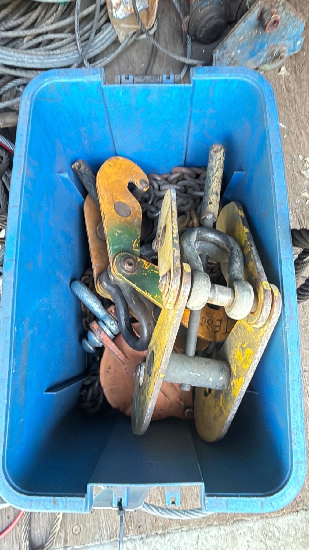 GROUP OF BRAIDED CABLE LIFT LINES & BLUE BOX OF ASSORTED CHAIN + HOOK LIFTS