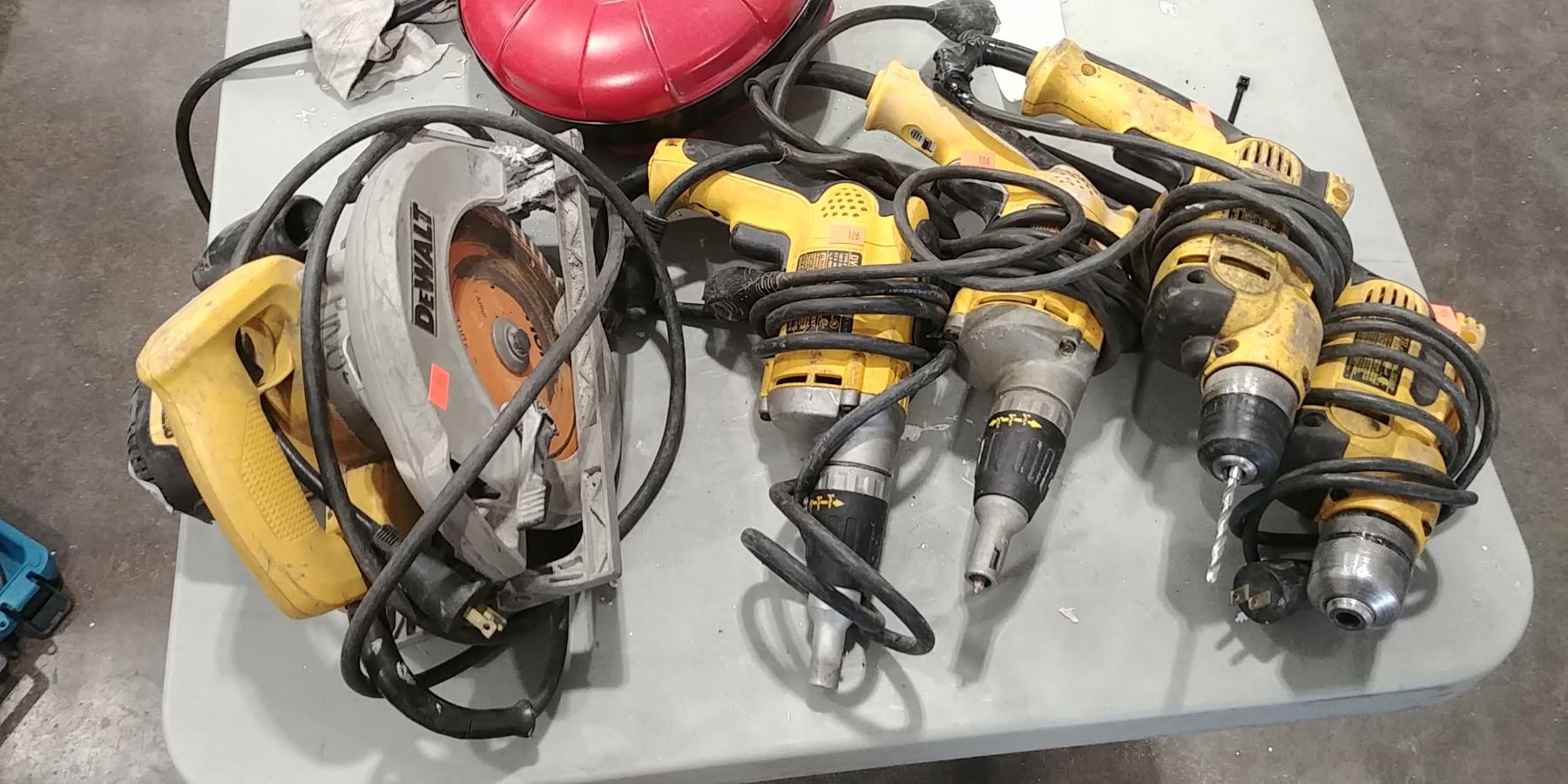 GROUP OF DEWALT TOOLS. CIRCULAR SAW, 2 DRYWALL GUNS, 2 DRILLS