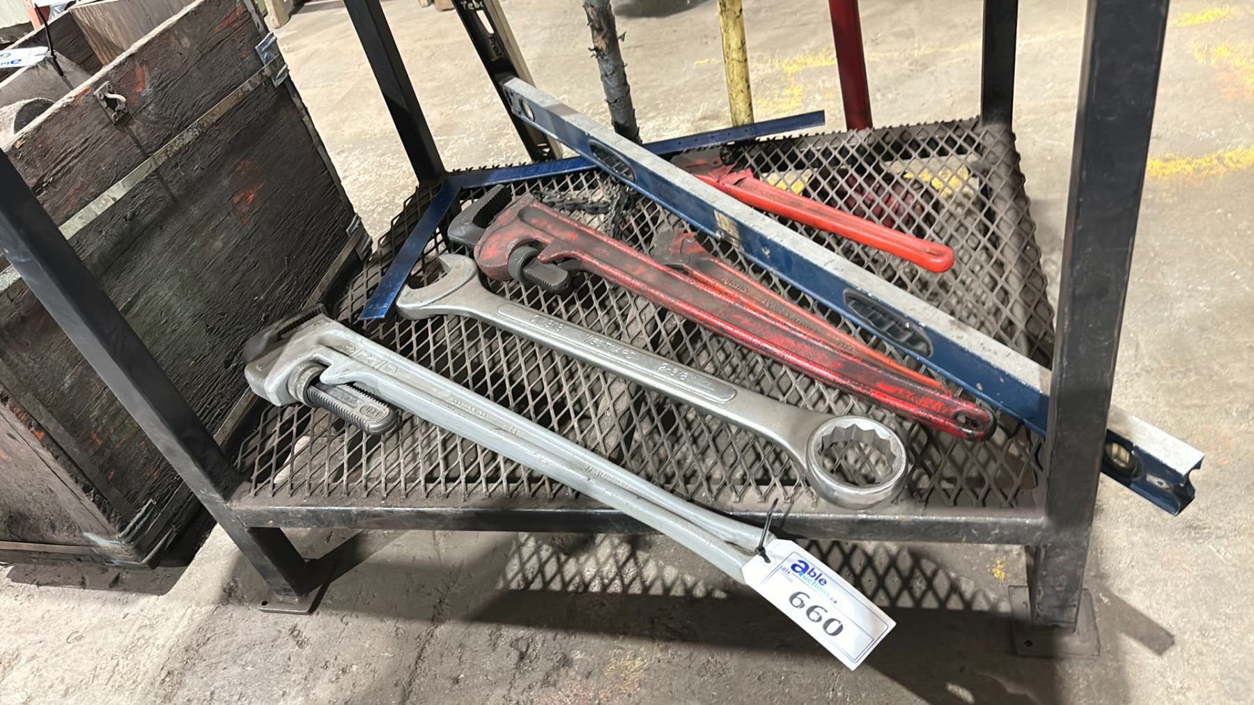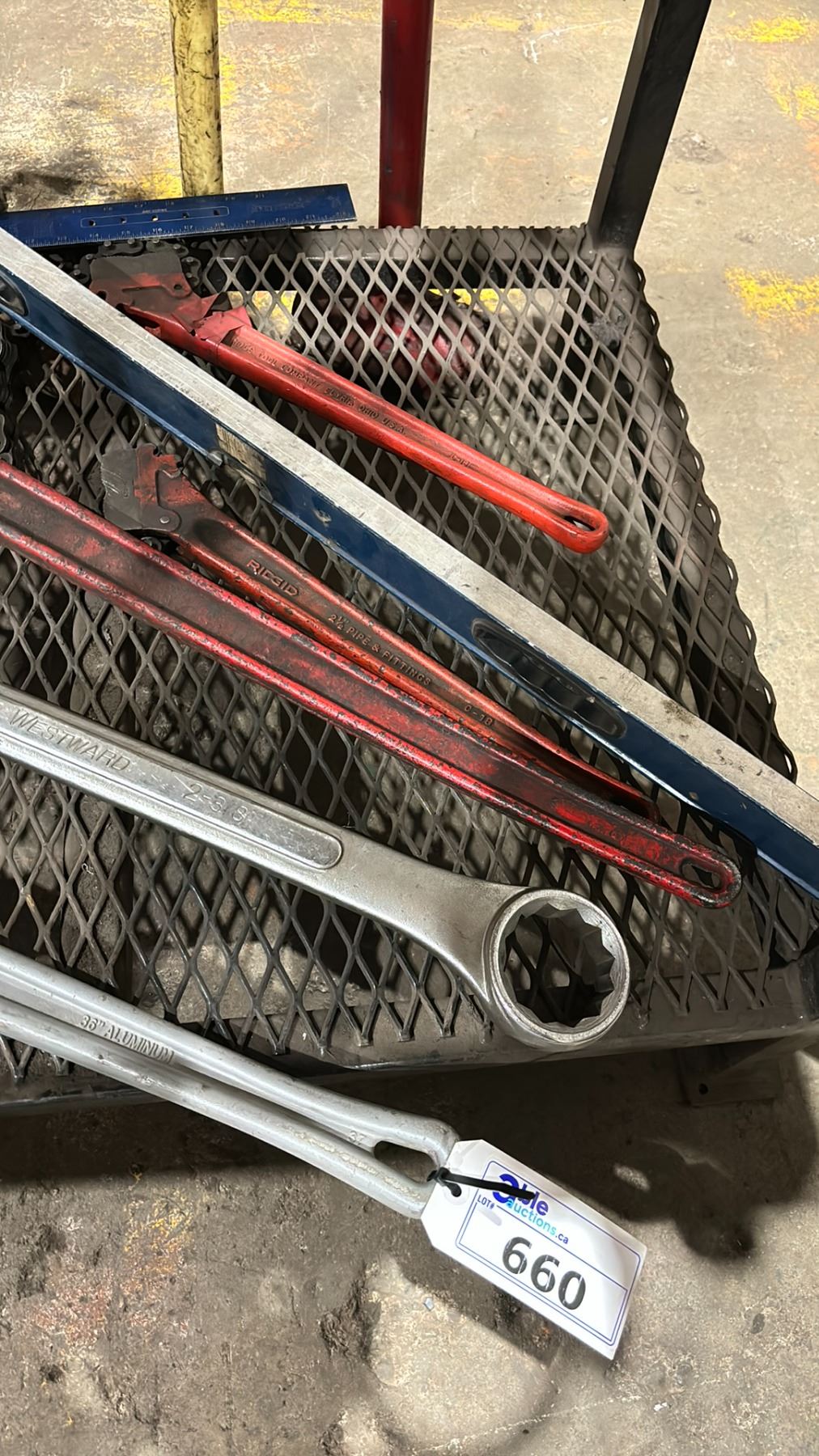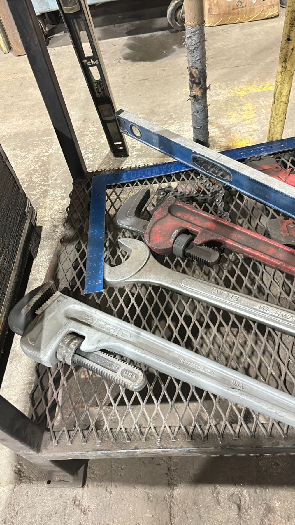 GROUP OF HAND TOOLS - PIPE WRENCHES, 2" X 3/8" COMBINATION WRENCH, RIDGID 36" PIPE WRENCH, SQUARES,