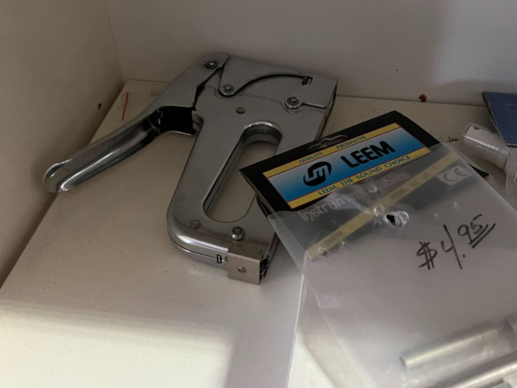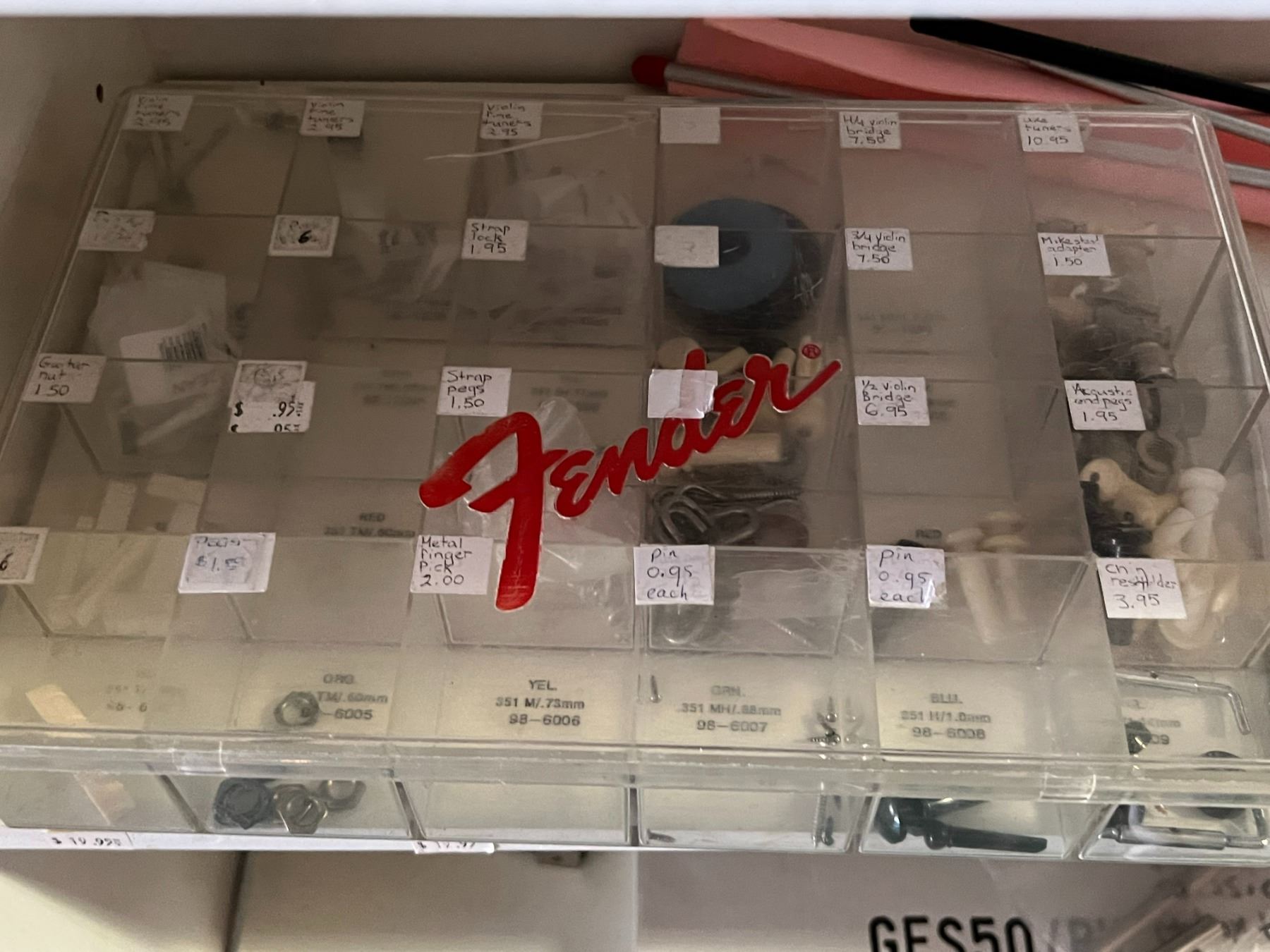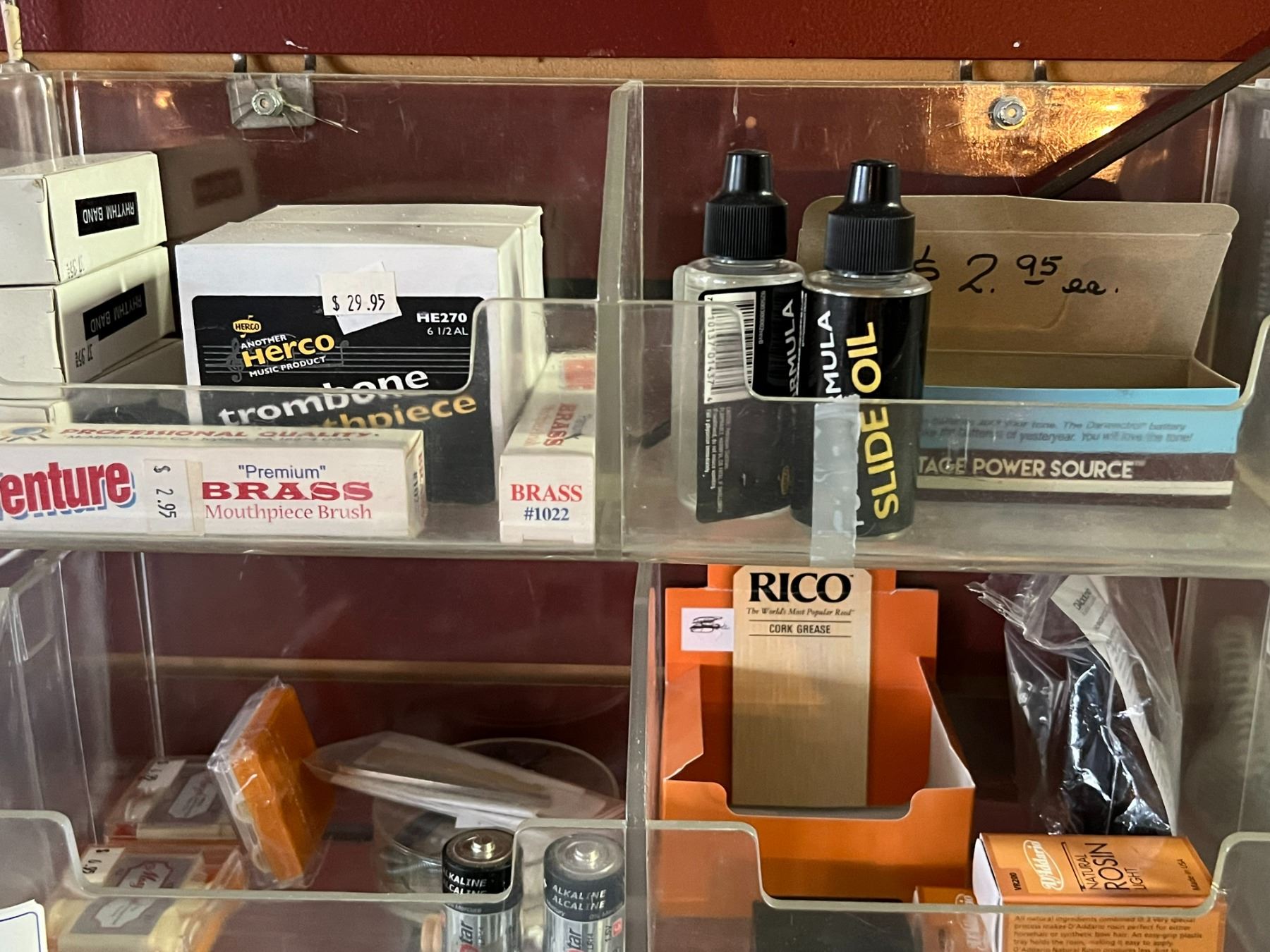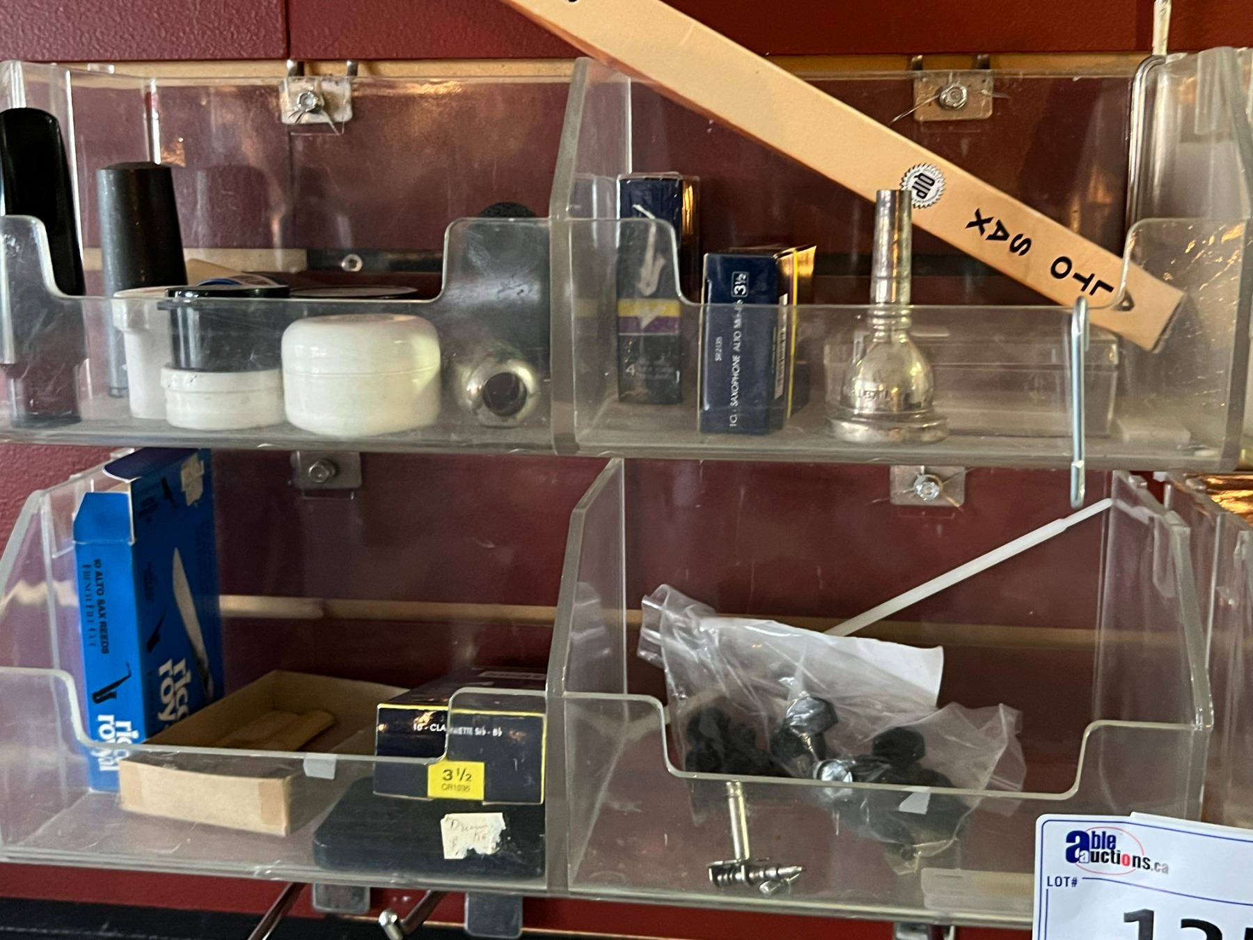 GROUP OF INSTRUMENT REPAIR ITEMS (INCLUDING SAX CLEANER, MUSICAL INSTRUMENT REPAIR PARTS, OILS,