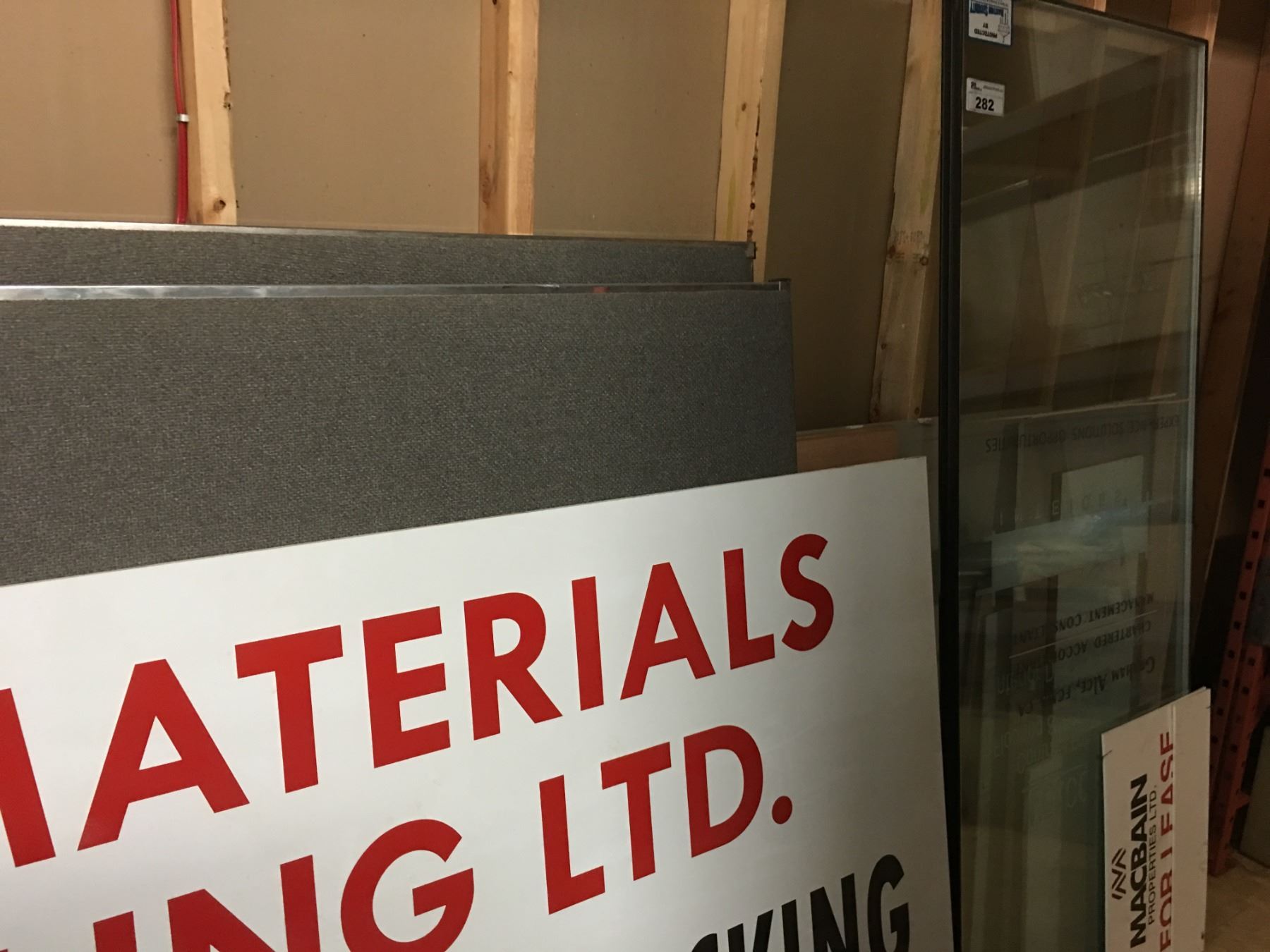 GROUP OF ITEMS LEANING AGAINST OFFICE WALL - LARGE PAINTED SIGN, 2 LARGE DOUBLE GLAZED WINDOW PANES, OFFICE DIVIDER, WOOD ECT.