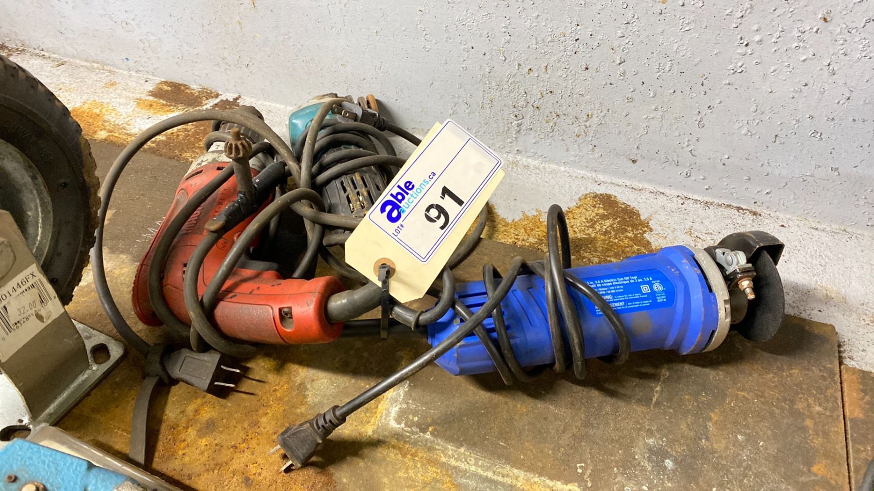 GROUP OF MAKITA ANGLE GRINDER, MILWAUKEE 3/8" DRILL AND POWERFIST CUT OFF SAW
