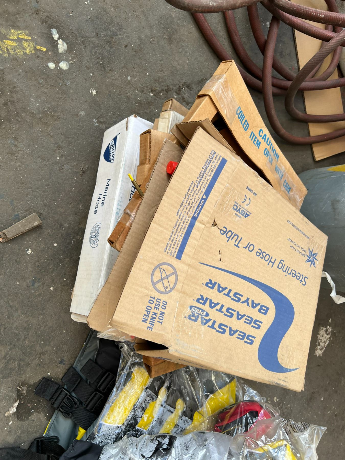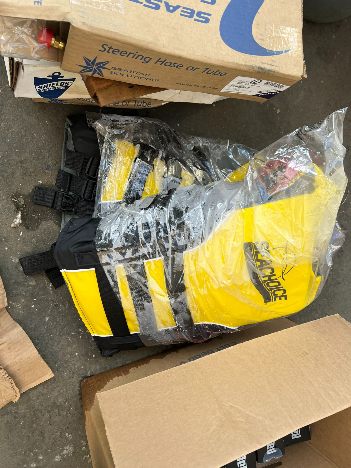 GROUP OF MARINE ITEMS-STAINLESS STEEL HARDWARE, LIFE JACKETS, STEERING CONTROL CABLES, ETC