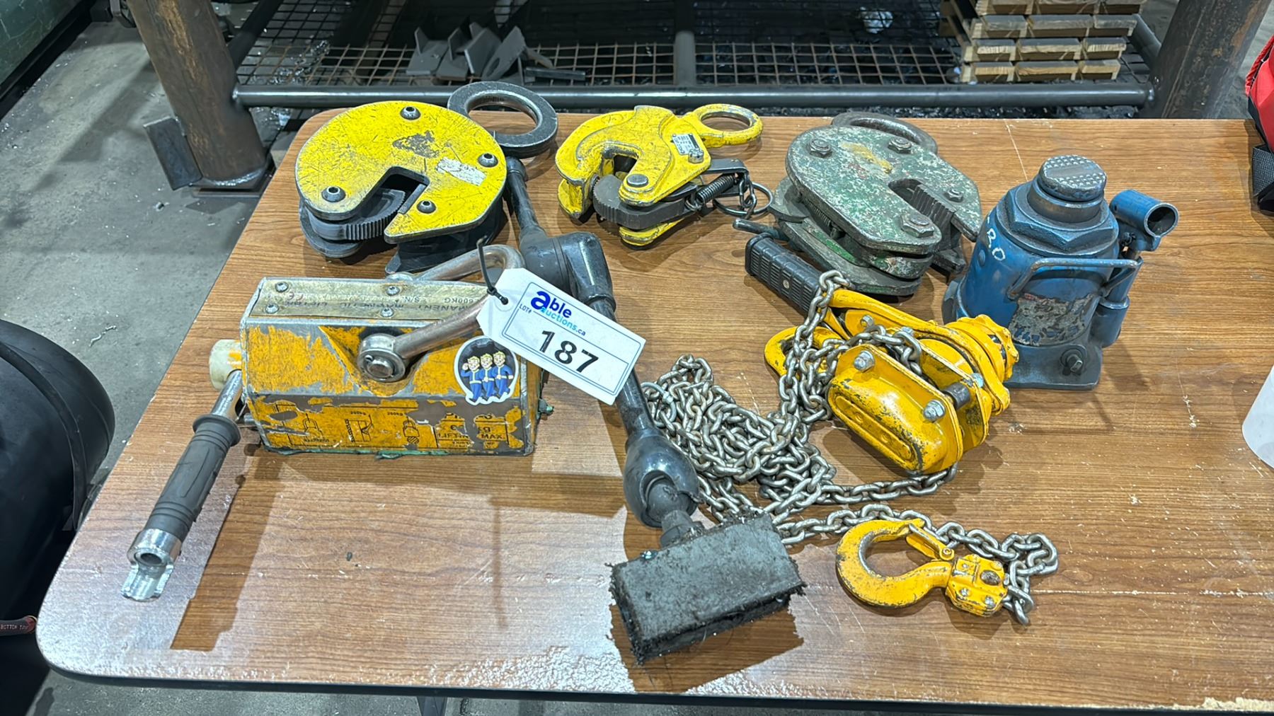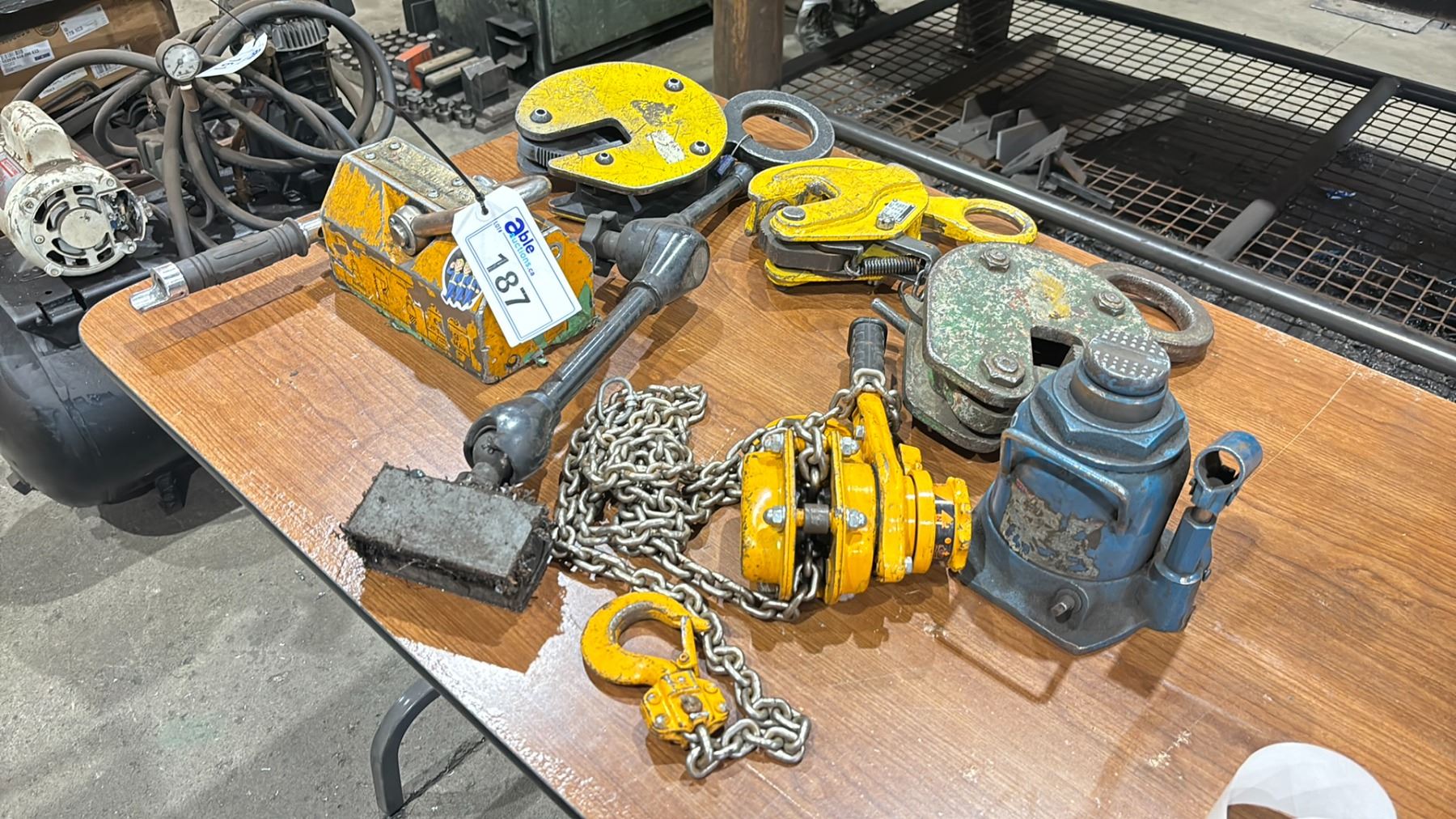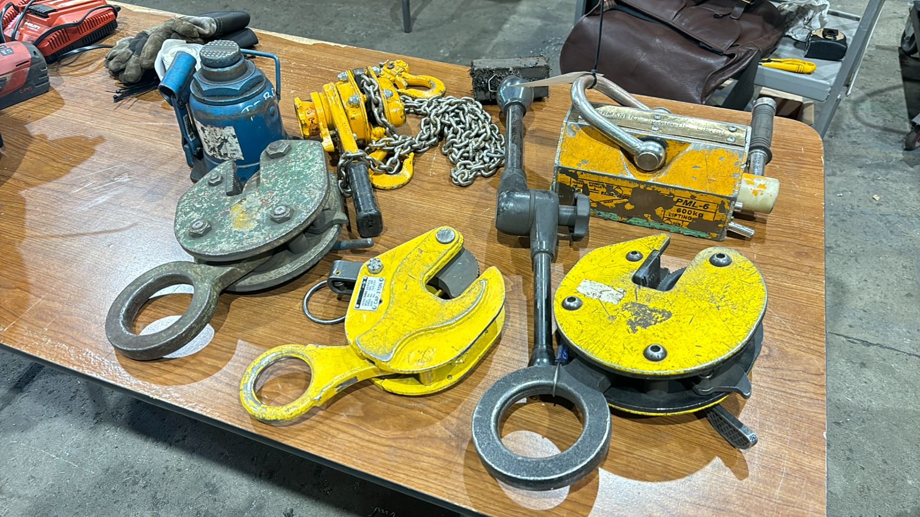 GROUP OF METAL SHOP EQUIPMENT-MAGNETIC LIFTER, STEEL PLATE JAW LIFTERS, CHAIN HOIST & HYDRAULIC JACK