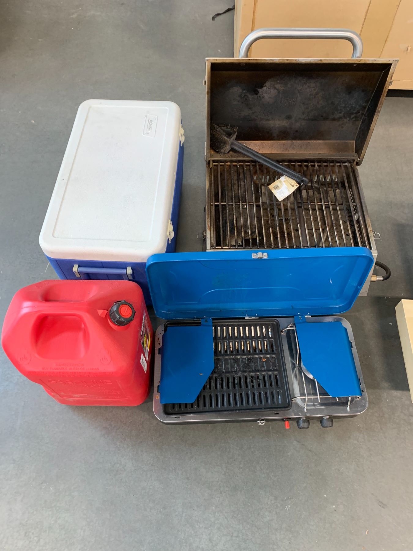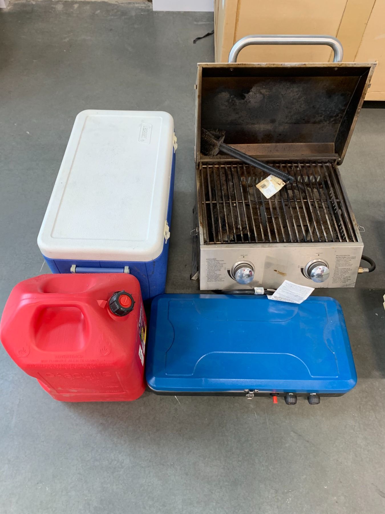 GROUP OF OUTDOOR CAMPING ITEMS-BBQ, PROPANE STOVE, COOLER AND JERRY CAN