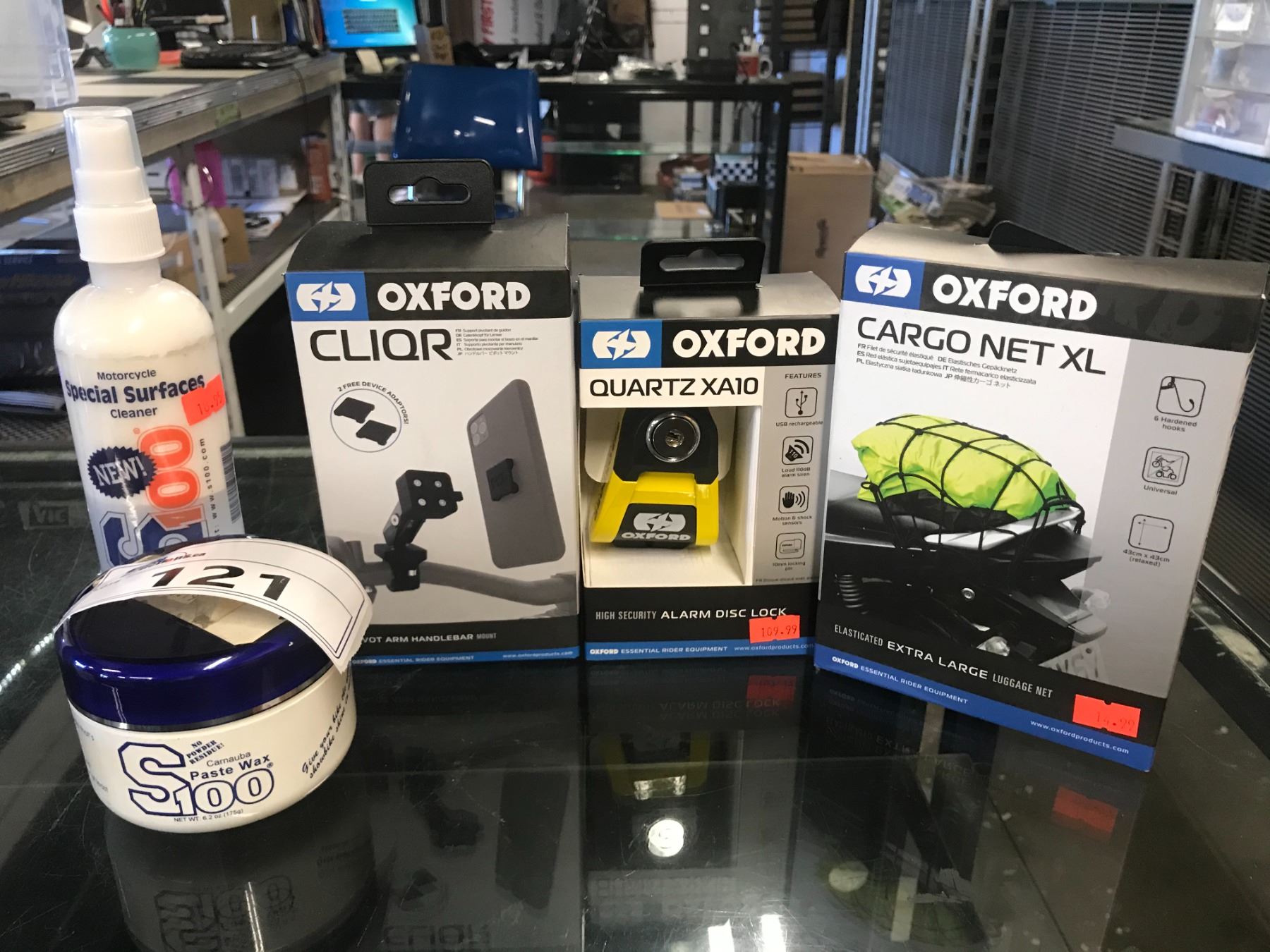 GROUP OF OXFORD DISC LOCK, CELL PHONE MOUNT, CARGO BUNGEE, S100 WAX, S100 CLEANER