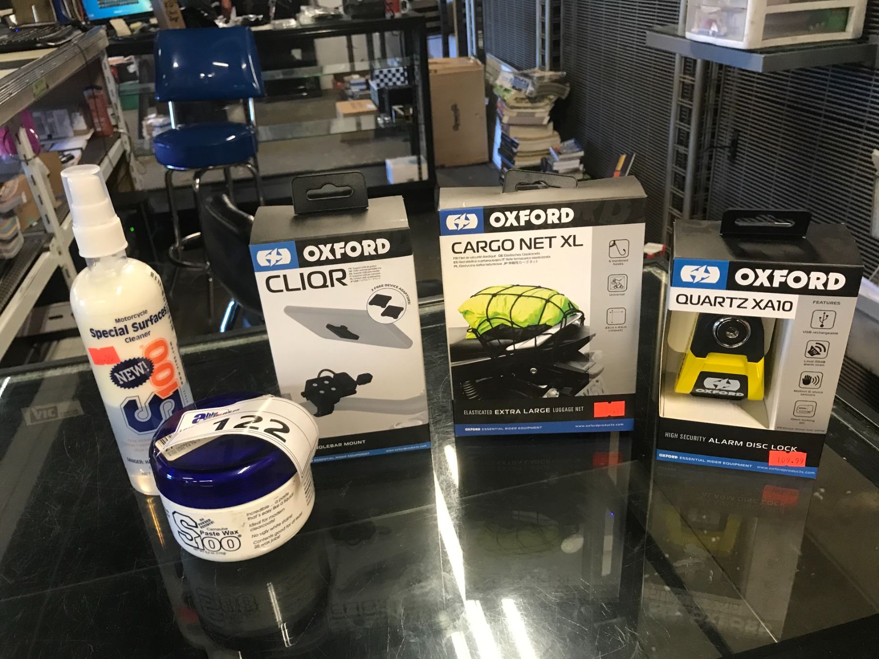 GROUP OF OXFORD DISC LOCK, CELL PHONE MOUNT, CARGO BUNGEE, S100 WAX, S100 CLEANER