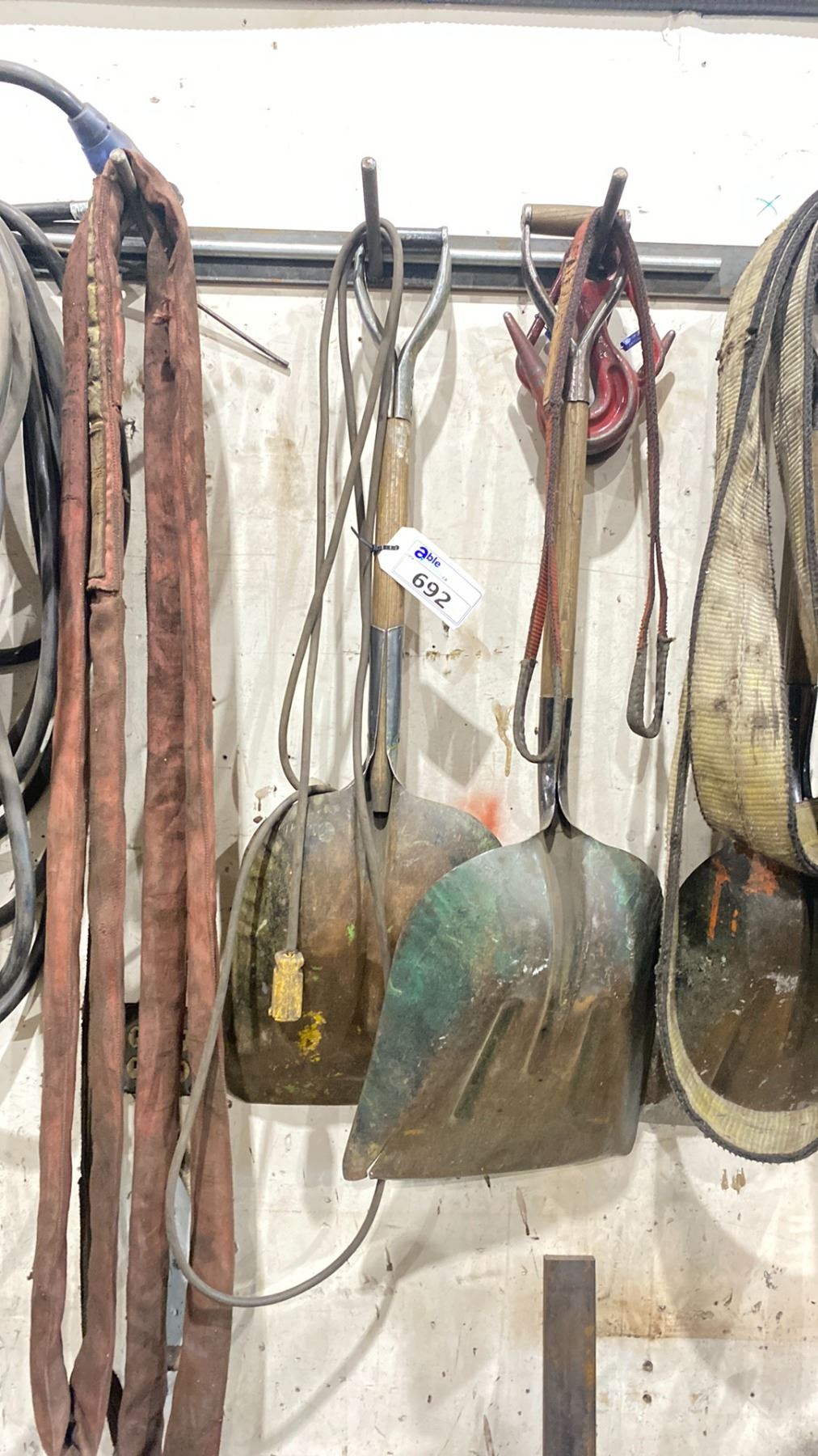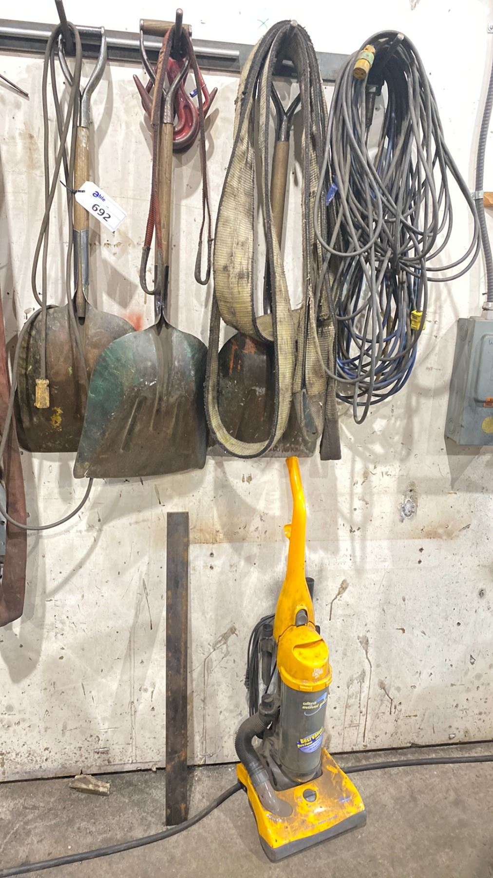GROUP OF RIGGING SLINGS, EXTENSION CORDS, POWER CORD, SHOVELS & VACUUM
