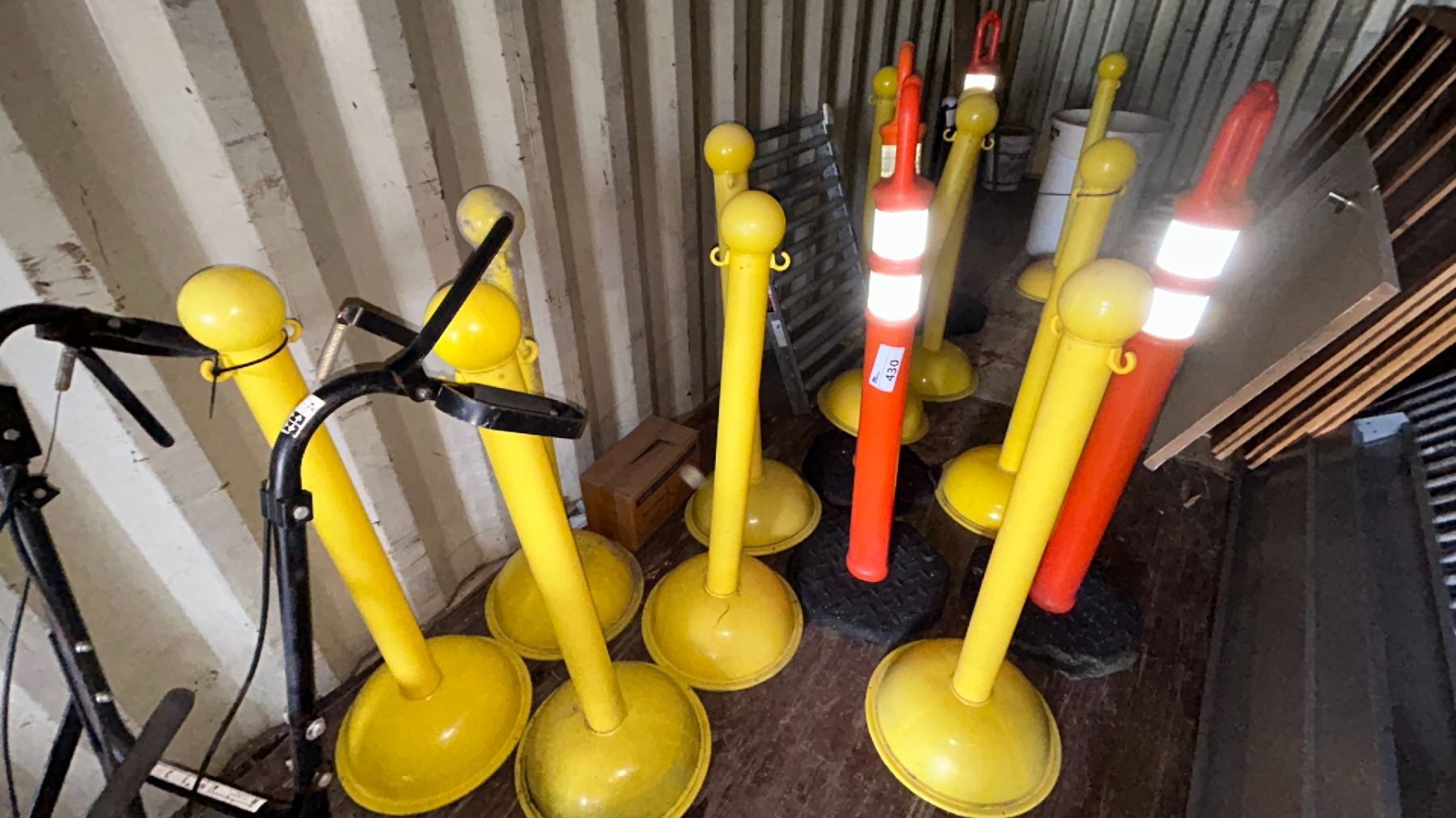 GROUP OF SAFETY PYLONS 16 PIECES SOME ARE CRACKED LOCATED IN CONTAINER