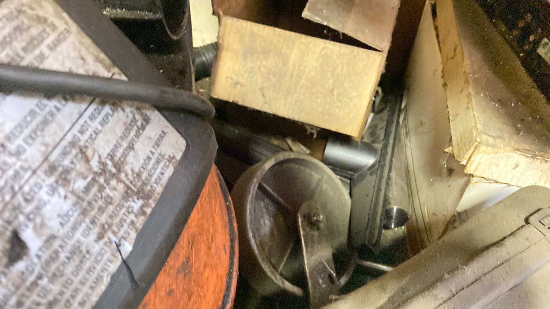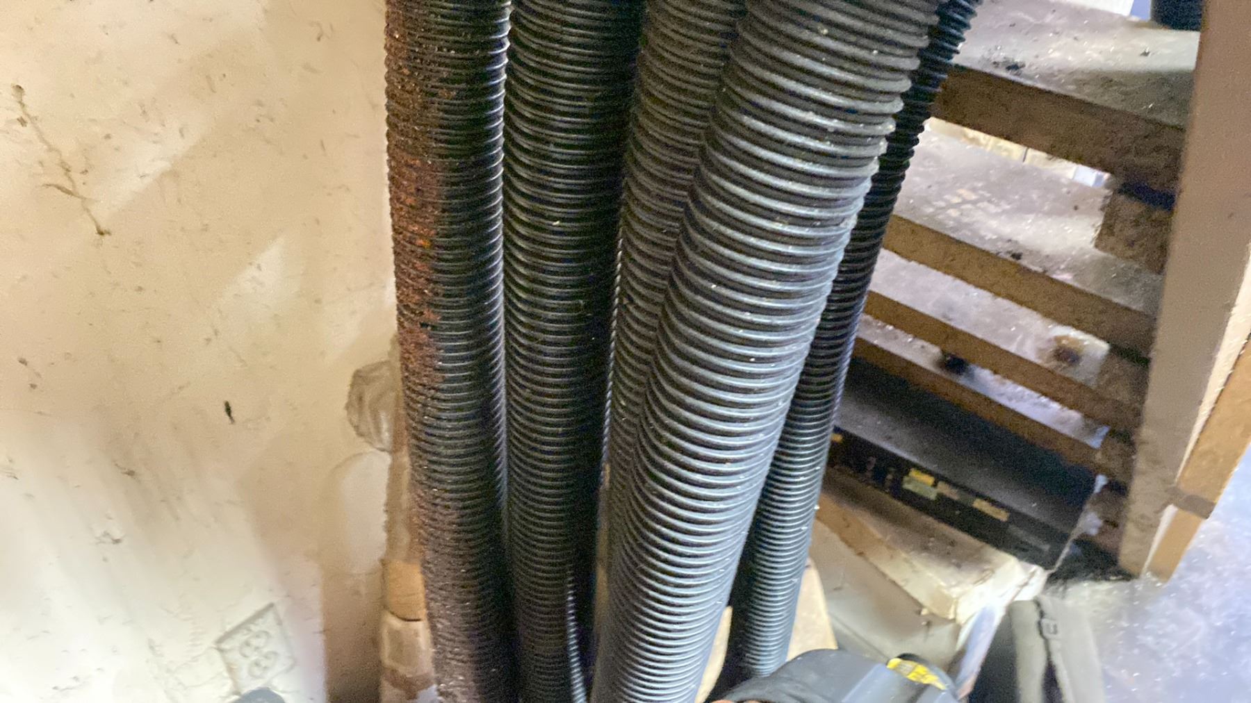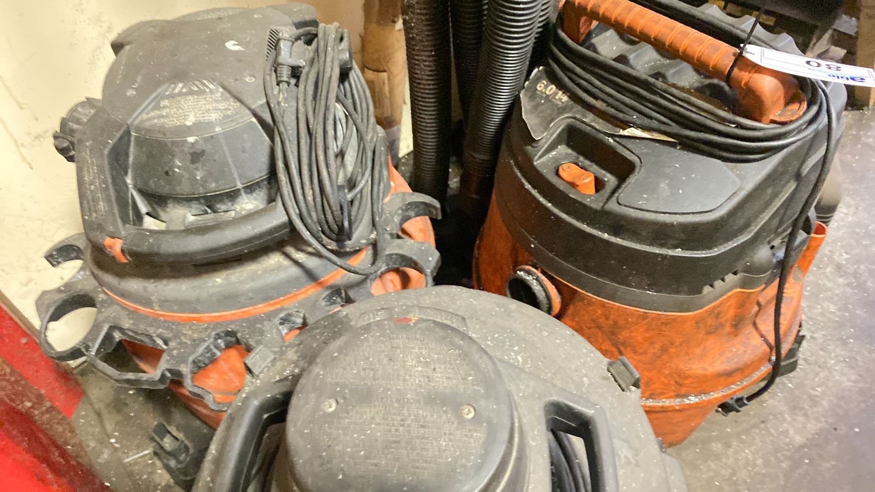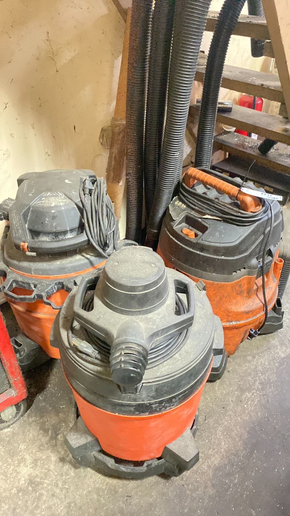 GROUP OF THREE SHOP VACUUMS WITH HOSES AND ASSORTED MISC ITEMS UNDER STAIRS