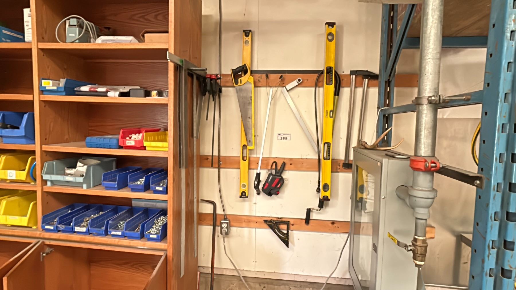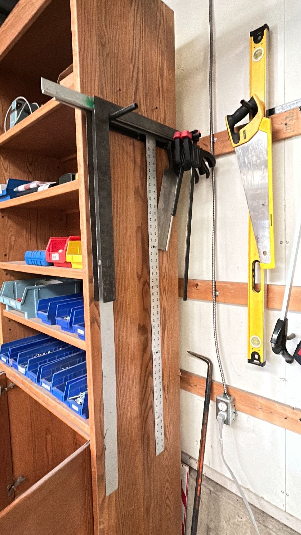 GROUP OF TOOLS ON WALL. TOILET AUGER, BAR CLAMPS, 2X 4' LEVELS, DRYWALL SQUARES, SAWS, ASST SQUARES, WRECKING BAR