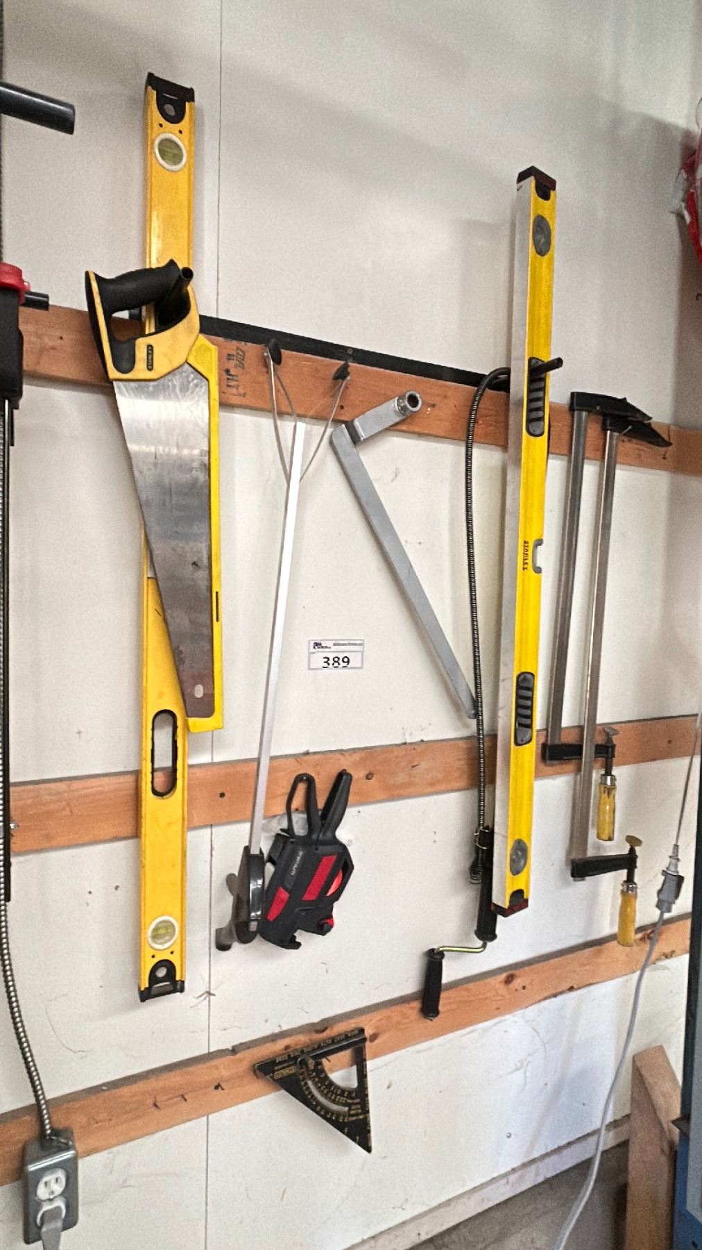 GROUP OF TOOLS ON WALL. TOILET AUGER, BAR CLAMPS, 2X 4' LEVELS, DRYWALL SQUARES, SAWS, ASST