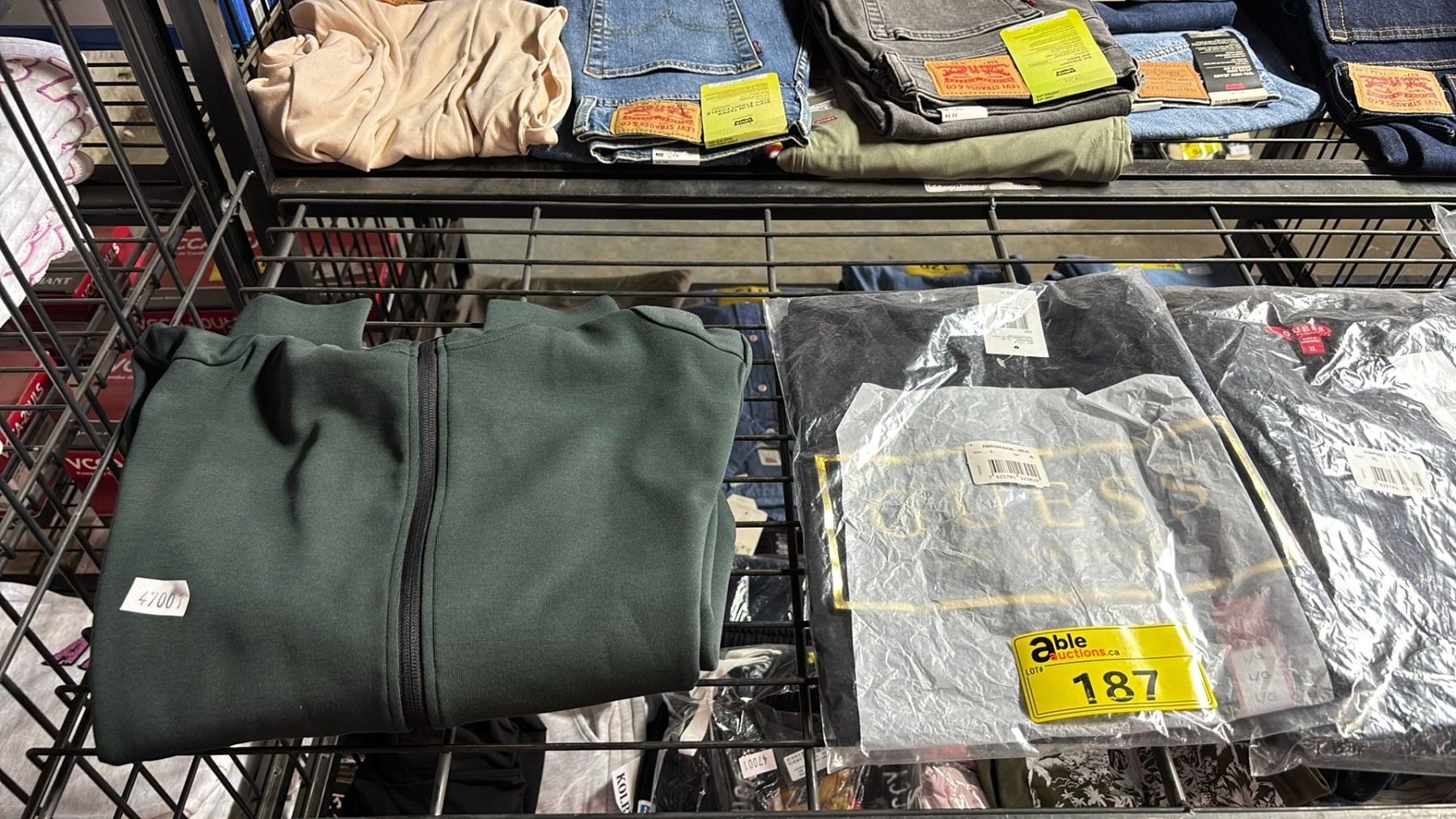 GUESS CLOTHING INCLUDING - SMALL GREEN ZIP UP SWEATER, LARGE BLACK T SHIRT, EXTRA LARGE LONG SLEEVE