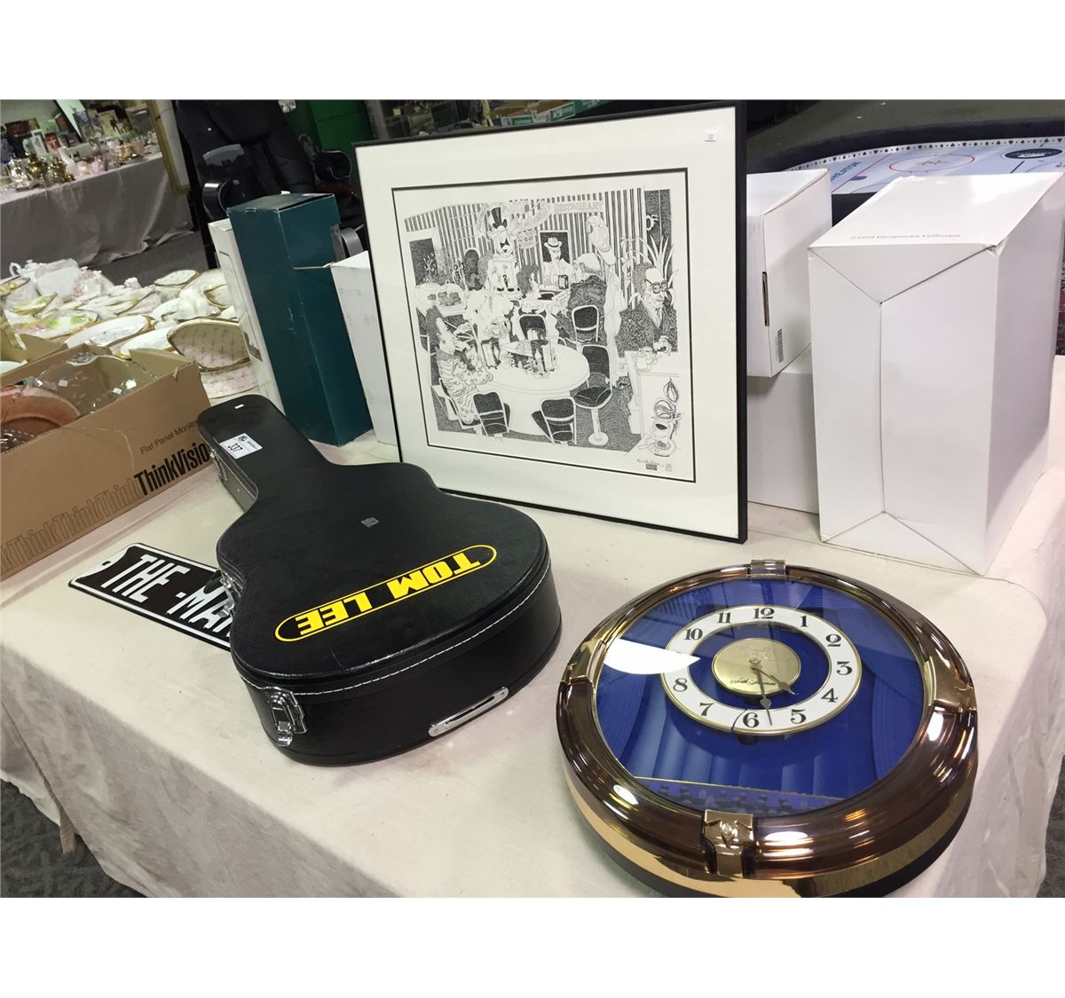 GUITAR CASE, MAN CAVE SIGN AND LIMITED EDITION PRINT SIGNED "MCKELLAR" 189/200 + NIGHT AT THE BALLET, SETH THOMAS CLOCK