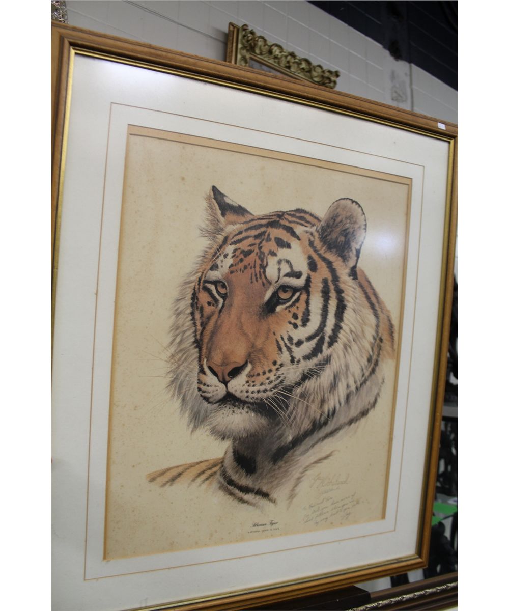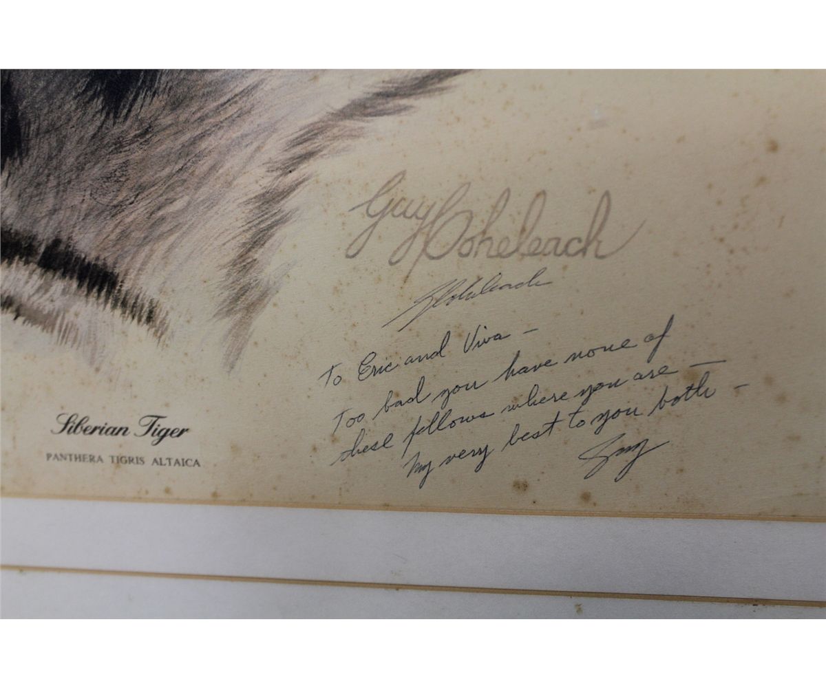 GUY COHELEACH, "SIBERIAN TIGER" FRAMED PRINT WITH PERSONAL INSCRIPTION ON FRONT " TO ERIC AND VIVA, TOO BAD YOU HAVE MORE OF THESE FELLOWS WHERE YOU ARE- MY VERY BEST TO YOU BOTH GUY" 19" W X 24"H
