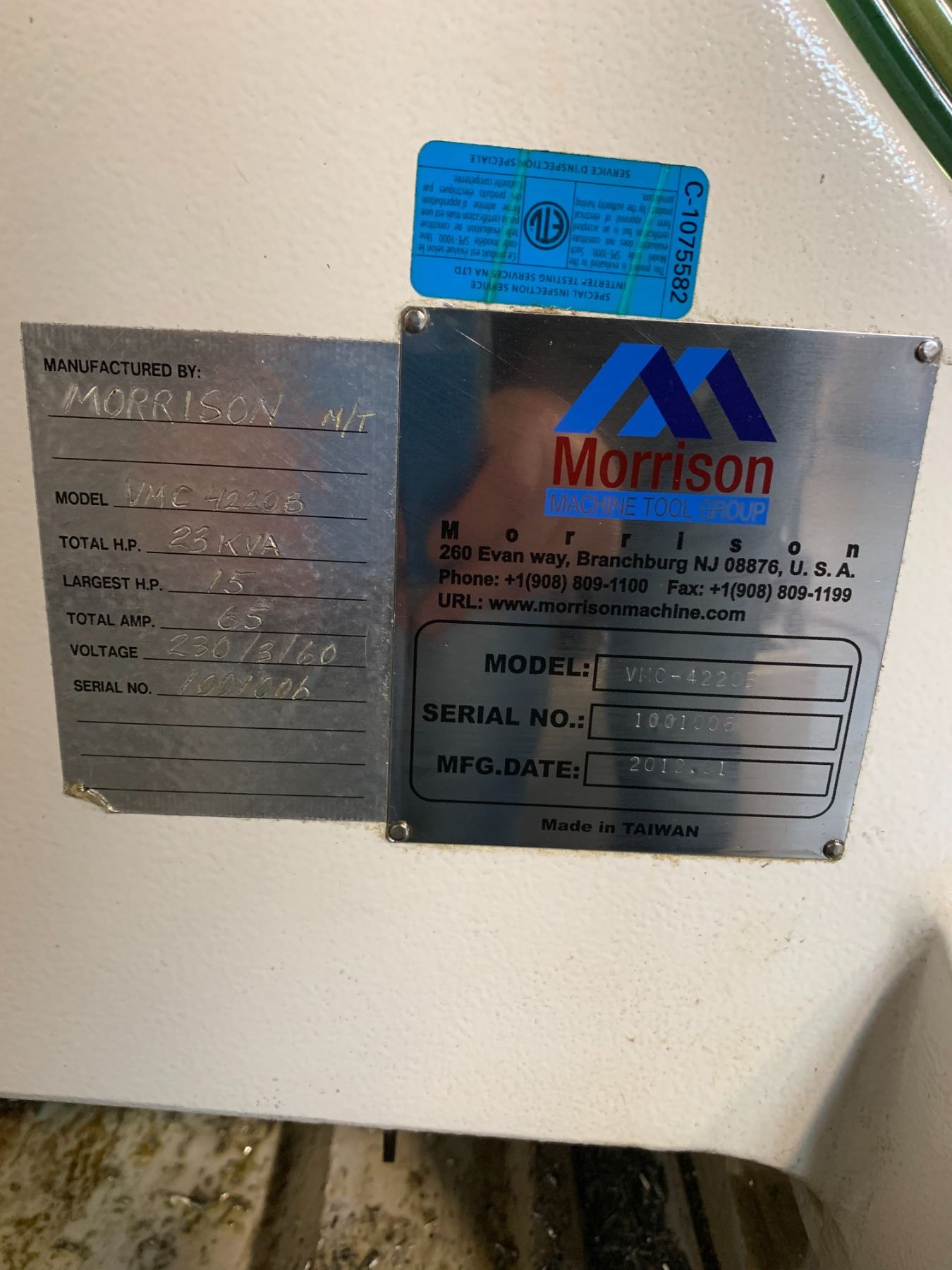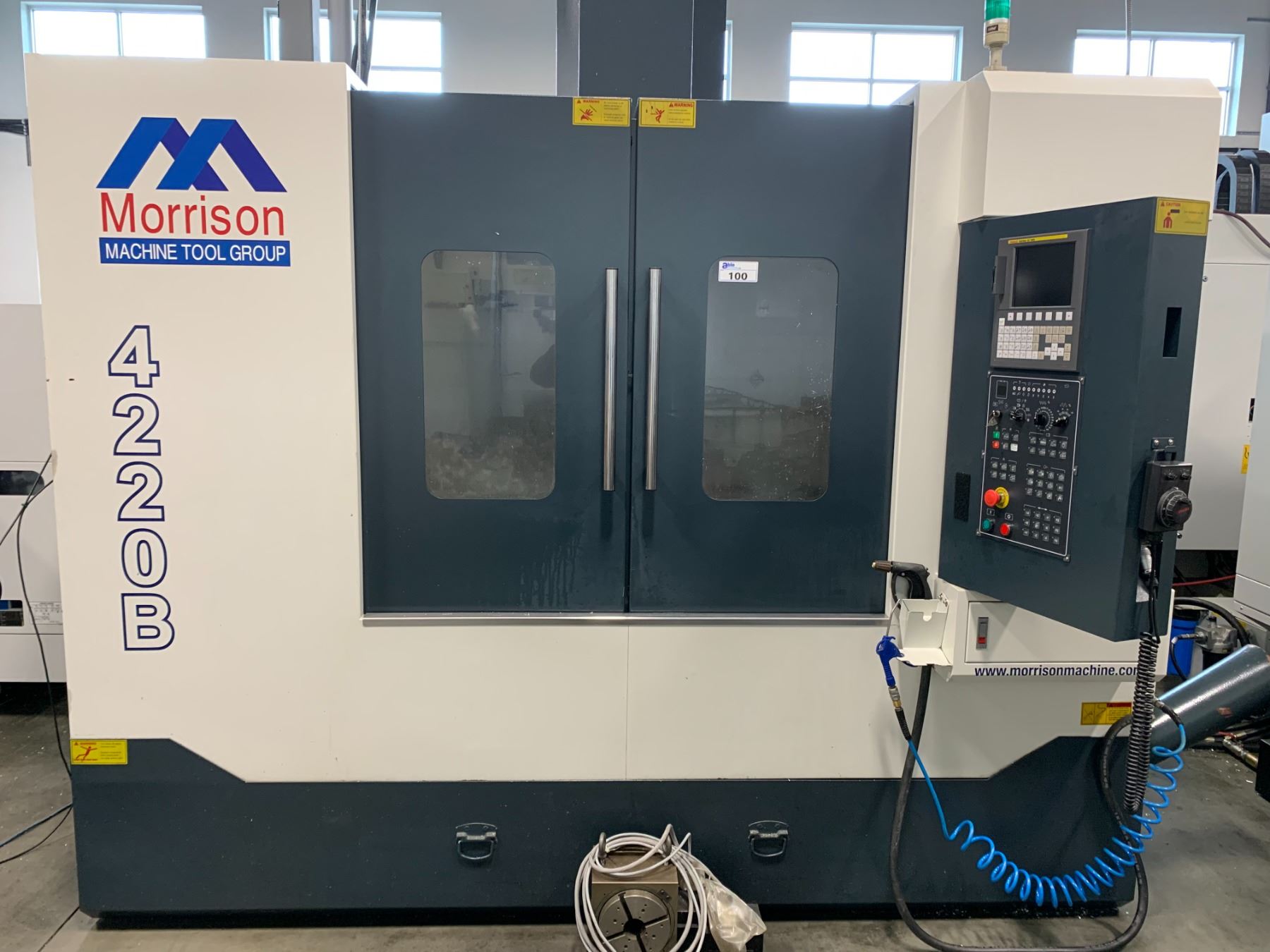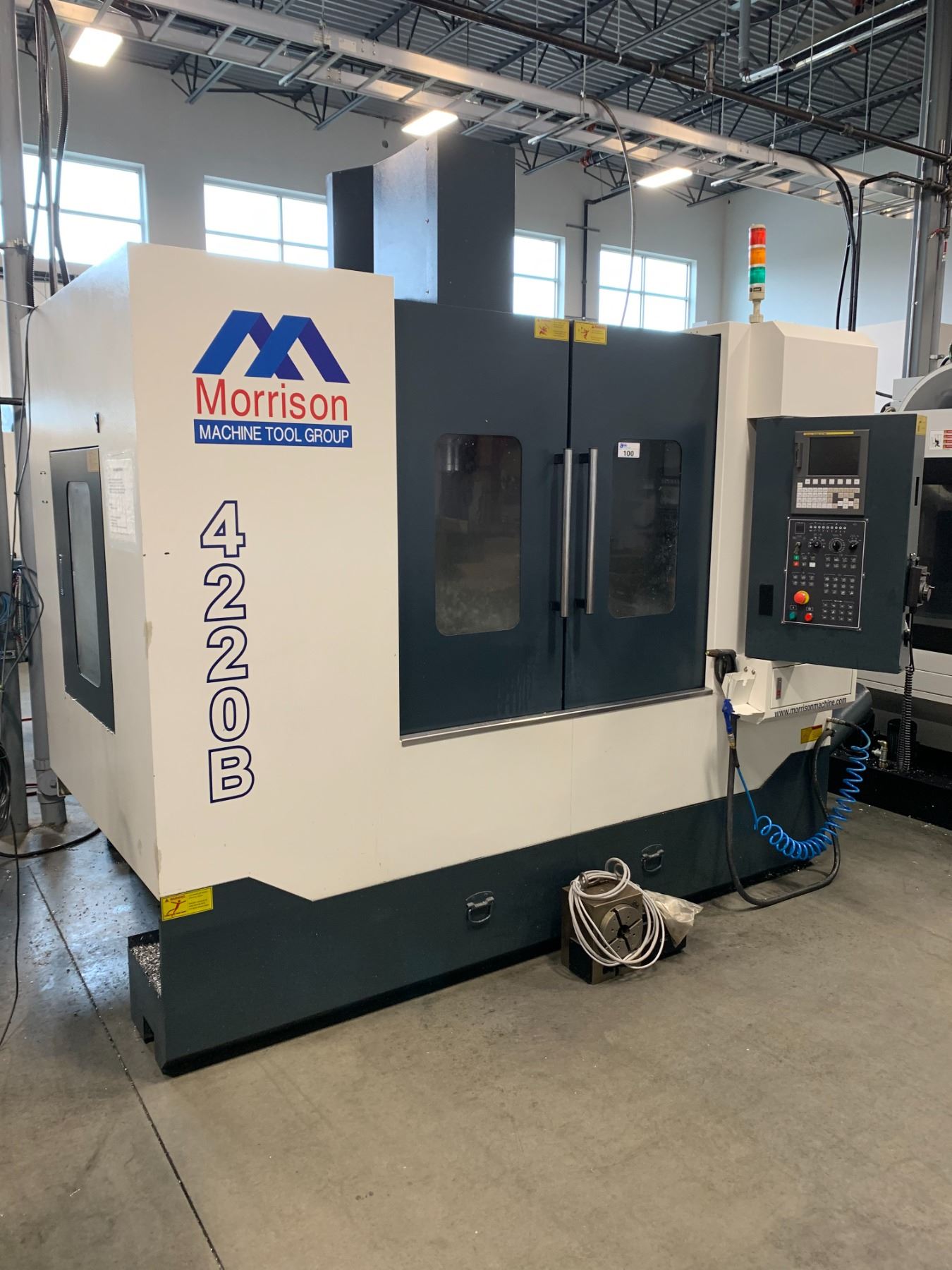 *H/C* MORRISON VMC 4220B CNC MILL -4TH AXIS ROTARY, 12,000 RPM SPINDLE, THRU SPINDLE COOLANT, CAT 40,24 DUAL ARM TOOL CHANGER. *FANUC SERIES OI-MD CONTROLLER* **REMOVAL OF THIS MACHINE REQUIRES HIAB/CRANE LIFT AND HEAVY MOVING SKATES** ***KURT VISES NOT INCLUDED***