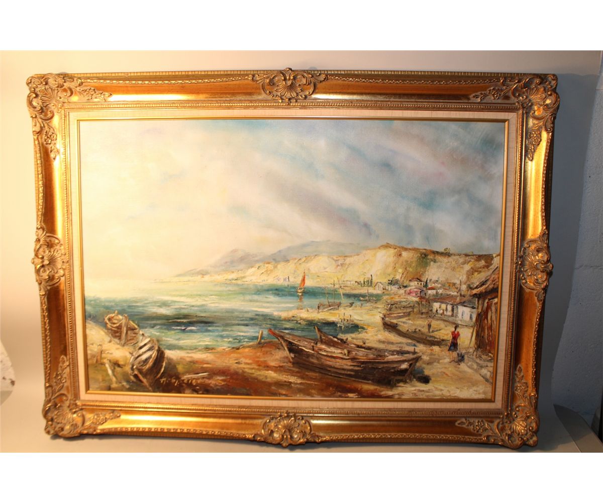 H. SPEIER, OIL ON CANVAS, "UNTITLED- BOATS IN THE BAY" SIGNED LOWER LEFT 23" X 35"