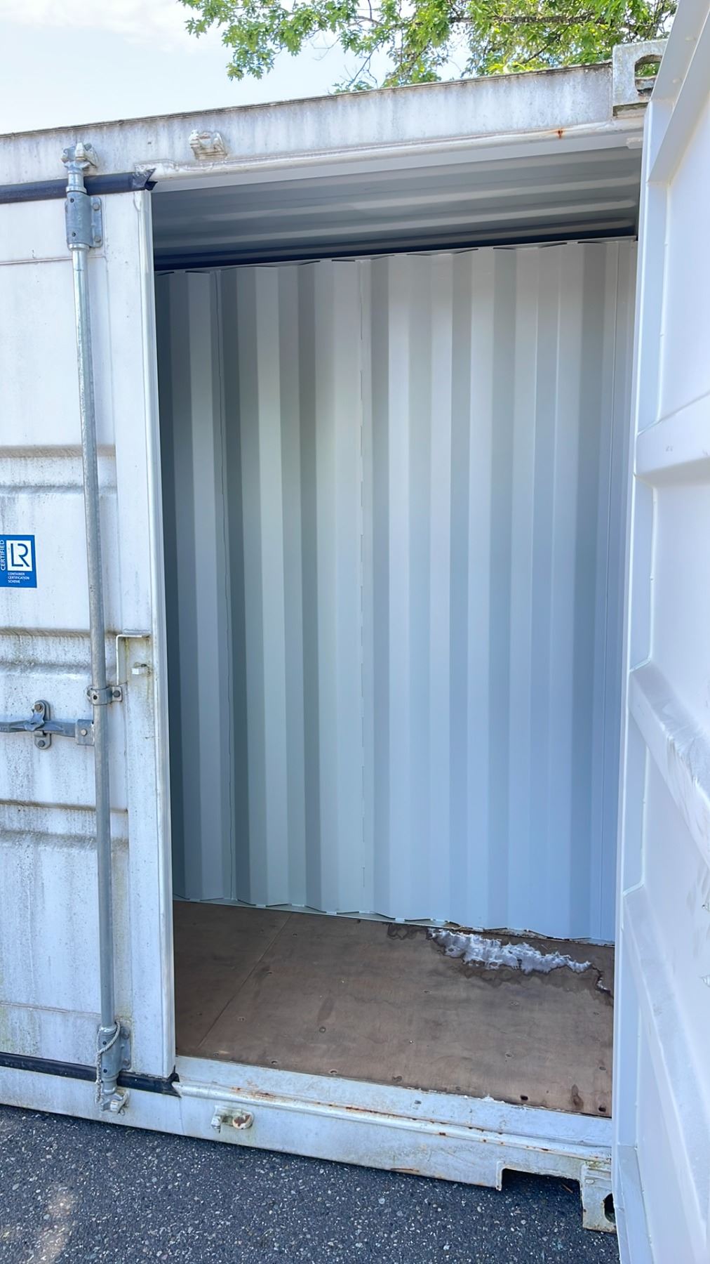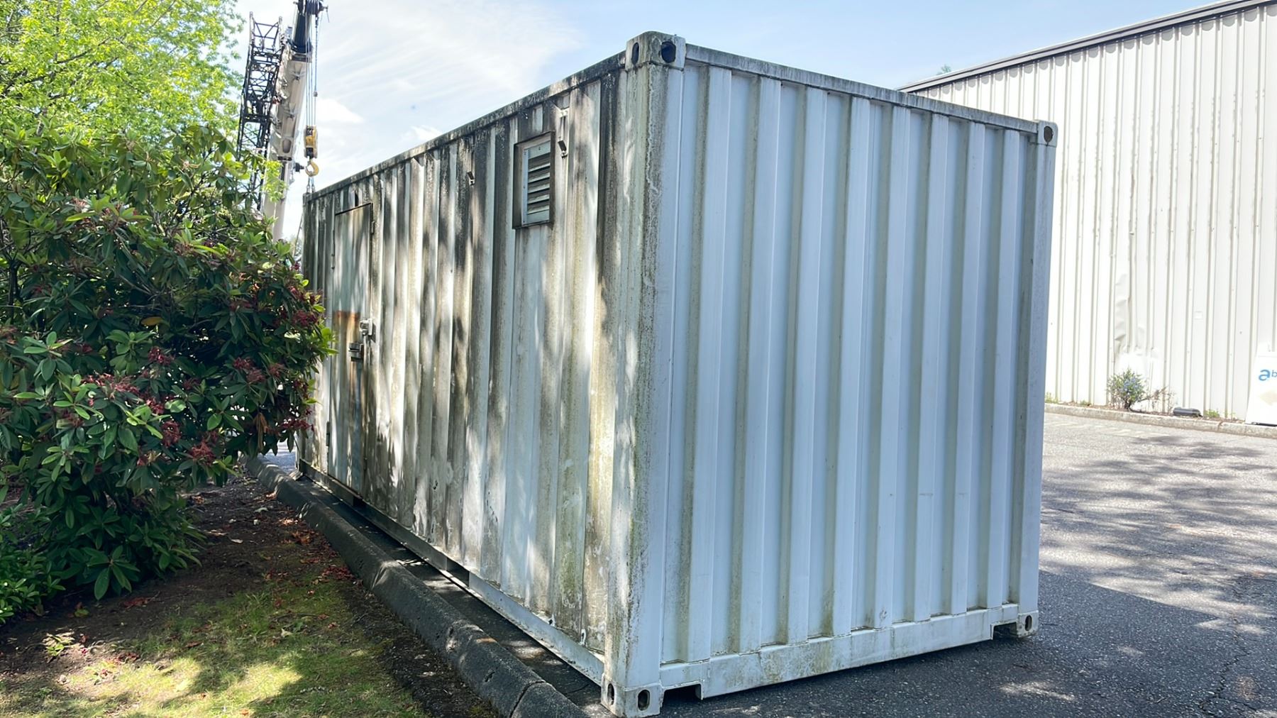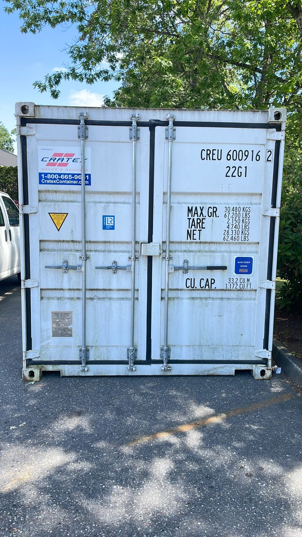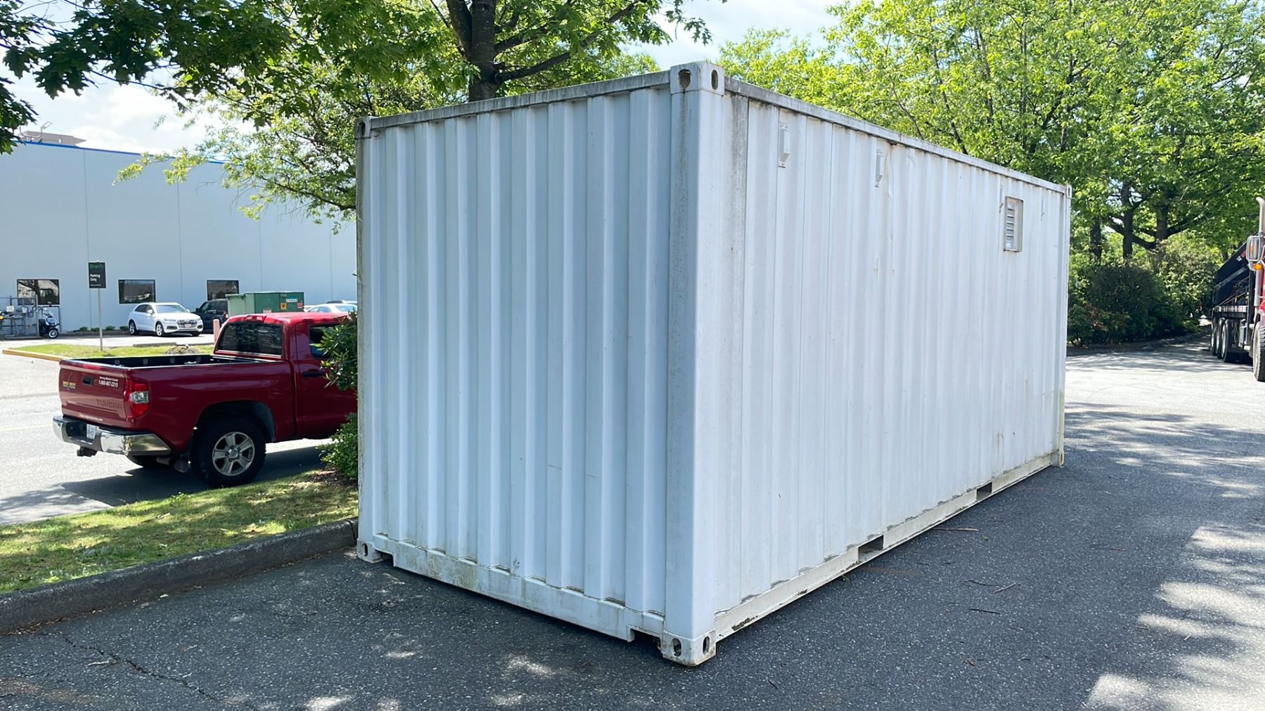 *H/T S* WHITE 20FT 67,200 MAX CAPACITY INDUSTRIAL TRANSPORT CONTAINER, DUAL SWING REAR DOORS, SIDE MAN DOOR, HAS METAL STORAGE SHELVES & ROUGHED IN FOR VENTILATION ** HAS DAMAGE/ PUNCTURE NEAR UPPER WALL ** *REQUIRES HIAB CRANE OR TILT DECK TRAILER TO TRANSPORT LAST DAY* CREU6009162