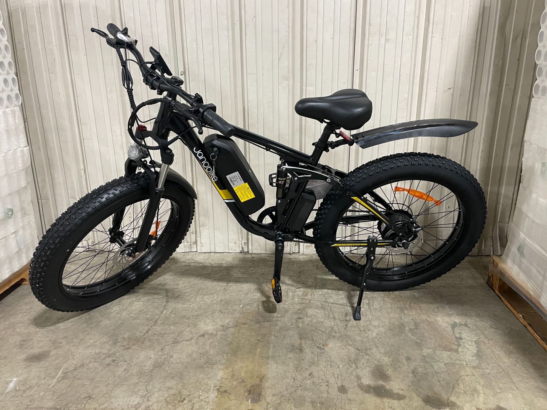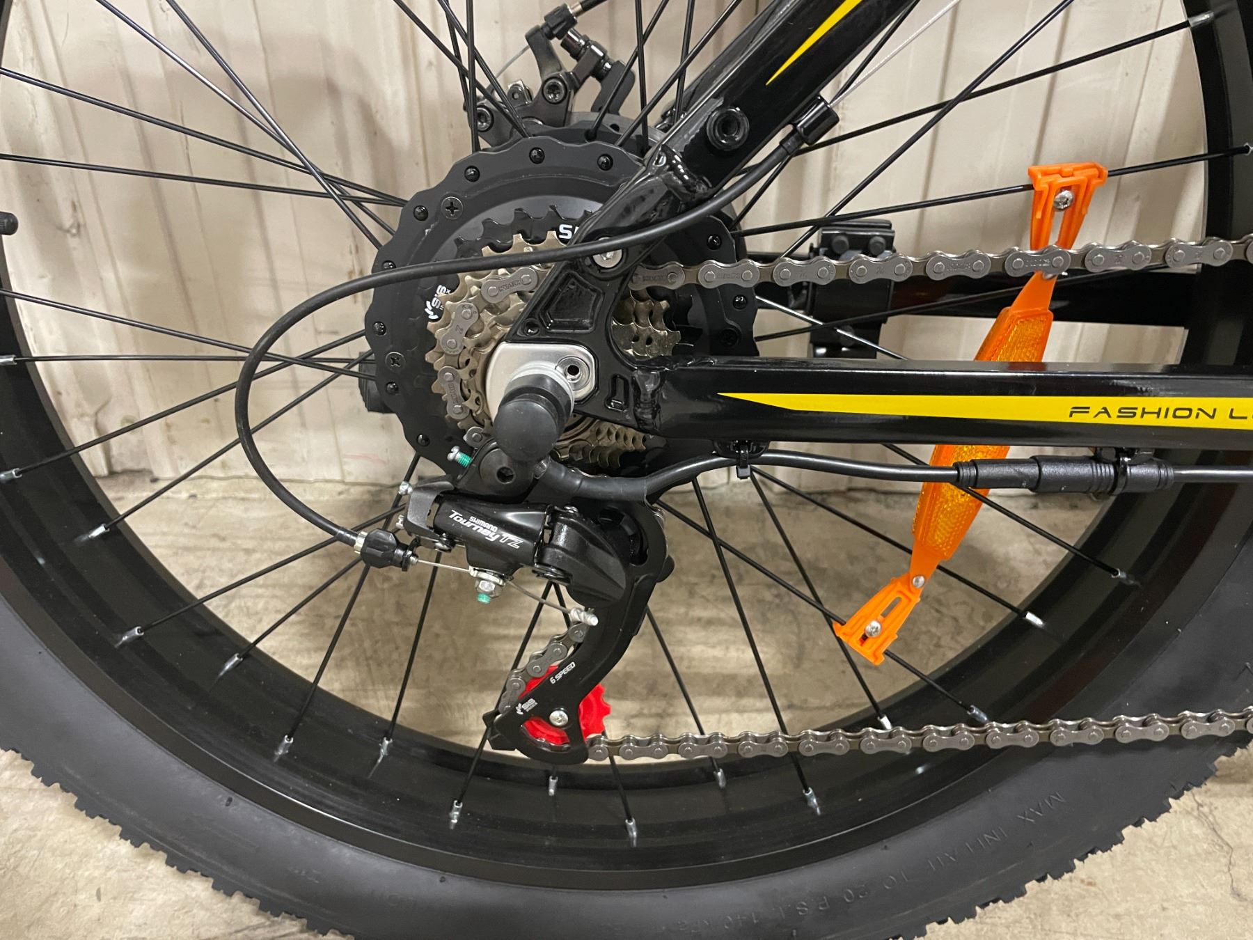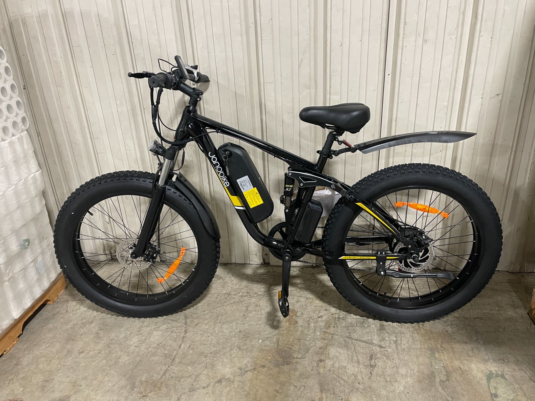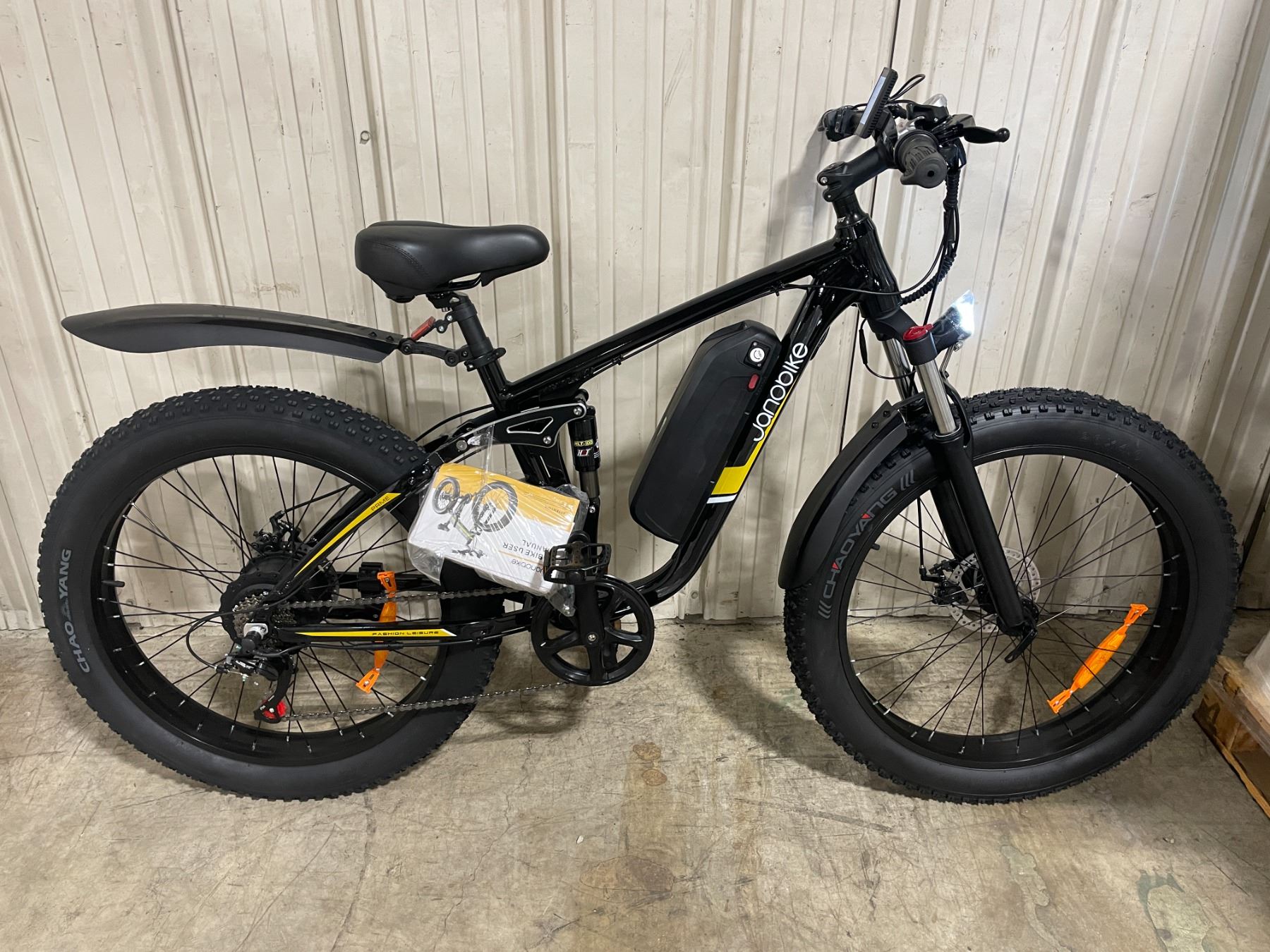 H36 ELECTRIC BIKE, DUAL SHOCK MOUNTAIN E-BIKE. 500W/1000W MOTOR, 35 KMH MAX SPEED, 48 VOLT BATTERY, DISPLAY MONITOR, 4" X 26" TIRES, UP TO 75 KM RANGE, HYDRAULIC DISC BRAKES, 18" FRAME, 31 KG WEIGHT, FRONT AND REAR SUSPENSION, MAY OR MAY NOT INCLUDE LUGGAGE RACK, HAS POWER ADAPTER (UNASSEMBLED/IN BOX)