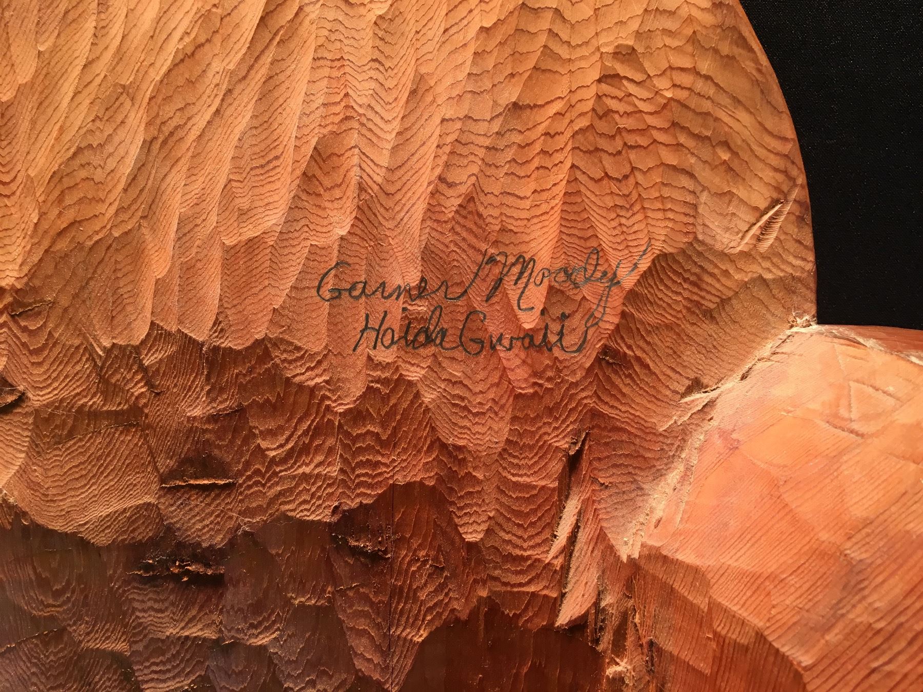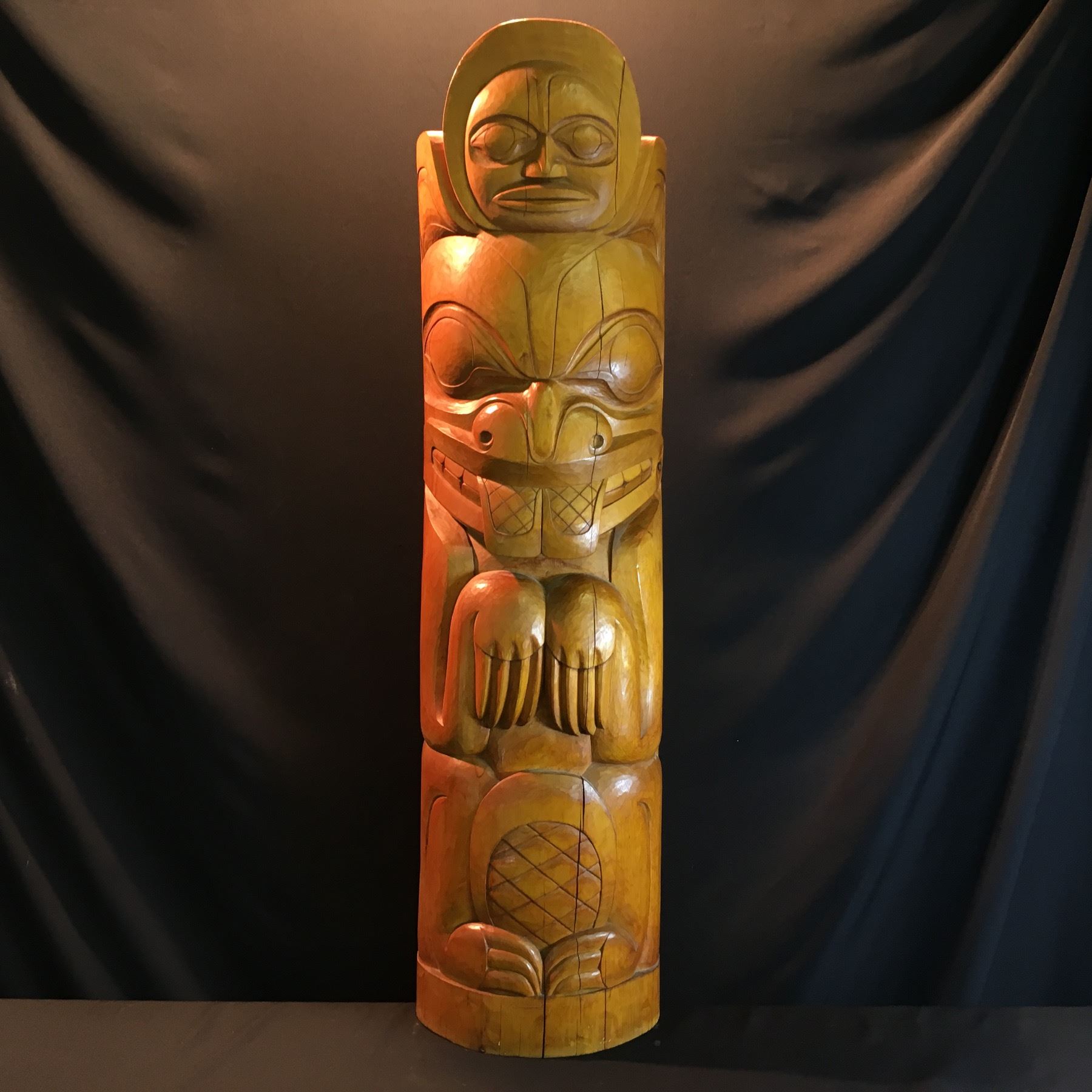 HAIDA GWAII ARTIST GARMEN MOODY HAND CARVED BEAVER MOON TOTEM POLE, 59.5'' TALL, C. 1970S, SIGNED BY ARTIST ON BACK