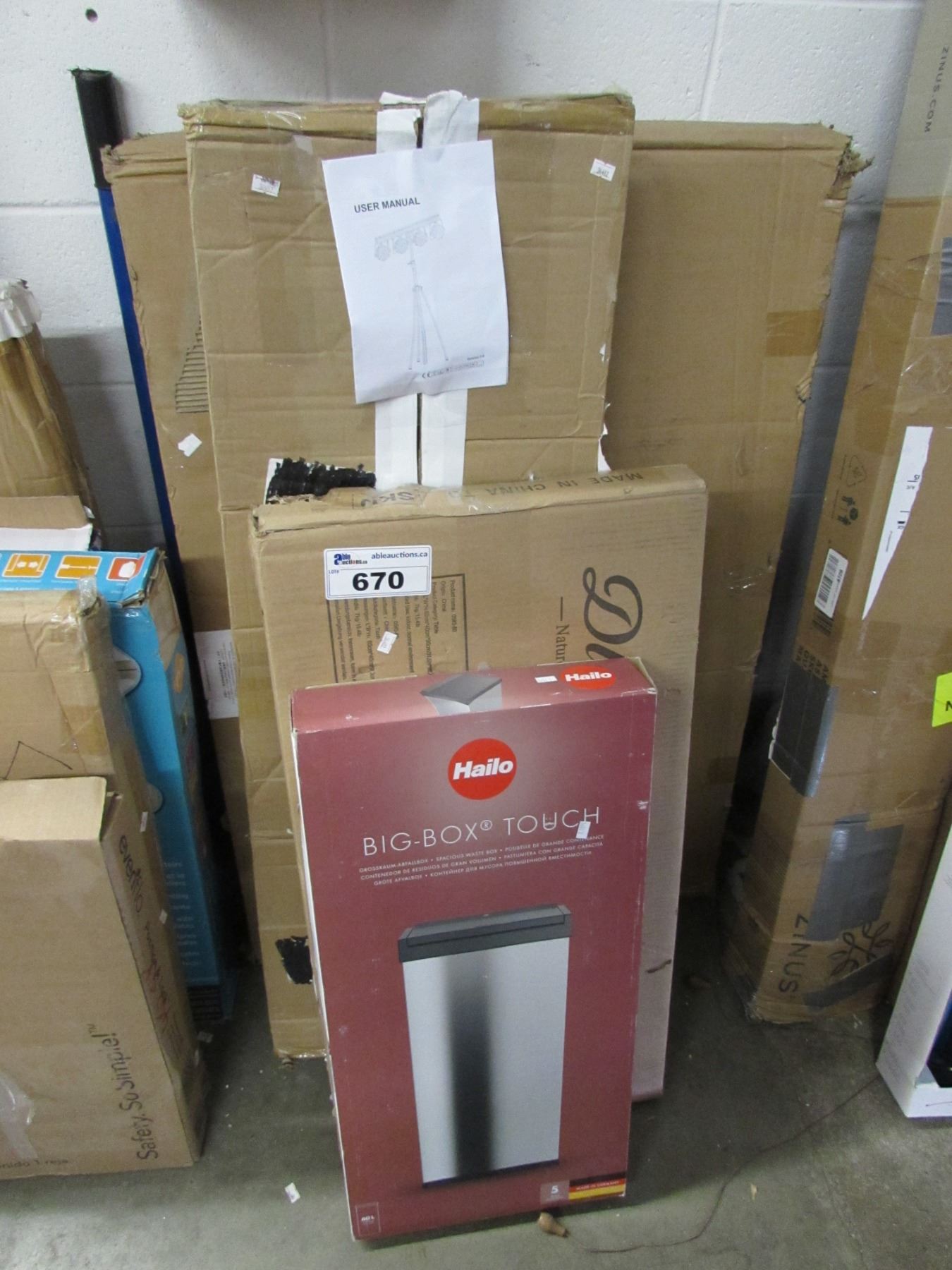 HAILO BIG BOX WASTE BOX, SMALL BED SIDE ROLLING TABLE, LIGHT TRIPOD, DOUBLE DOOR FOLDING METAL DOG