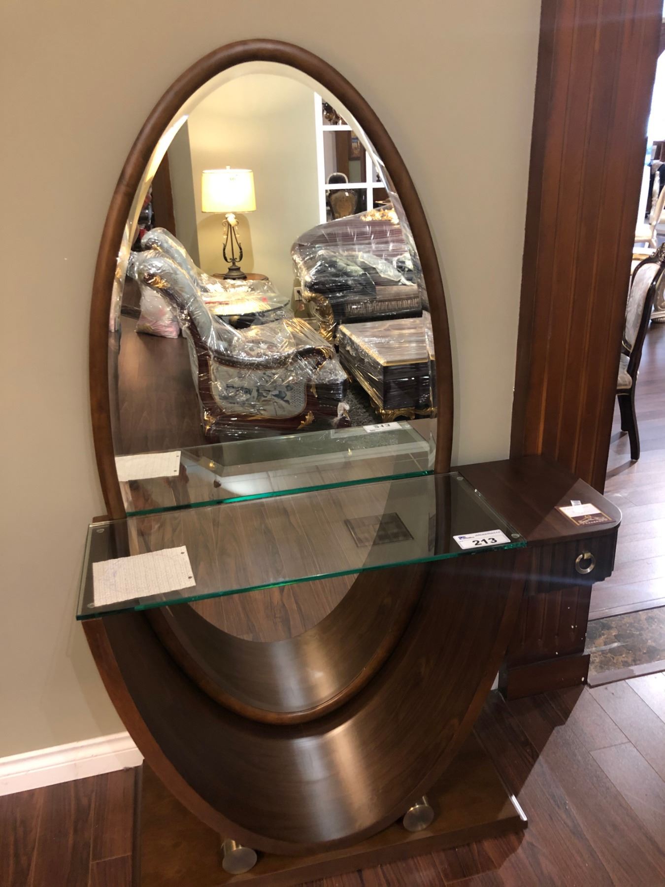 HALL TABLE WITH GLASS SHELF AND MIRROR. RETAIL $1,200.00