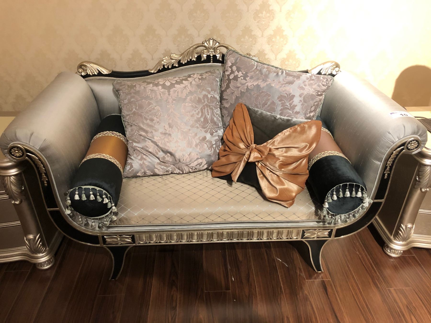 HALLWAY LOVE SEAT WITH FORMAL ACCENTS AND WOOD TRIM.