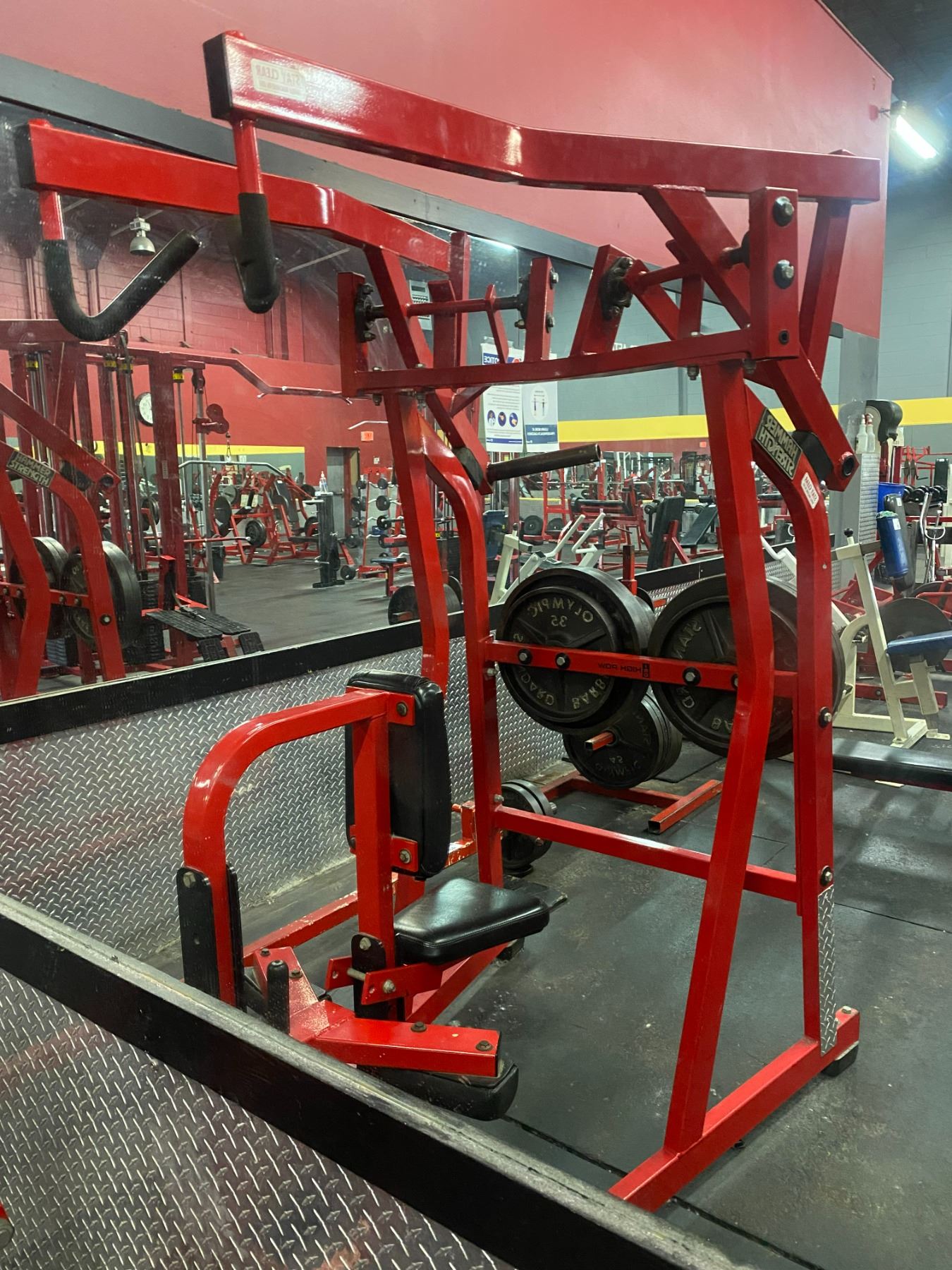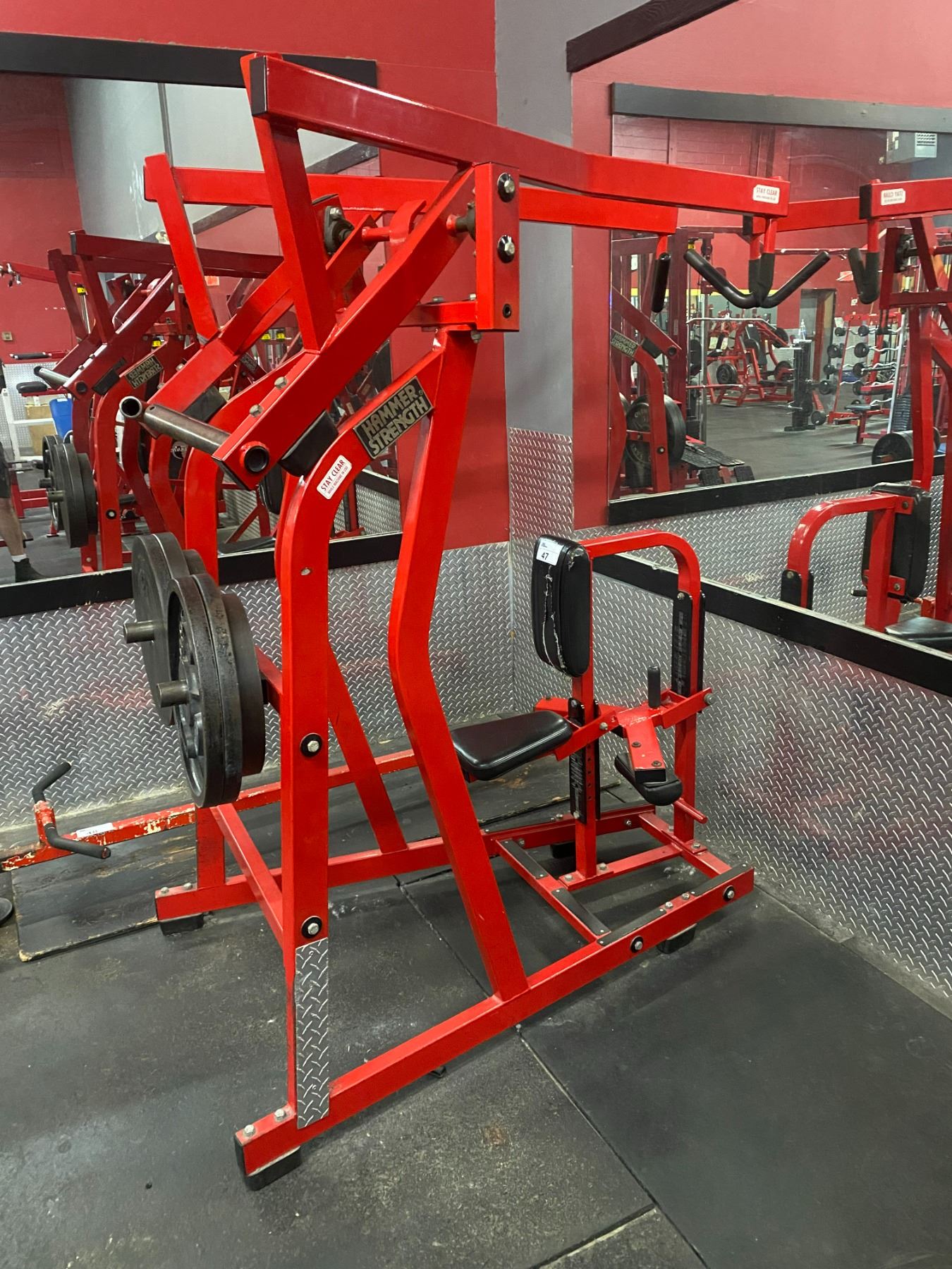HAMMER STRENGTH COMMERCIAL FREE WEIGHT HIGH ROW MACHINE WITH 4 - 45LBS PLATES AND 2 - 35LBS PLATES