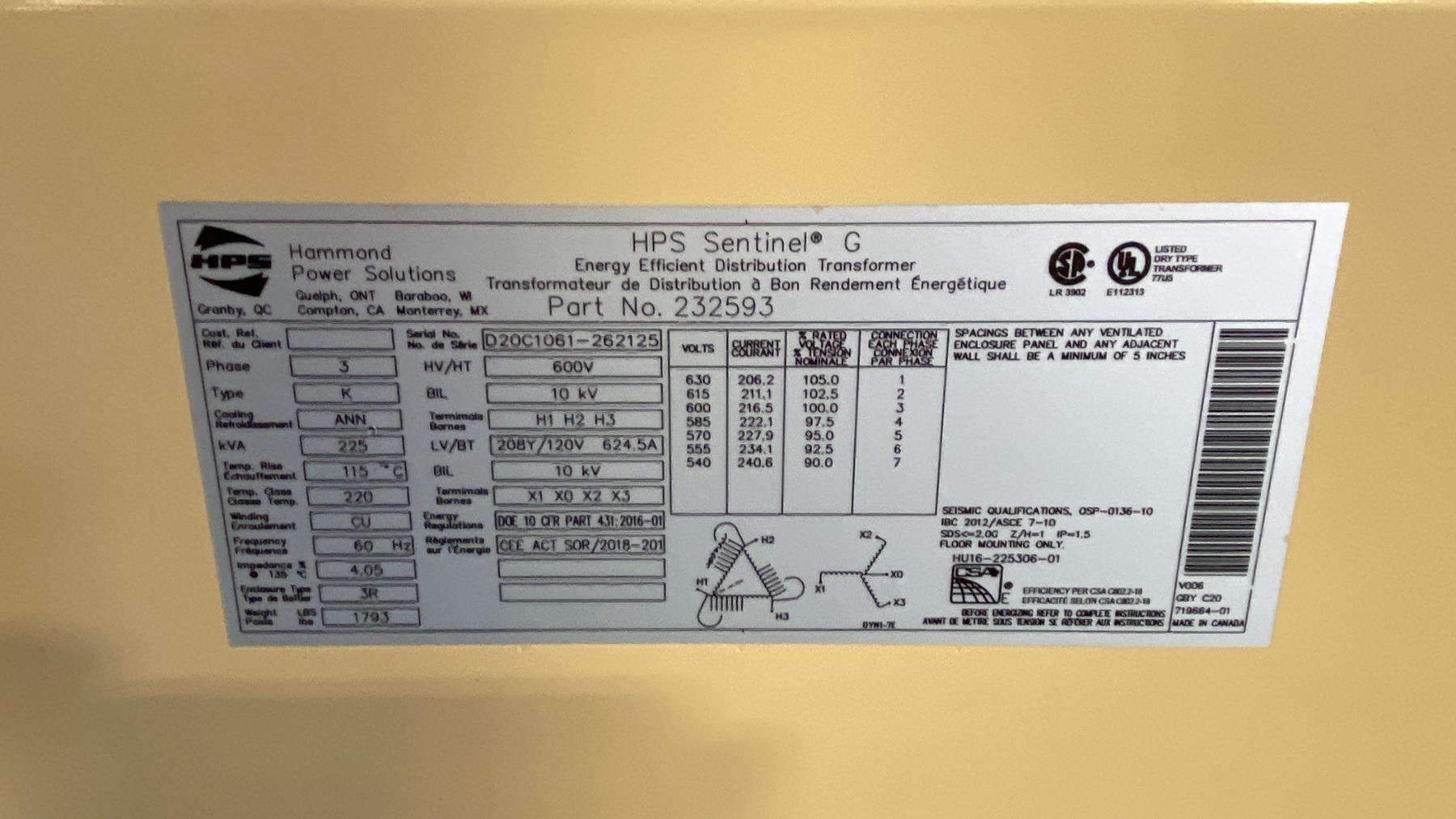 HAMMOND POWER SOLUTIONS SENTINEL ENERGY EFFICIENT TRANSFORMER APPROX 31"W X 29"D X 45"H