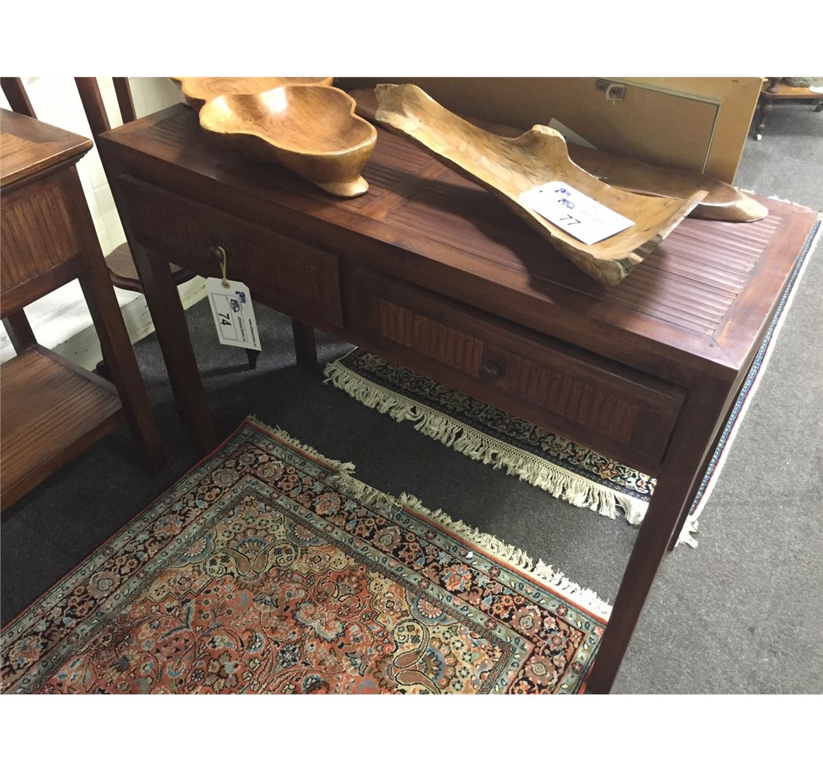 HAND BUILT TEAK TWO DRAWER CONSOLE TABLE 39" W X 29" H X 16" D