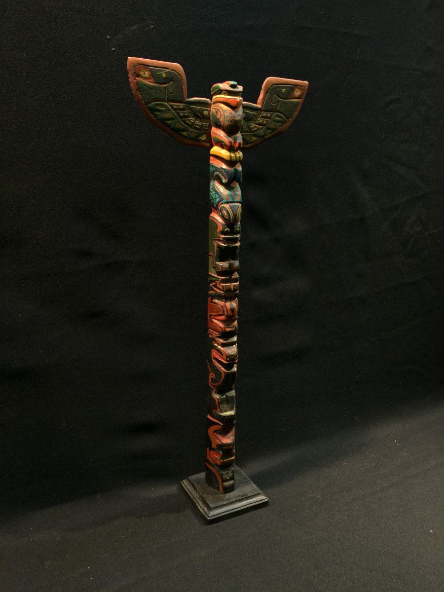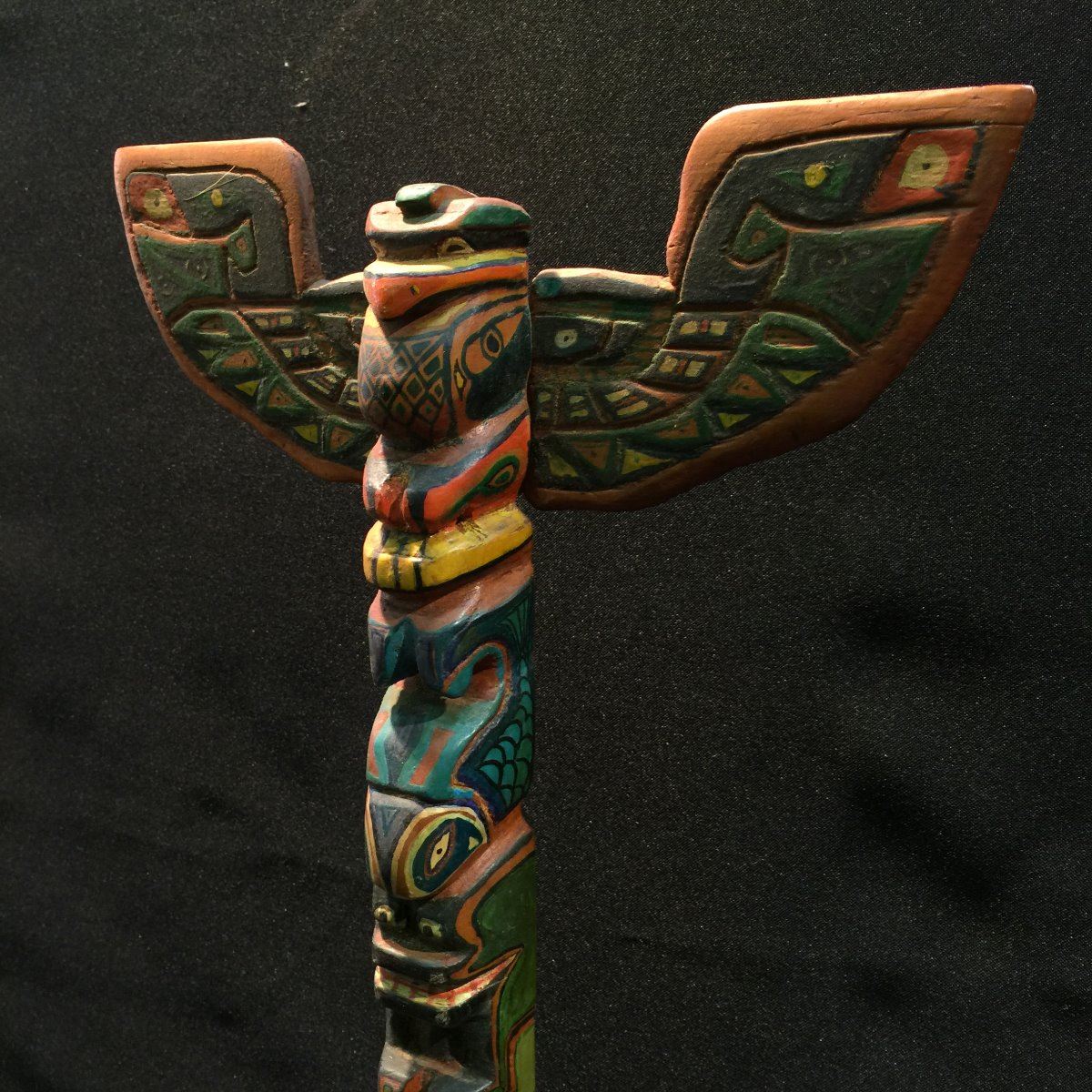 HAND CARVED AND PAINTED, 6 FIGURE TOTEM POLE OF THUNDERBIRD, SALMON, BEAR, MAN, WOLF AND WARRIOR,