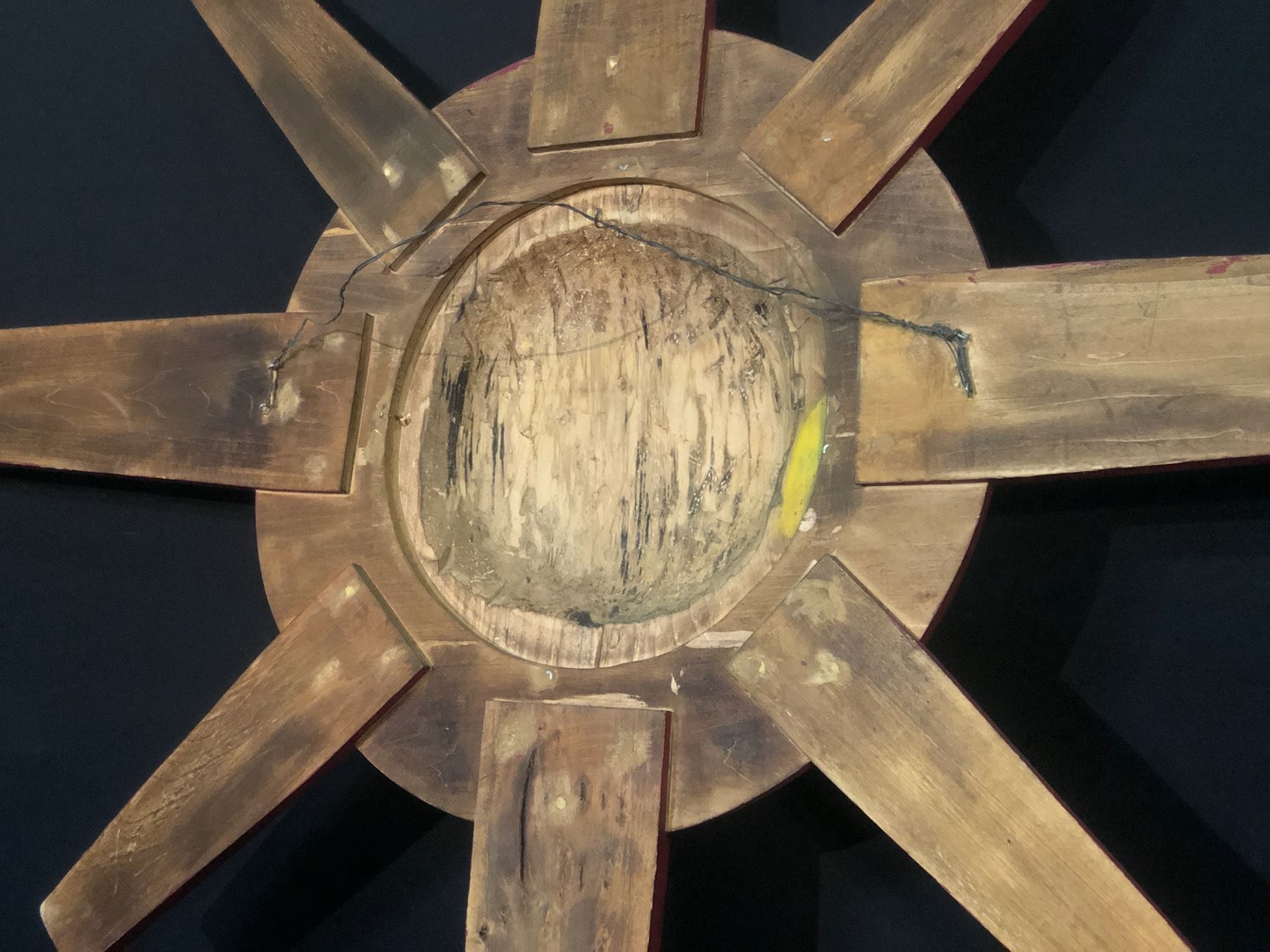 HAND CARVED AND PAINTED 8 RAY SUN MASK WITH COPPER INLAY, BC NATIVE, TOP RAY HAS HANDWRITTEN MEMO/NOTE, 62" TALL