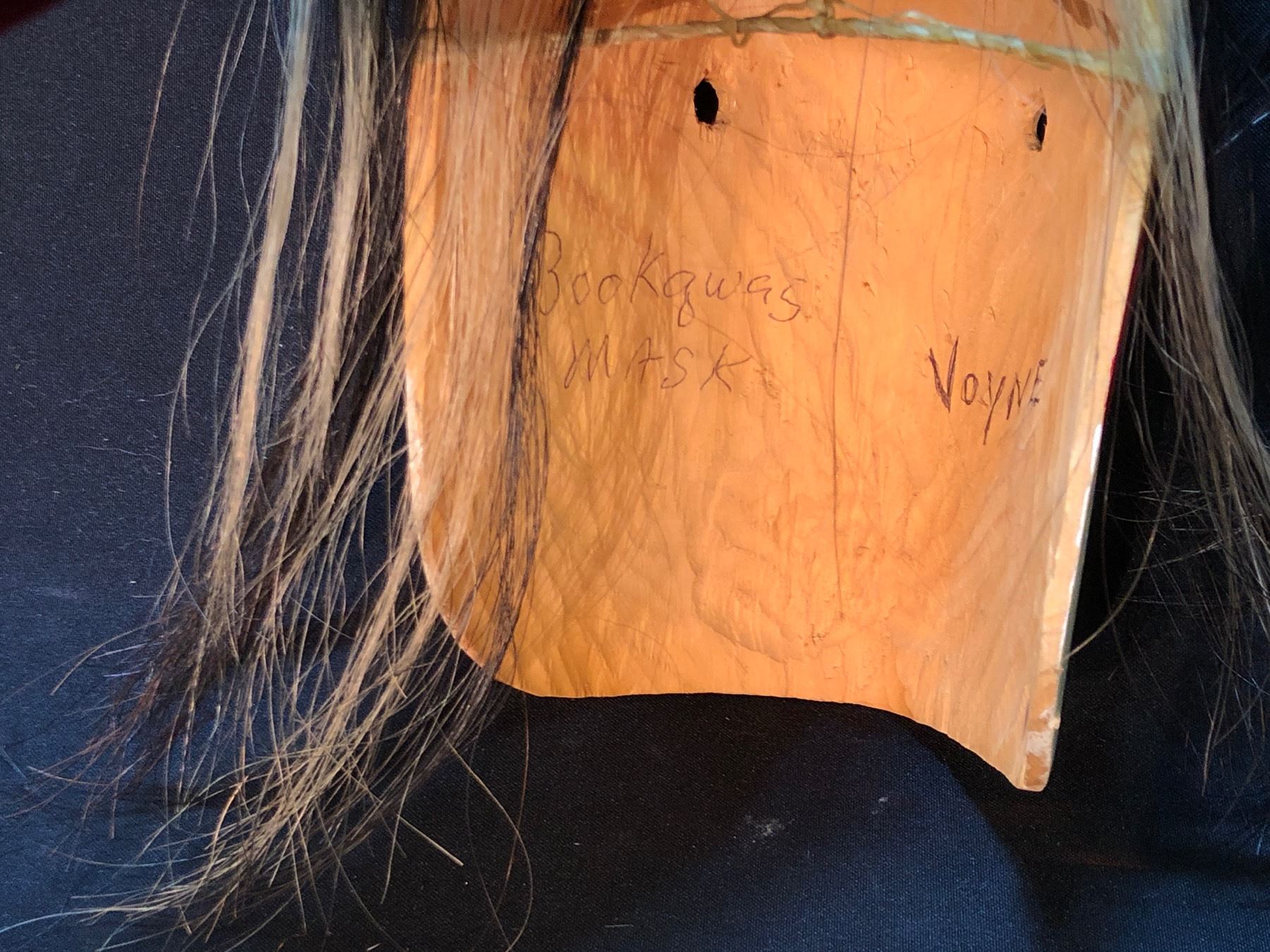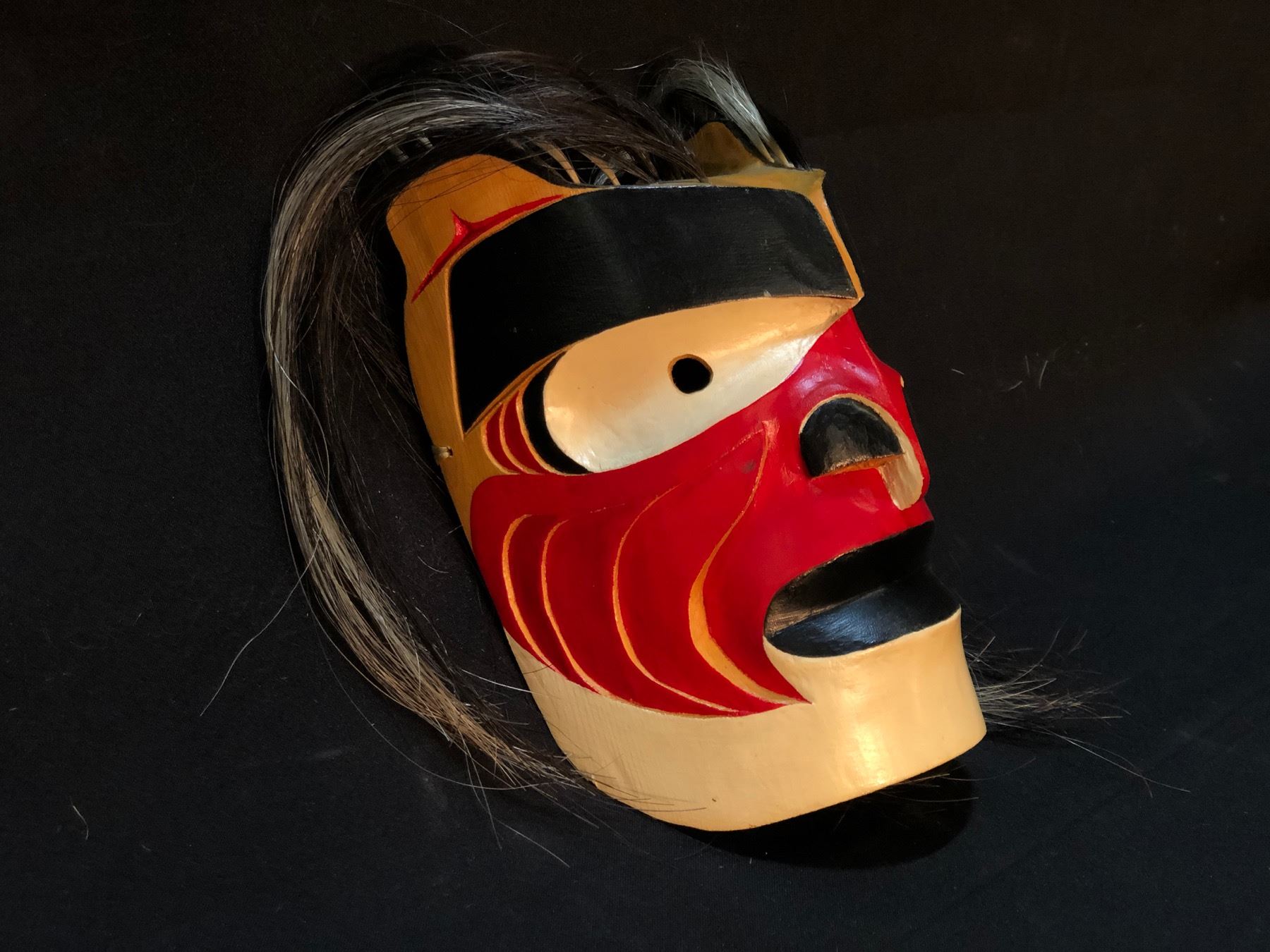 HAND CARVED AND PAINTED "BOOKGWAS" FIRST NATION MASK, BY VOYNE, WITH HORSE HAIR ACCENTS, APPROX. 9'' TALL