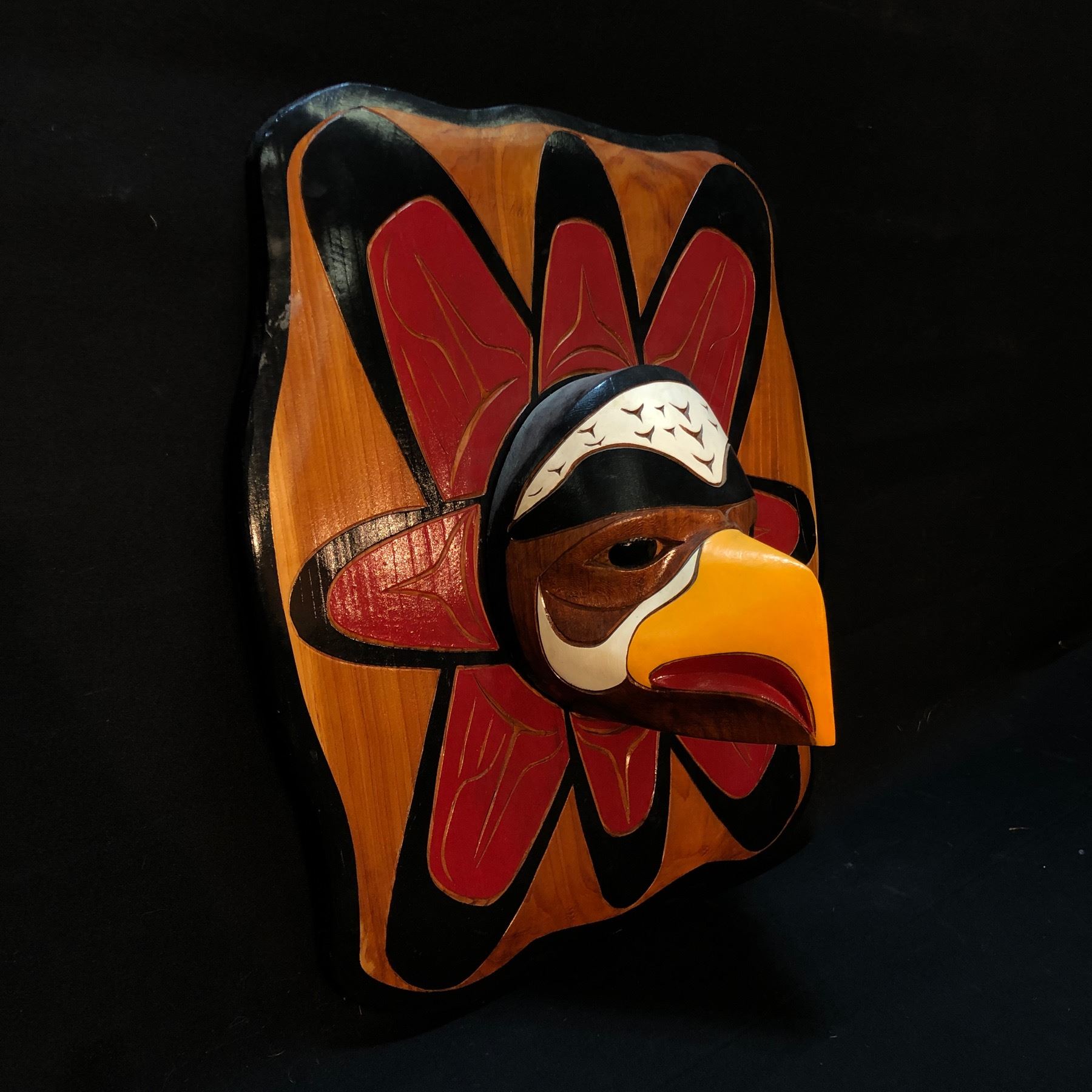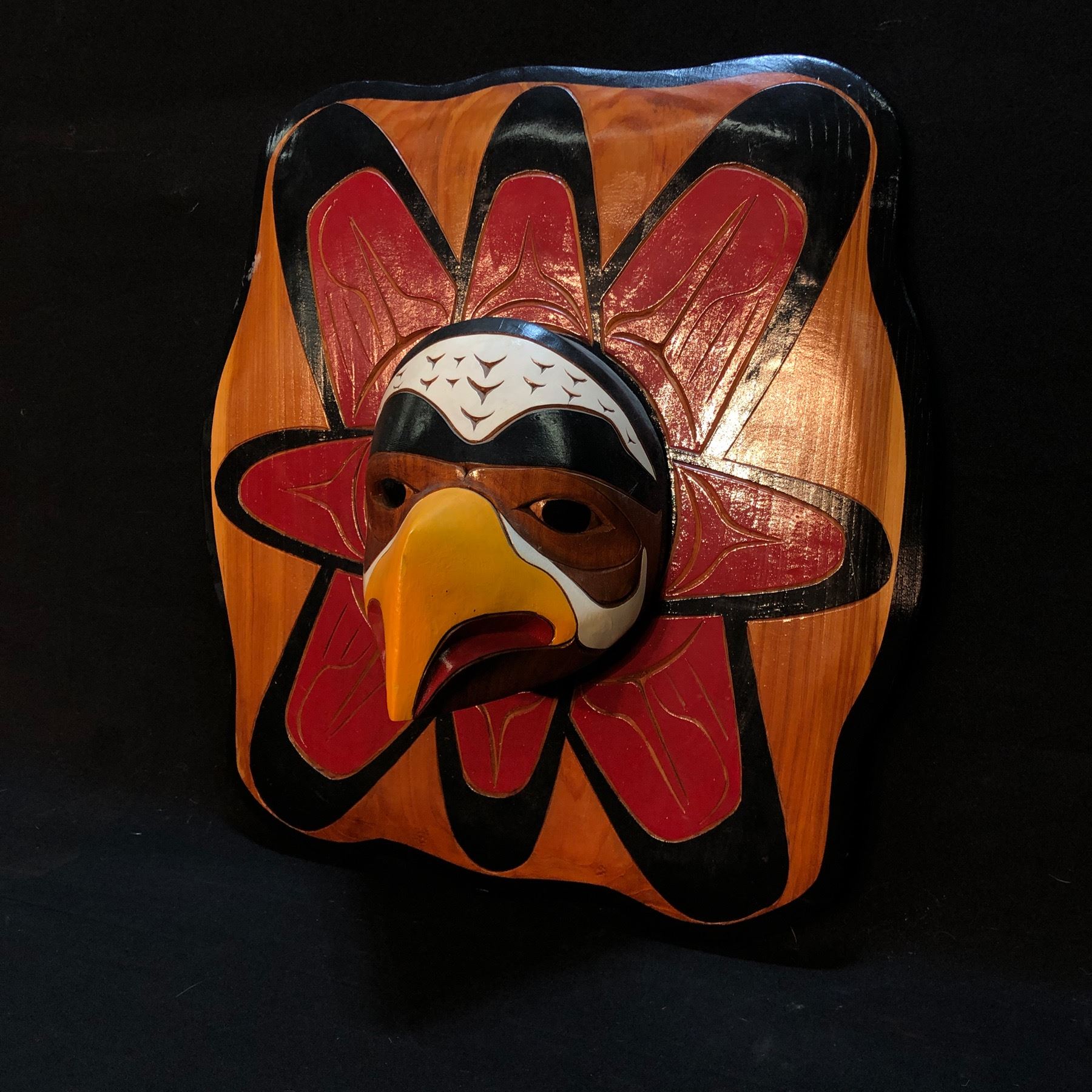 HAND CARVED AND PAINTED EAGLE AND SUN PANEL MASK, ARTIST UNKNOWN, DATED 1998, APPROX. 22'' TALL