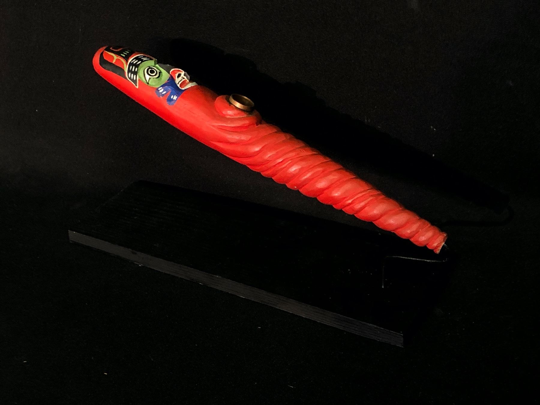 HAND CARVED AND PAINTED FIRST NATIONS PIPE WITH COPPER FITTING AND STAND, BIRD DESIGN, POSSIBLY FROM ALERT BAY, C. 1990S, 11" LONG