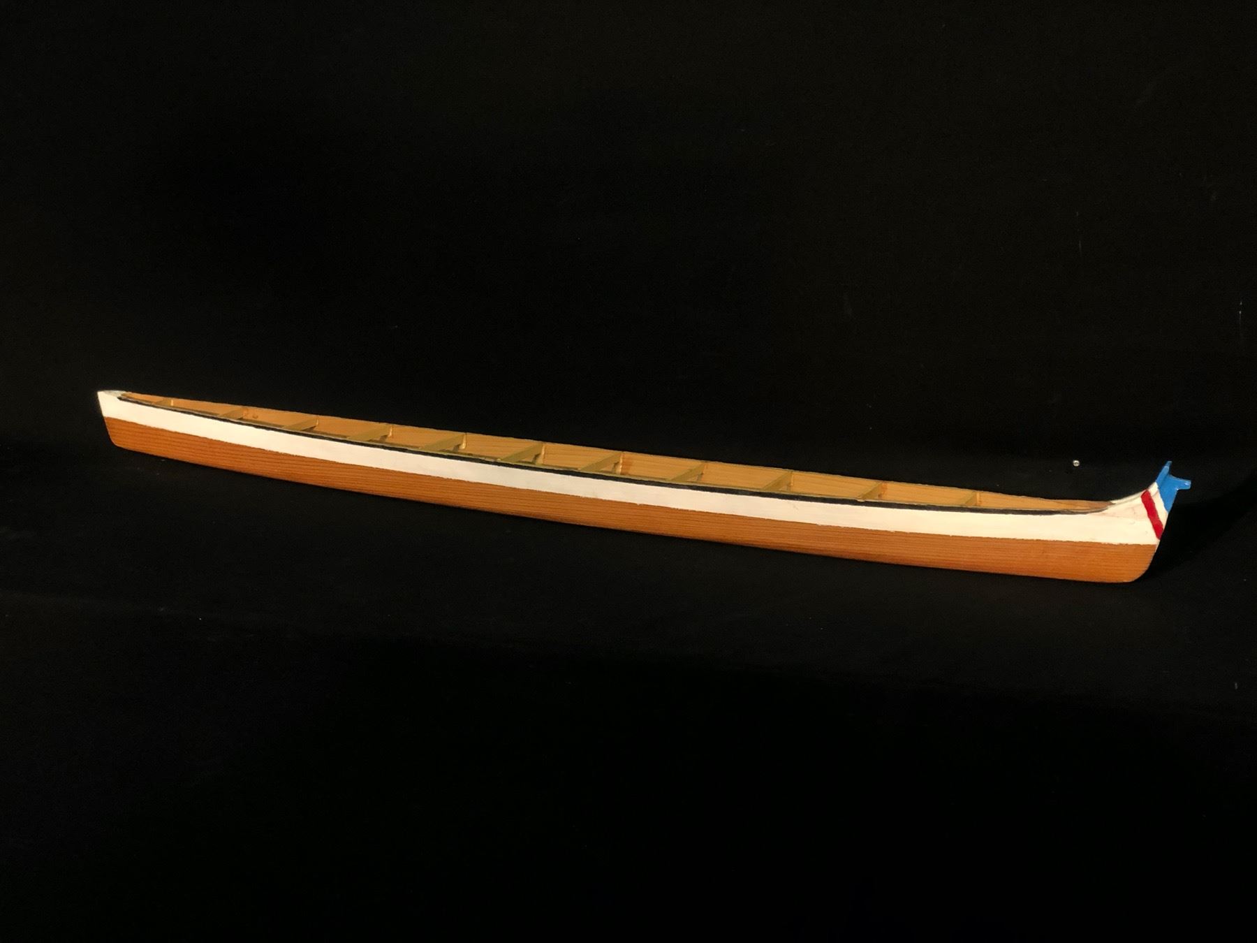 HAND CARVED AND PAINTED NUU-CHAH-NULTH MODEL RACING CANOE, 46.5" LONG