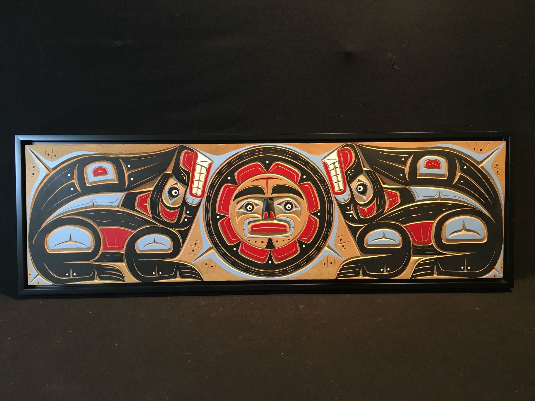 HAND CARVED AND PAINTED PANEL BY LAWRENCE SCOW, DEPICTING TWO WOLVES AND THE MOON, 40'' WIDE NOT INCLUDING FRAME
