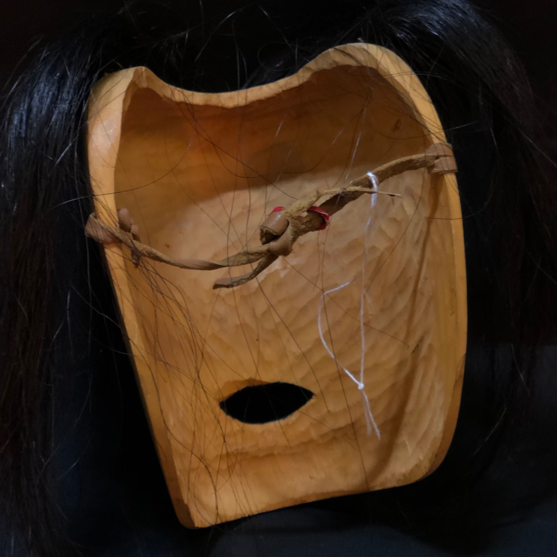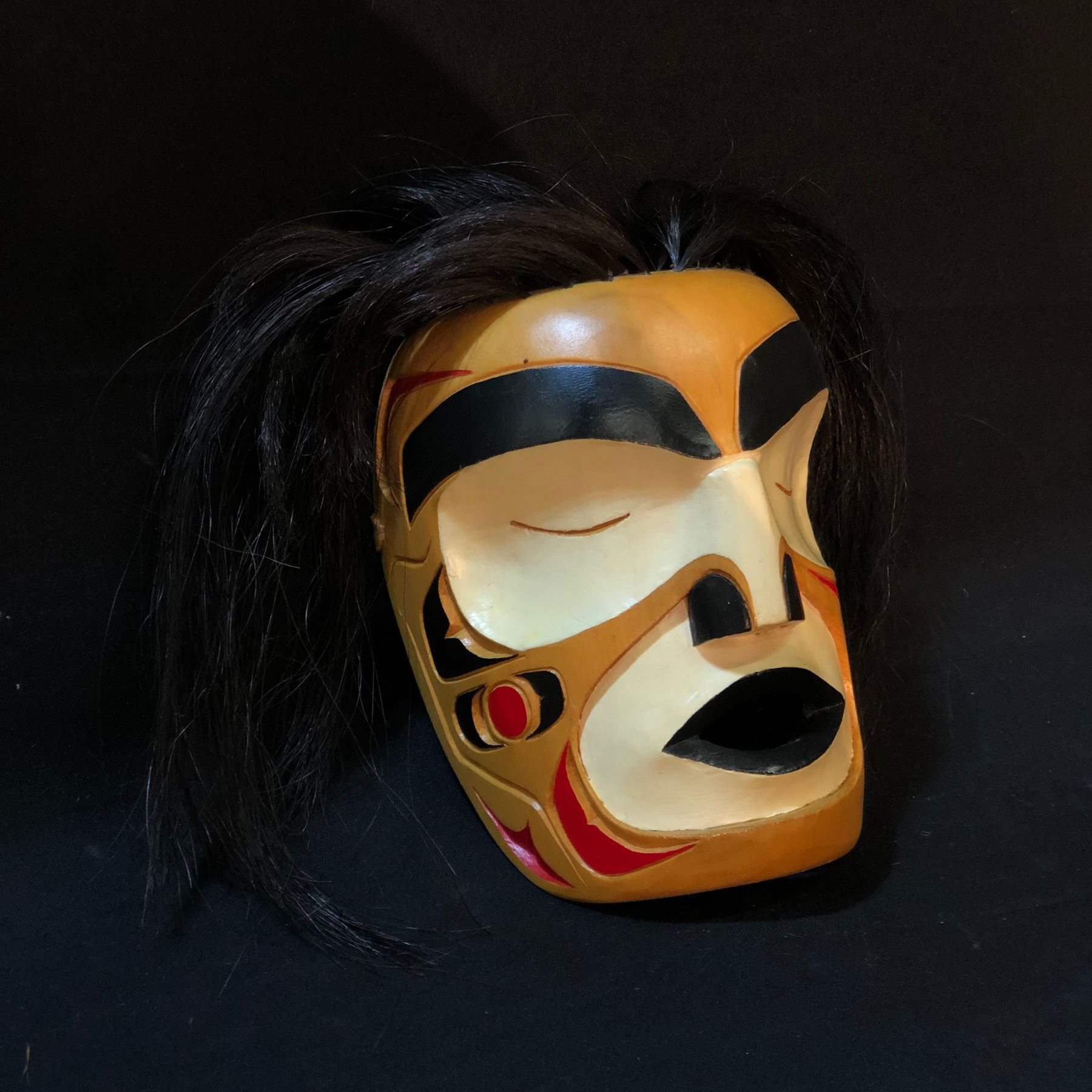 HAND CARVED AND PAINTED SLEEPING MAN FIRST NATIONS MASK, WITH HORSE HAIR ACCENTS, ARTIST UNKNOWN, APPROX. 8.5'' TALL