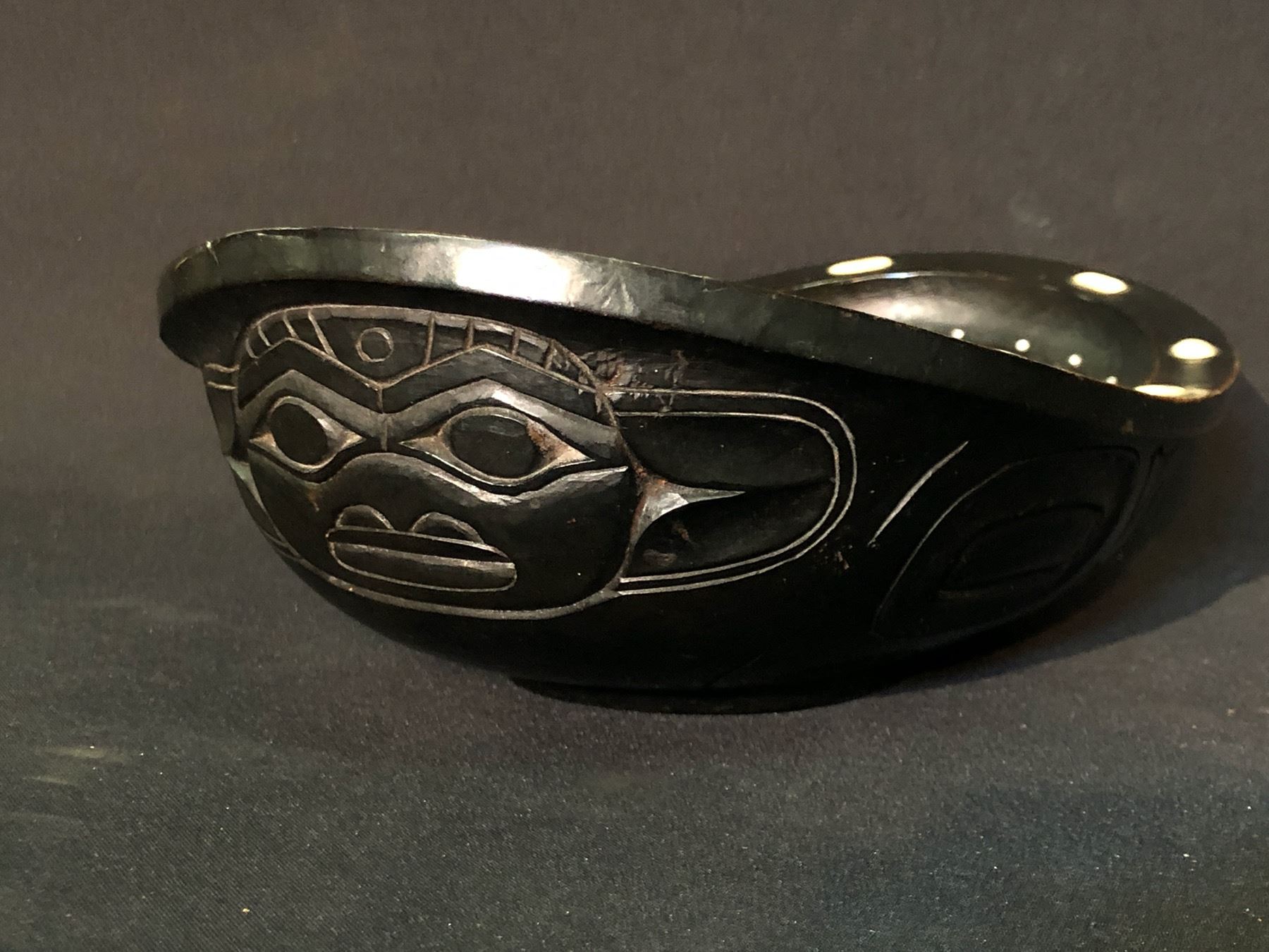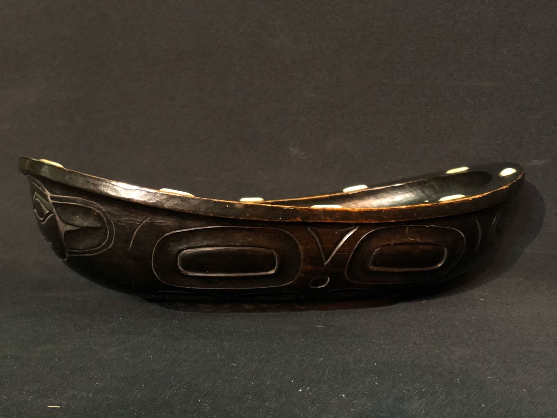 HAND CARVED AND PAINTED TLINGIT FROG BOWL, C. 1800'S, WITH SHELL ACCENTS, 14'' LONG