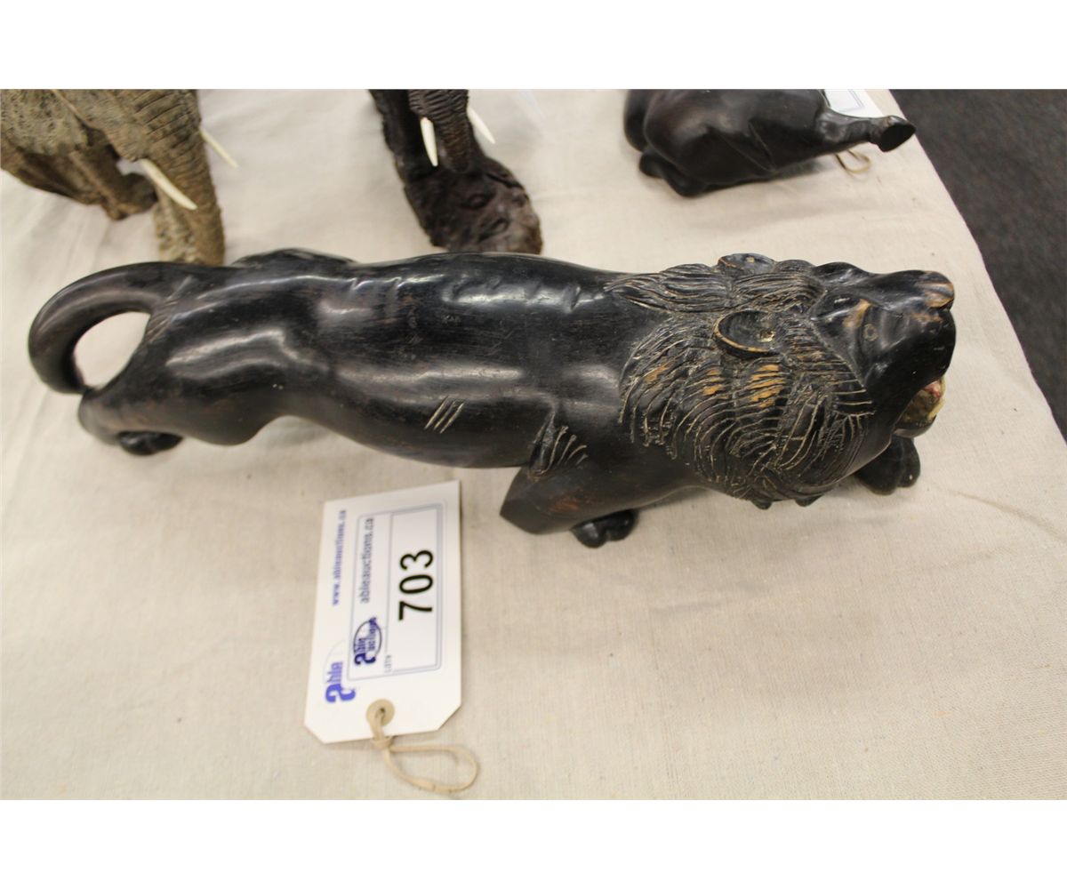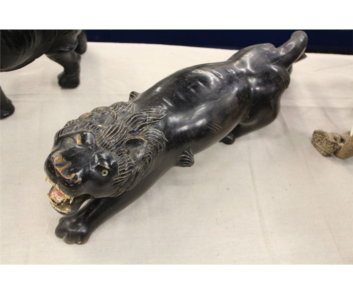 HAND CARVED EBONY LION W/ BONE TEETH, 20'' L